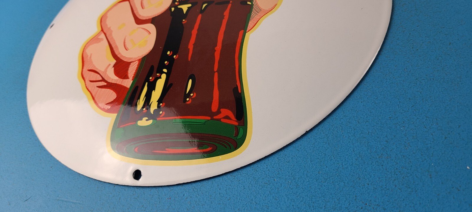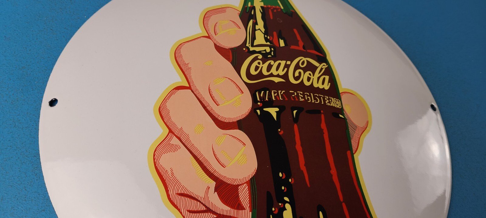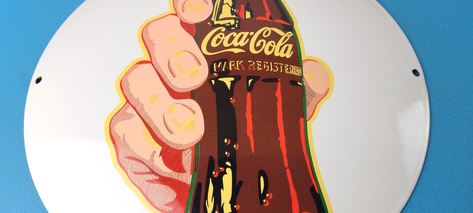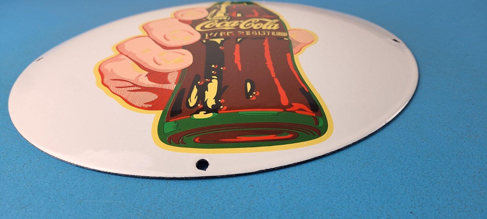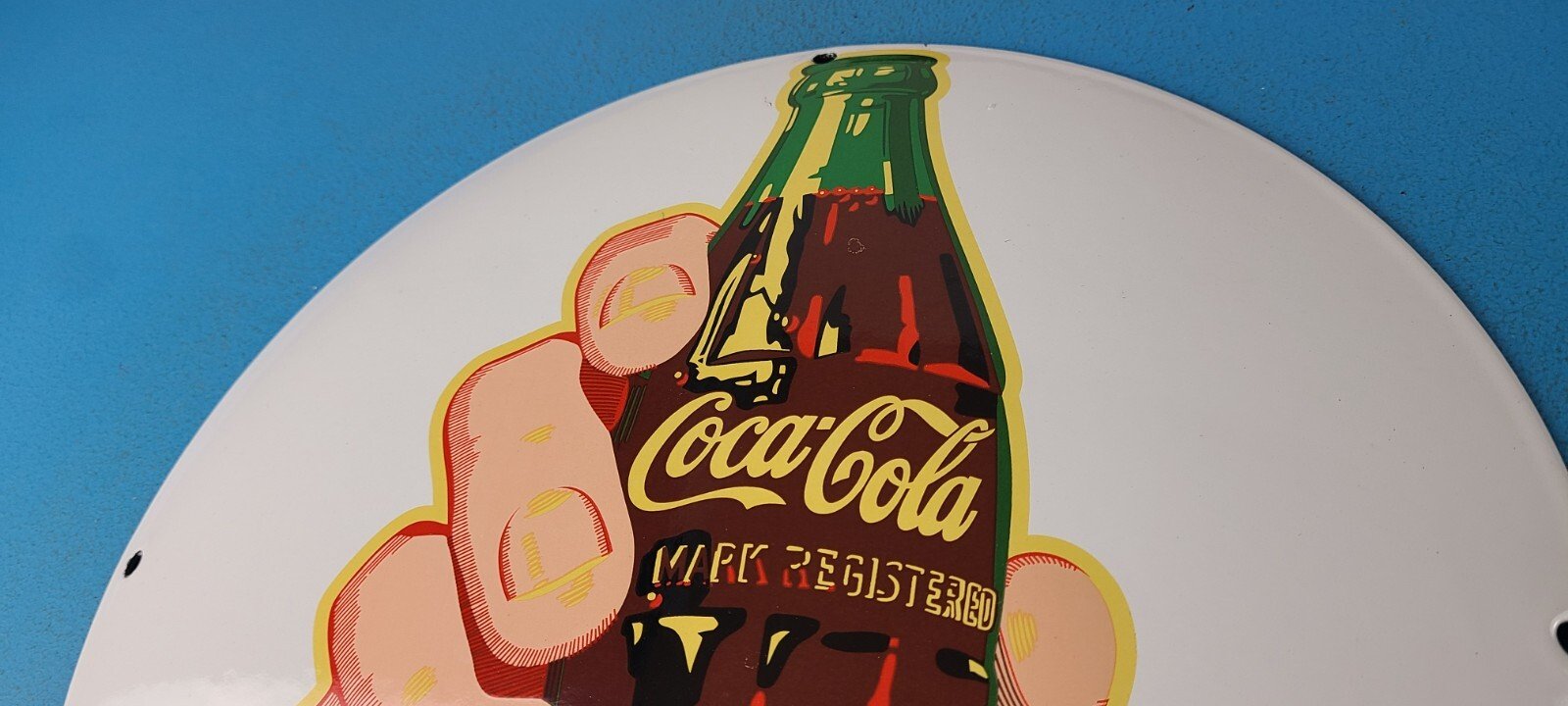 This vintage Coca Cola brand porcelain sign is a true gem for any collector of soda memorabilia. The sign features the iconic Coca Cola logo in a vibrant color scheme, making it a perfect addition to any soda-themed decor.