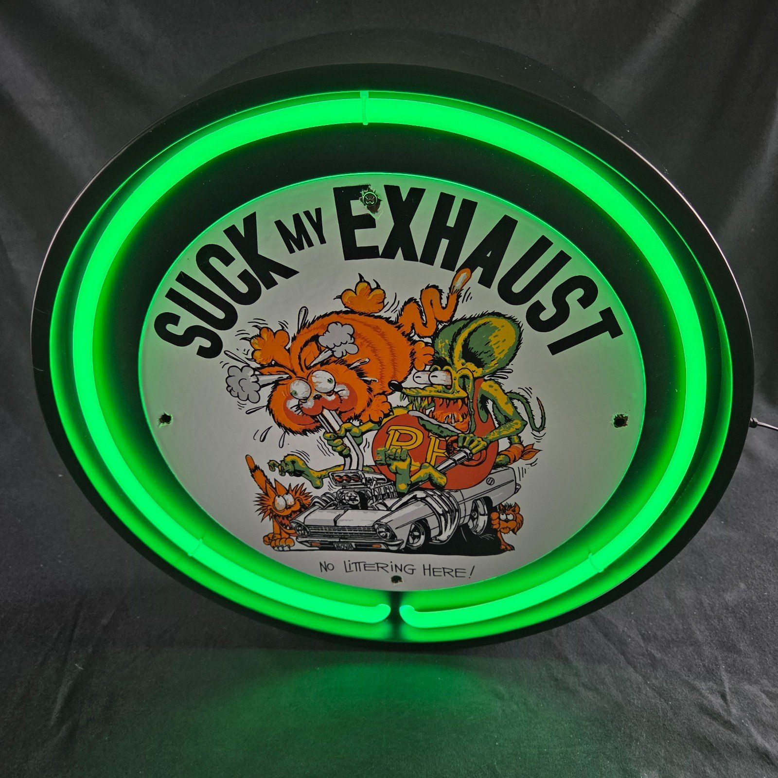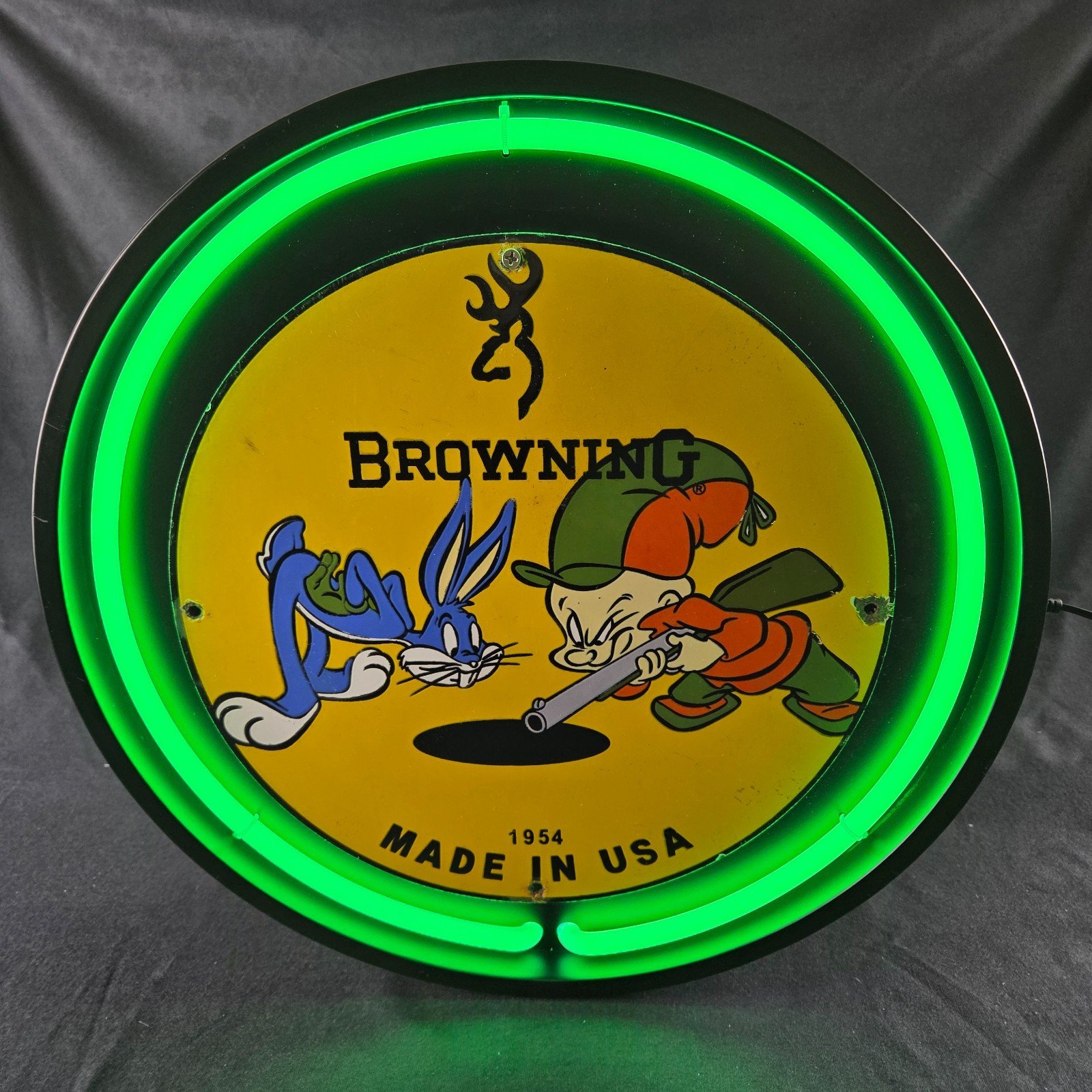 This auction is for the neon can and glass tube only – the porcelain signs shown in the photos are just examples of what it can look like. No signs or mounting screws are included. The Rat Fink, Browning Firearms and the Sherwin Goofy signs are only to show how great this Neon display looks!