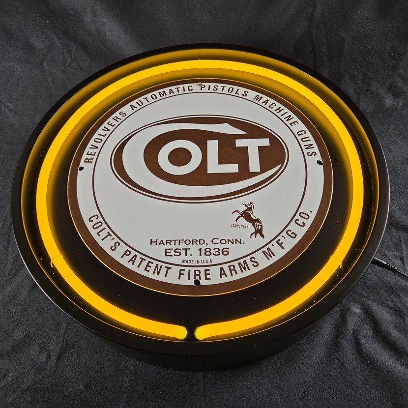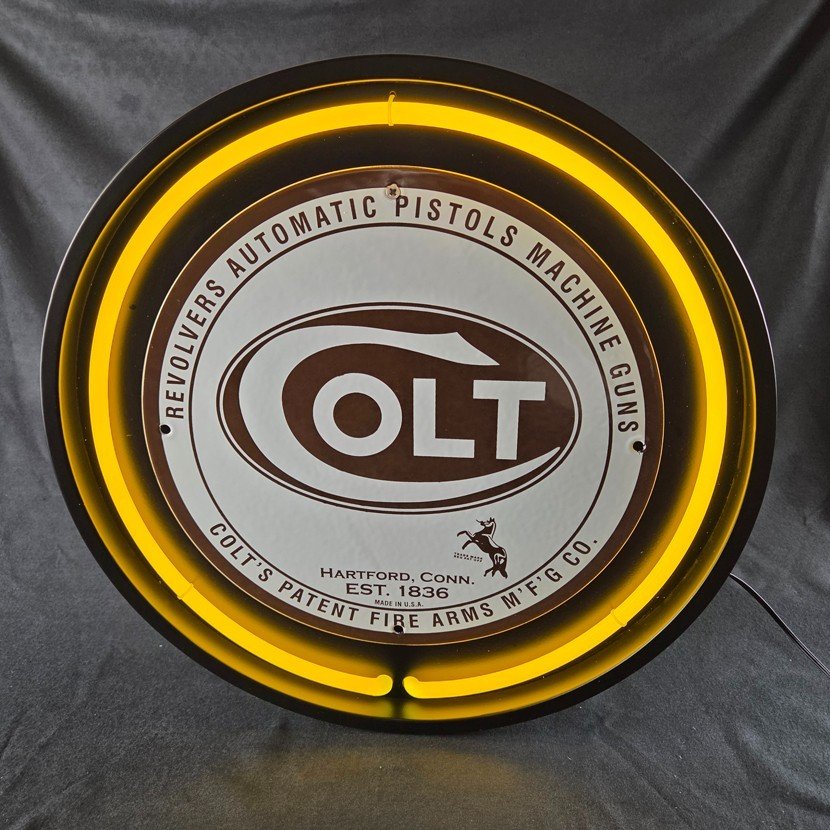 This auction is for the neon can and glass tube only – the porcelain signs shown in the photos are just examples of what it can look like. No signs or mounting screws are included. The Texaco pinup girl and the Colt Firearm signs are only to show how great this Neon display looks!