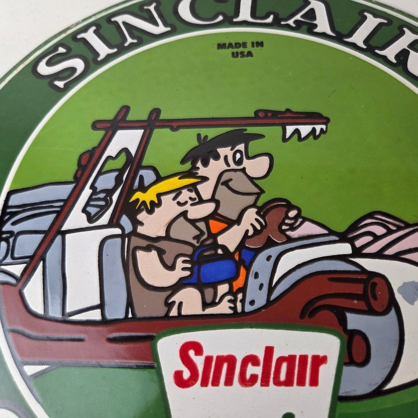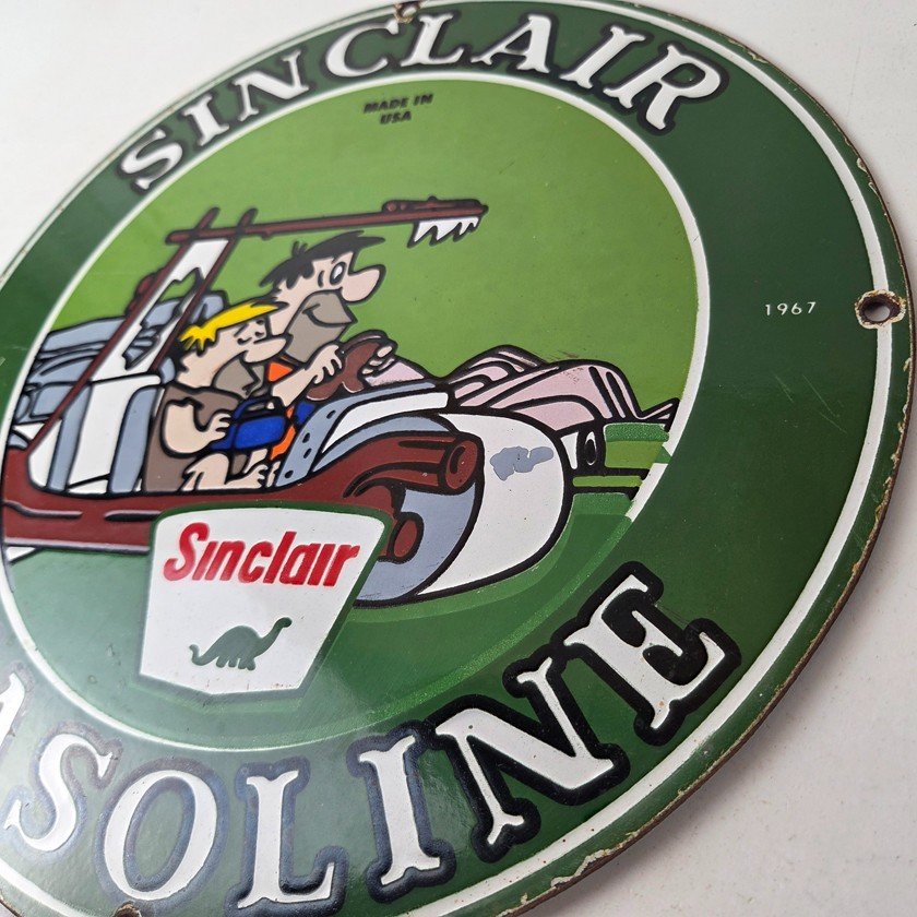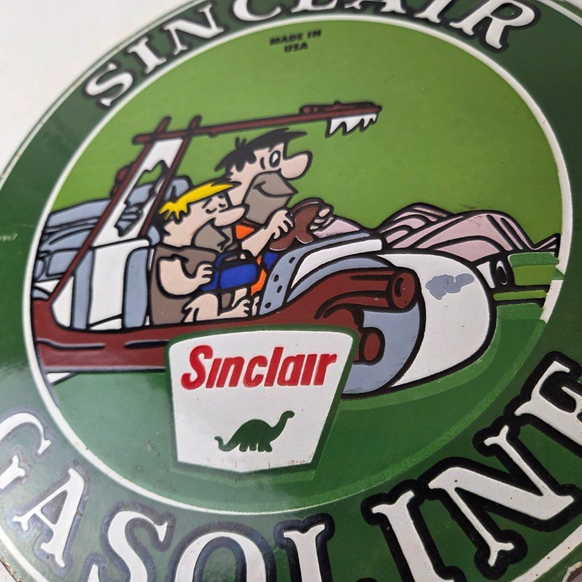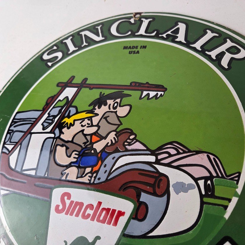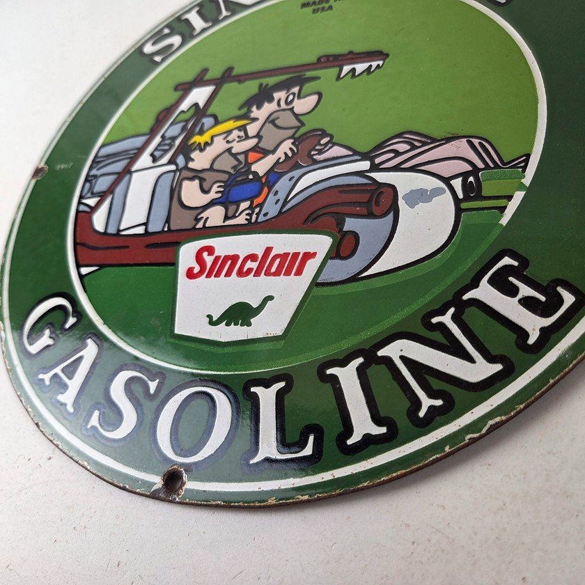 This vintage Sinclair Flintstones Dino sign makes a great addition to a garage, shop display, man cave, or any Sinclair memorabilia collection, vintage gas station advertising collection, Flintstones cartoon crossover collection, or petroliana collection.