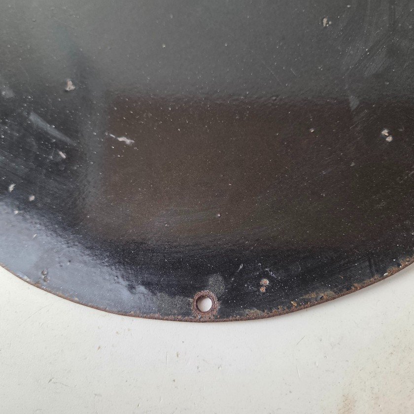 Made of porcelain enamel on steel with patina and wear: rust spotting around the mounting holes, minor edge chips, light surface scratches, and minimal discoloration. This is a porcelain enamel advertising sign in excellent condition, exactly as shown in the photos.