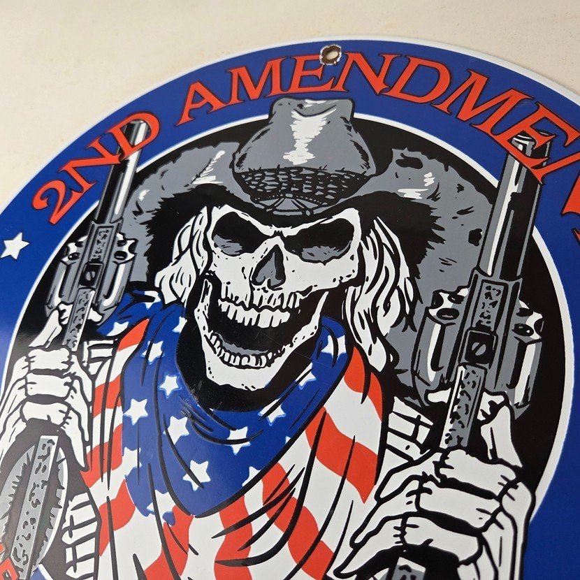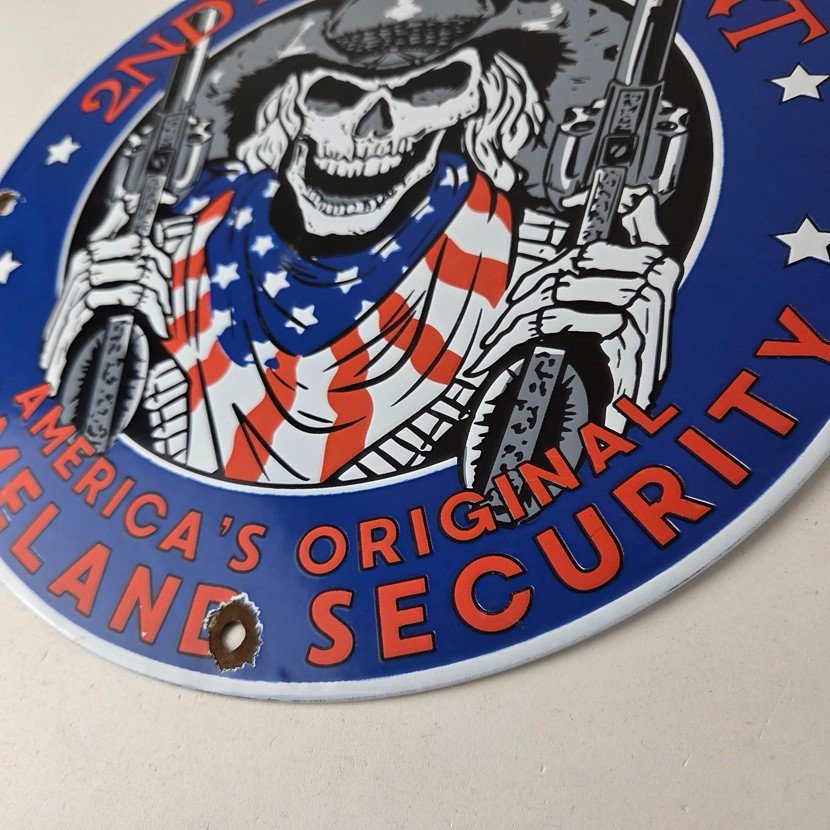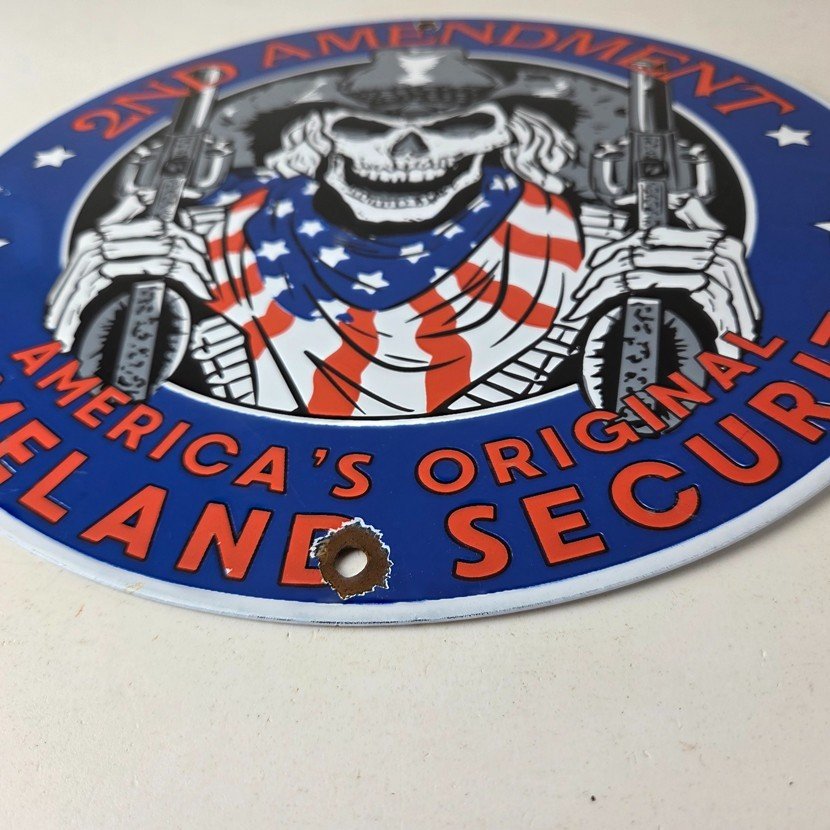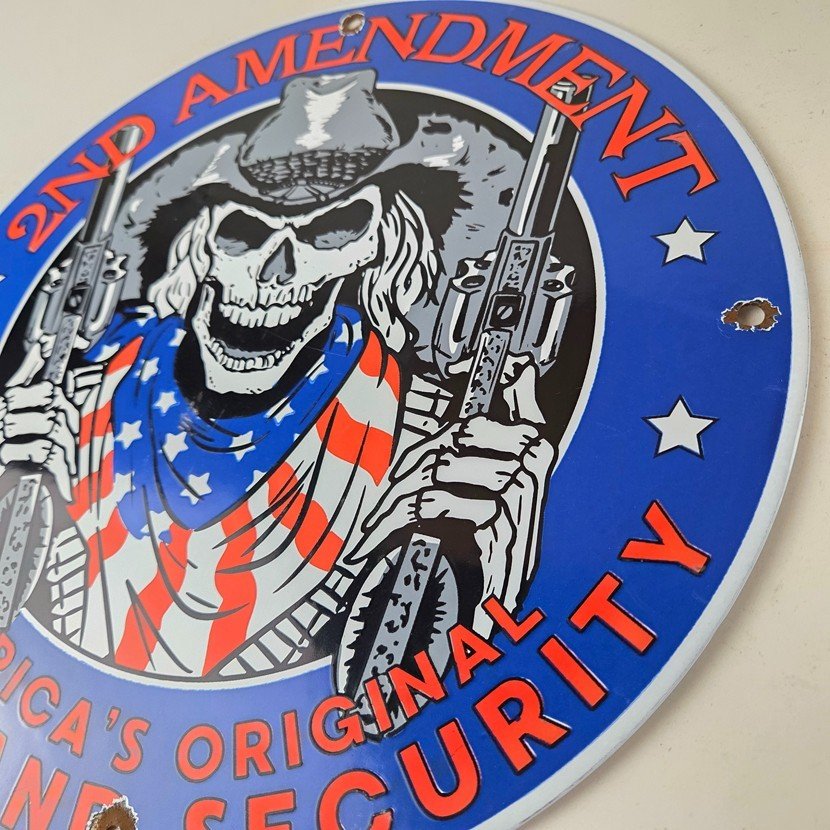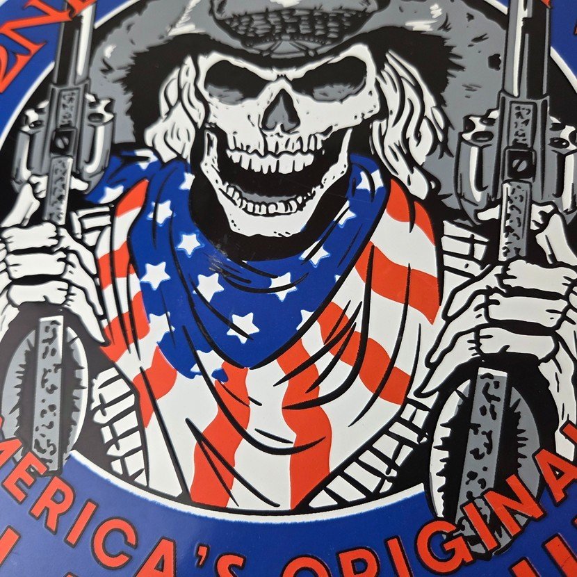 This vintage porcelain sign is a great addition to any gas and oil or advertising memorabilia collection. Measuring 11 3/4″, this sign features the iconic American flag graphic with the skull cowboy in the center. The Red, White & Blue color scheme adds a pop of color and has excellent porcelain & gloss.