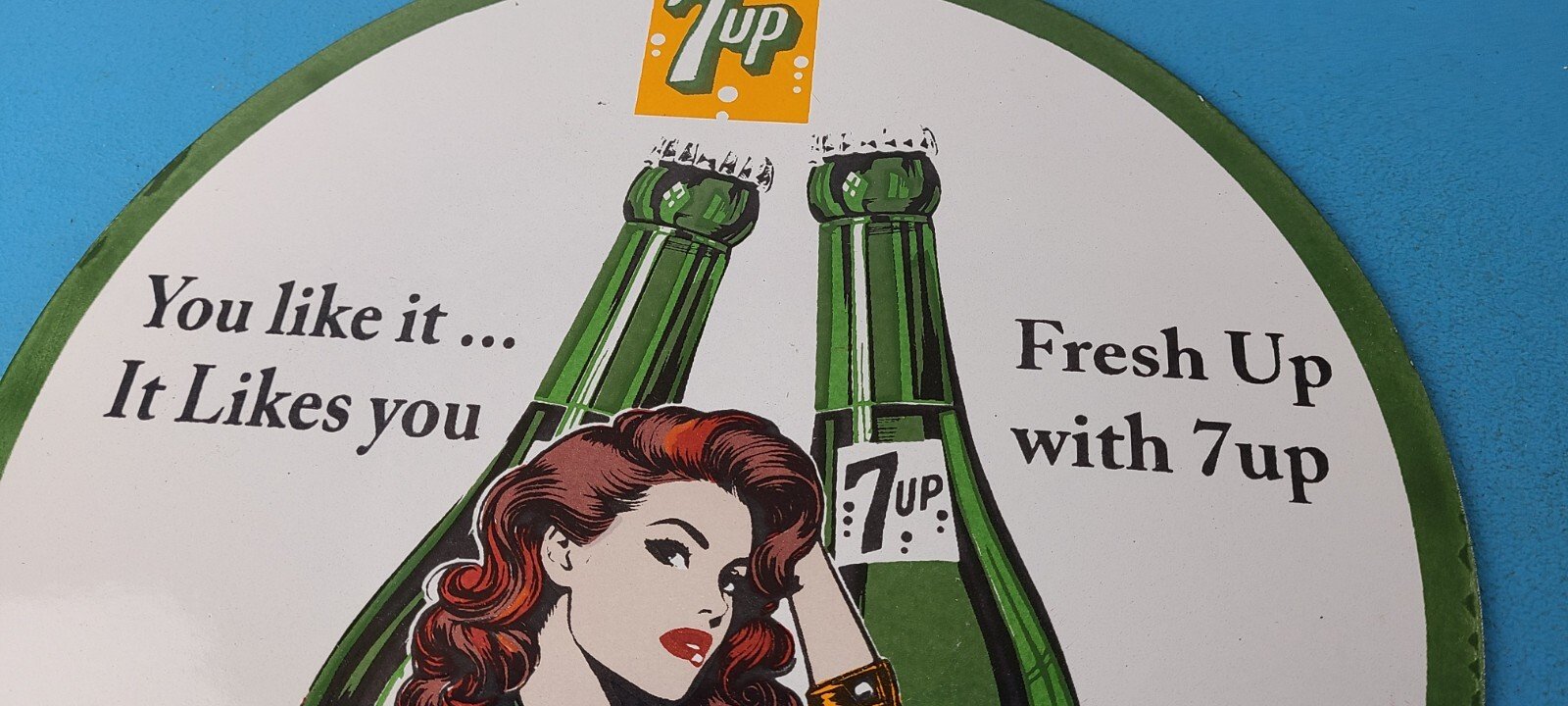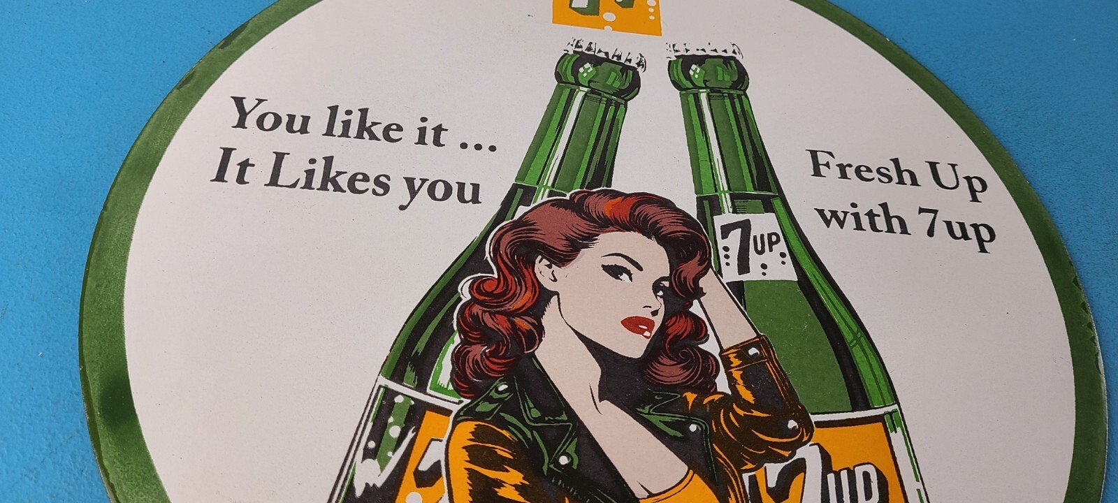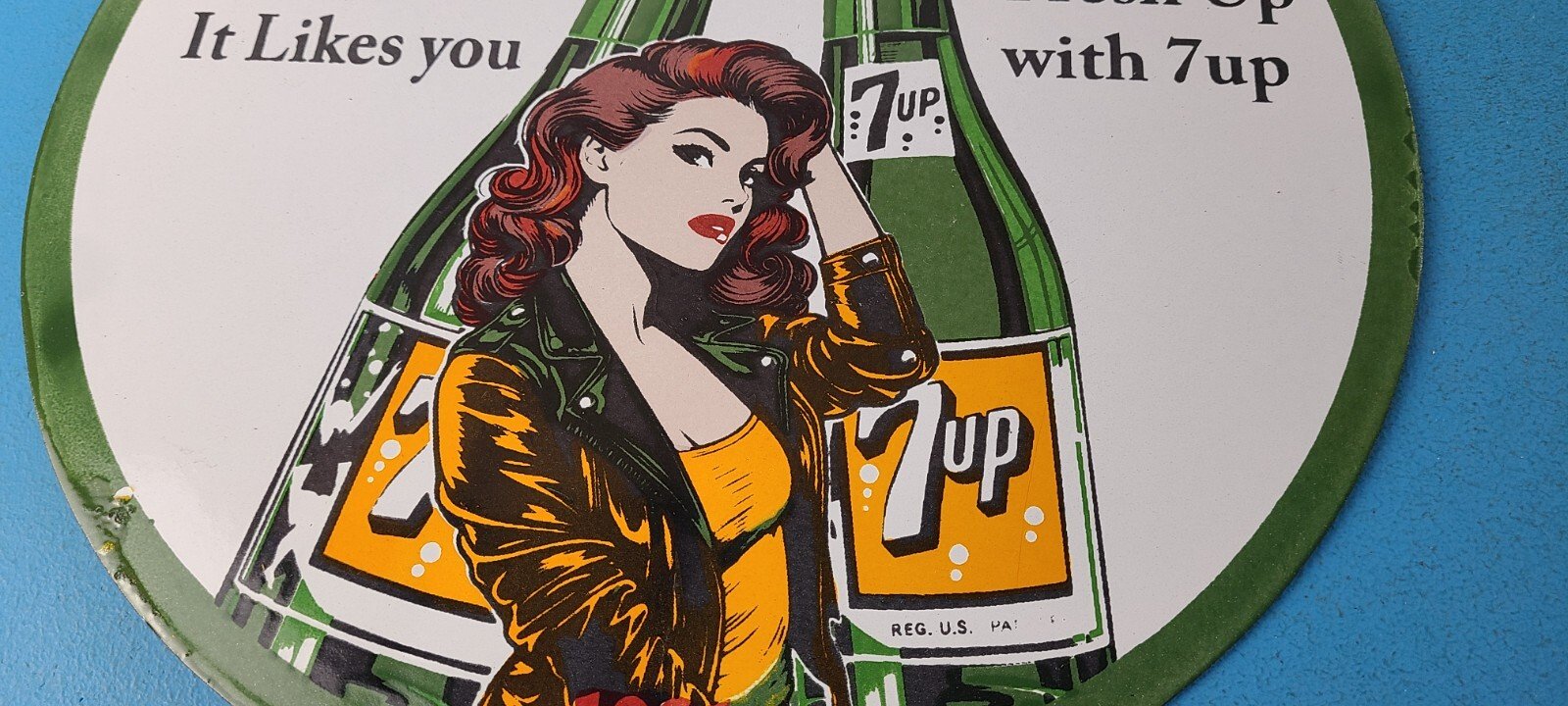 This is a vintage 7 Up Soda Porcelain sign measuring 12″. This sign is perfect for any soda or gas themed space. Made of porcelain on both sides, this sign features the pinup girl with two 7up glass bottles. This sign is perfect for collectors of all kinds, whether you’re a fan of pin-up girls or just love the vintage aesthetic. Display it in your home bar, game room, man cave, or garage.