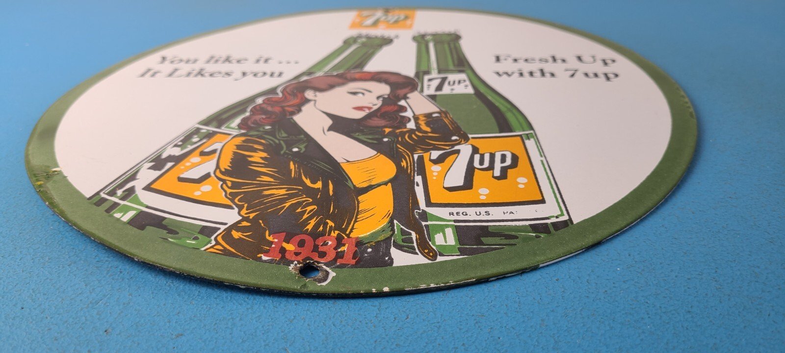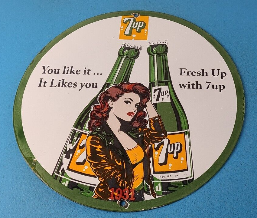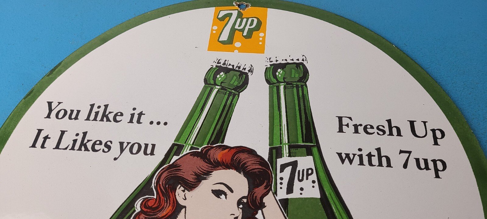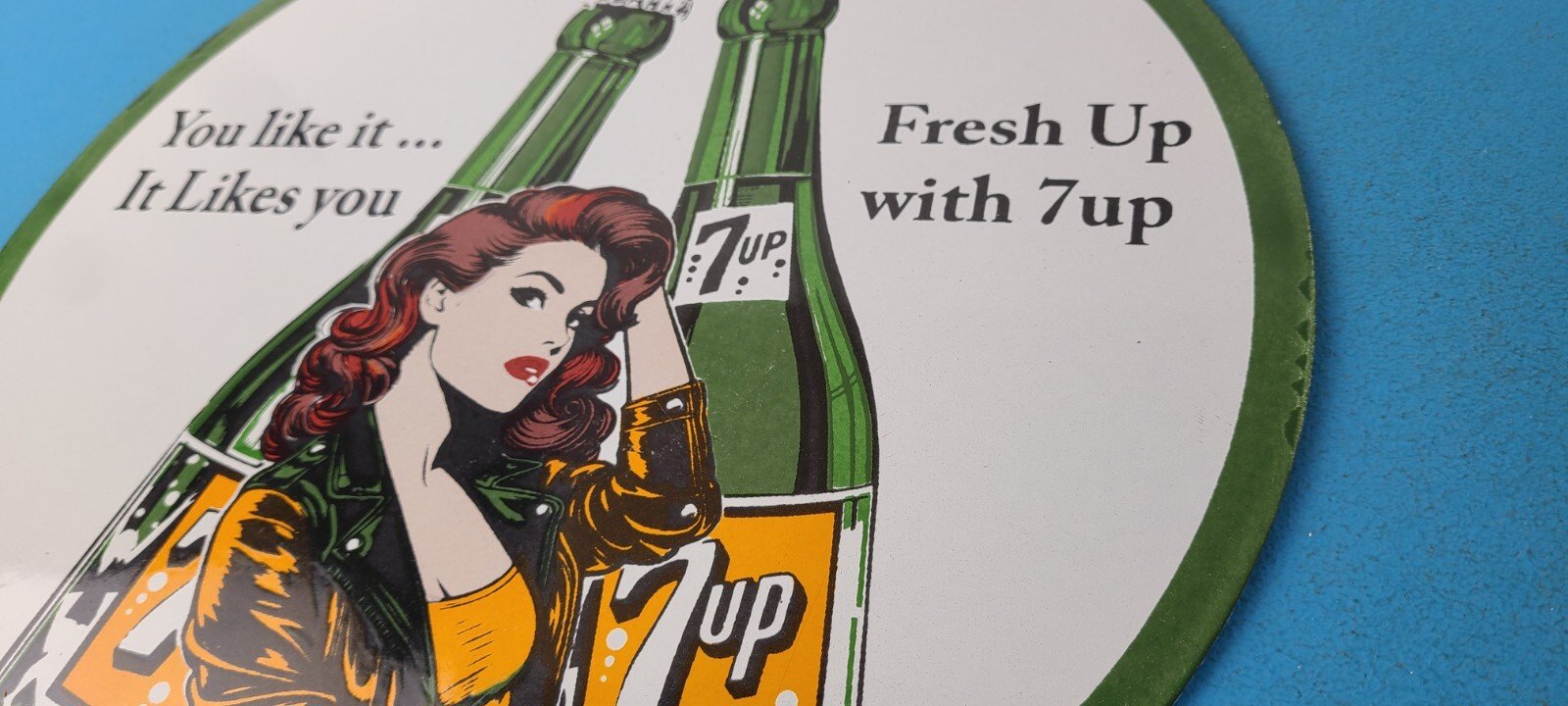This is a vintage 7 Up Soda Porcelain sign measuring 12″. This sign is perfect for any soda or gas themed space. Made of porcelain on both sides, this sign features the pinup girl with two 7up glass bottles. This sign is perfect for collectors of all kinds, whether you’re a fan of pin-up girls or just love the vintage aesthetic. Display it in your home bar, game room, man cave, or garage.