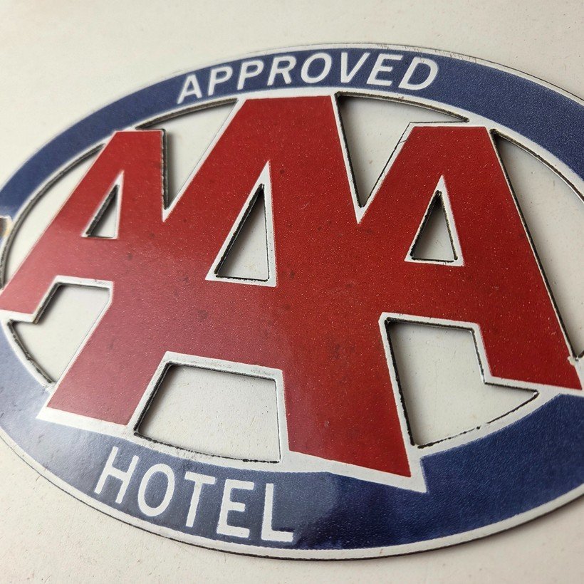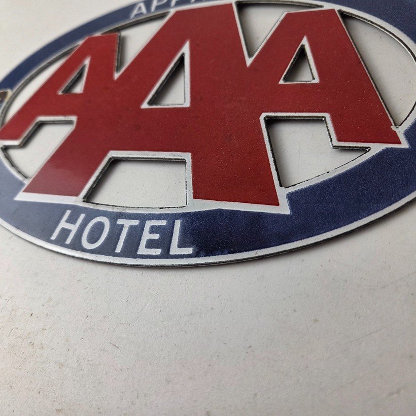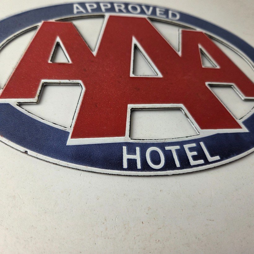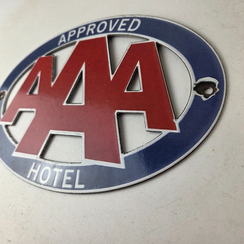 Featuring the iconic AAA Hotel Travel sign, this sign is a true beauty. Measuring 8 3/4″ x 6″, it is the perfect size for display in a garage, man cave, or game room. It features the die cut shape of “AAA” around an oval and is perfect for those who appreciate the nostalgia of the gas and oil industry. This porcelain gas sign is unique and would make a great addition to any collection.