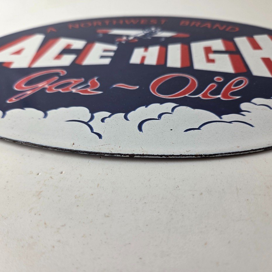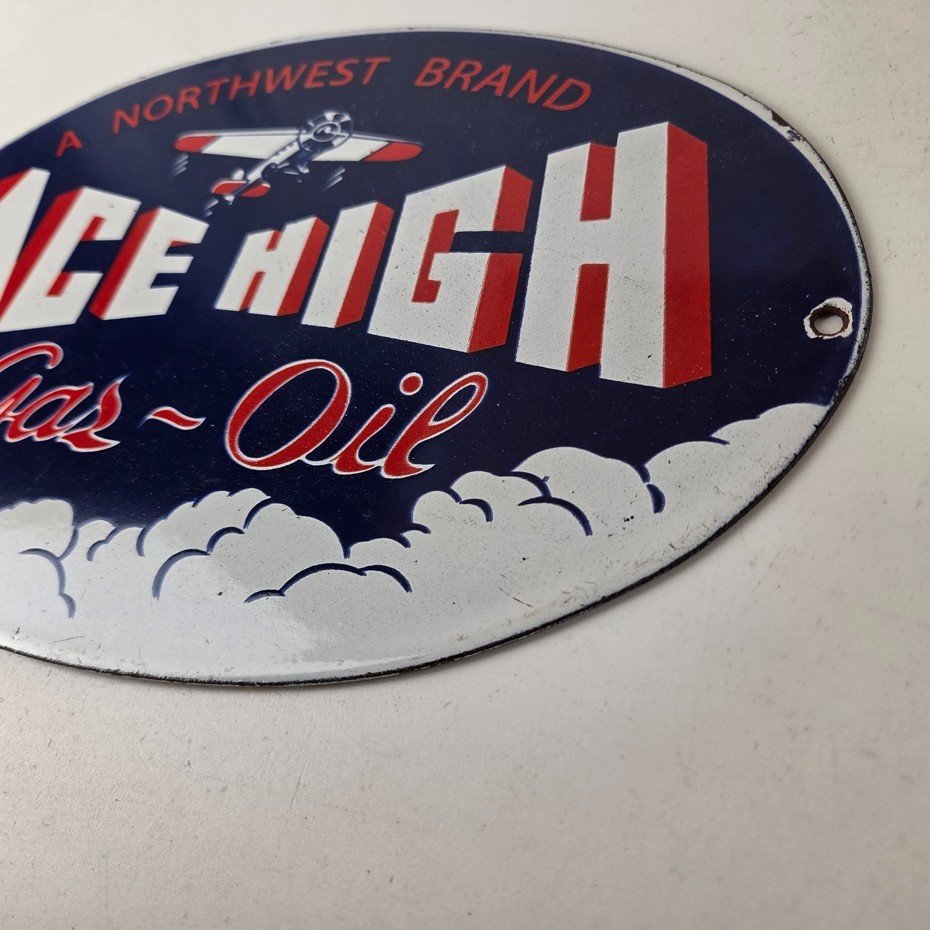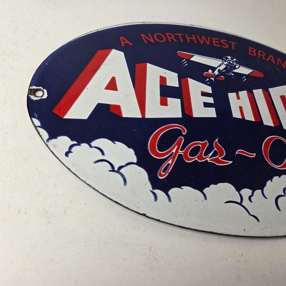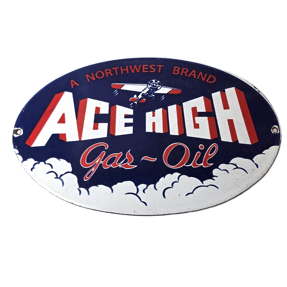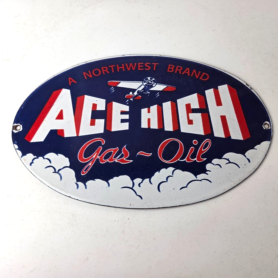 This vintage Ace High Gas & Oil porcelain sign measures 11″ x 7″ and features bold blue & red colors and the classic Ace High airplane. The sign is made of porcelain on both sides and has the graphic on one side.