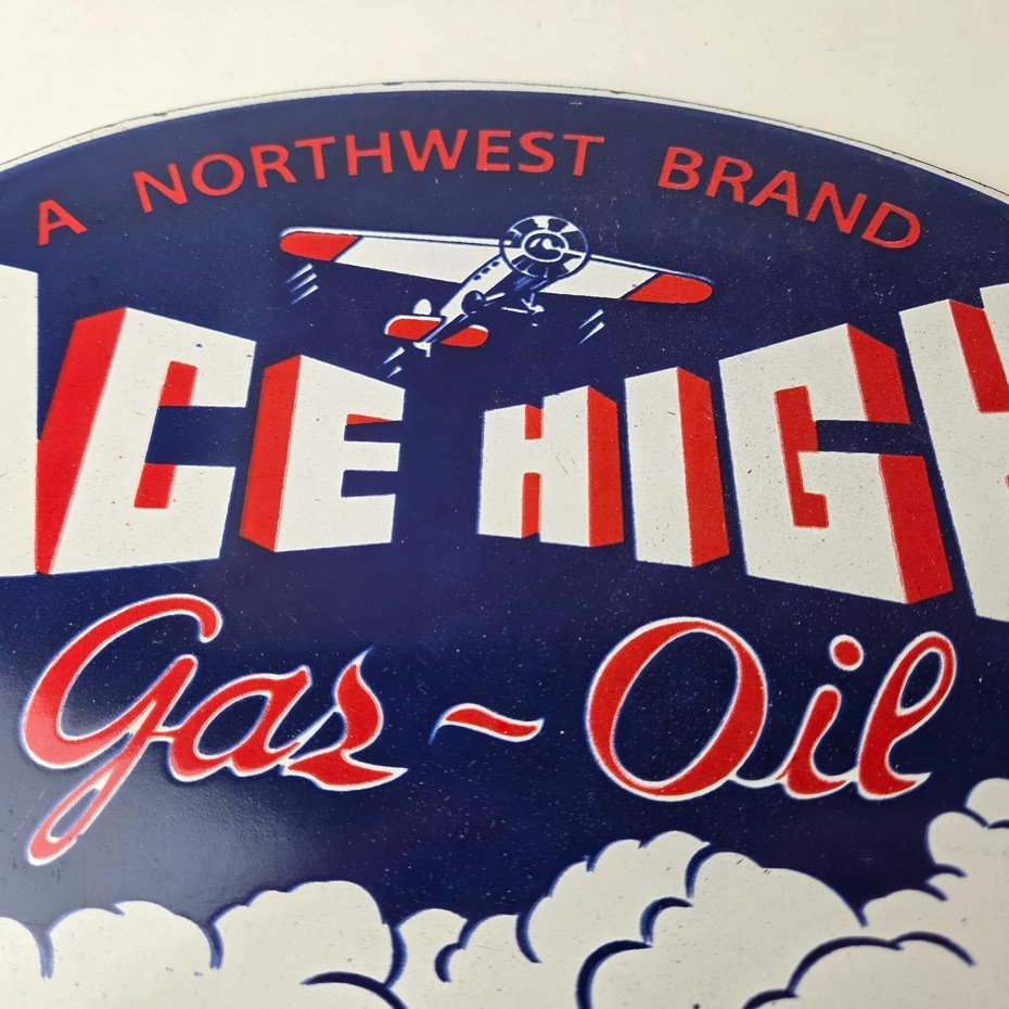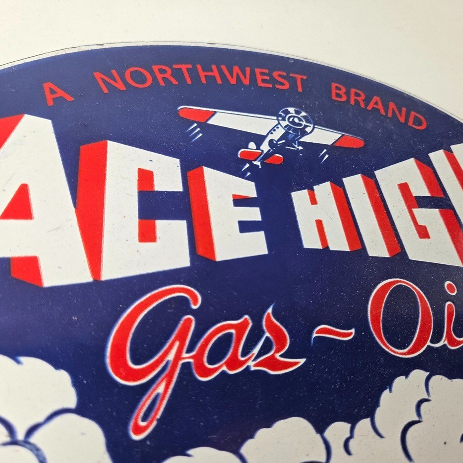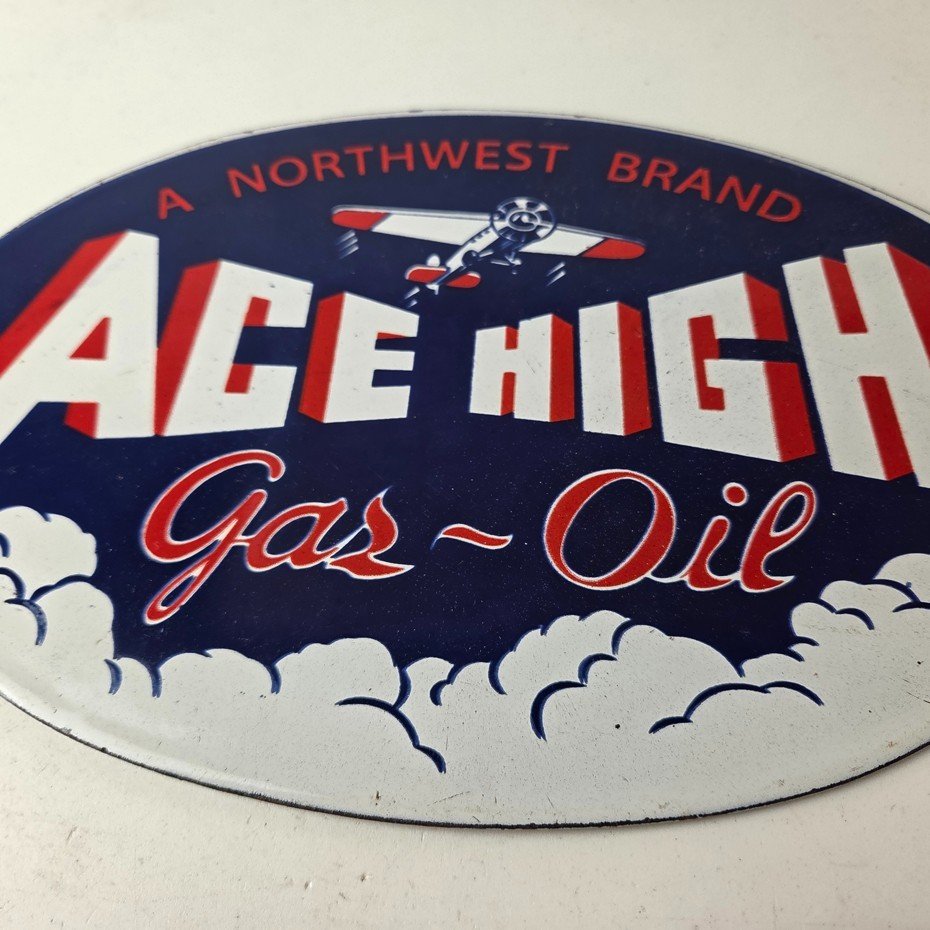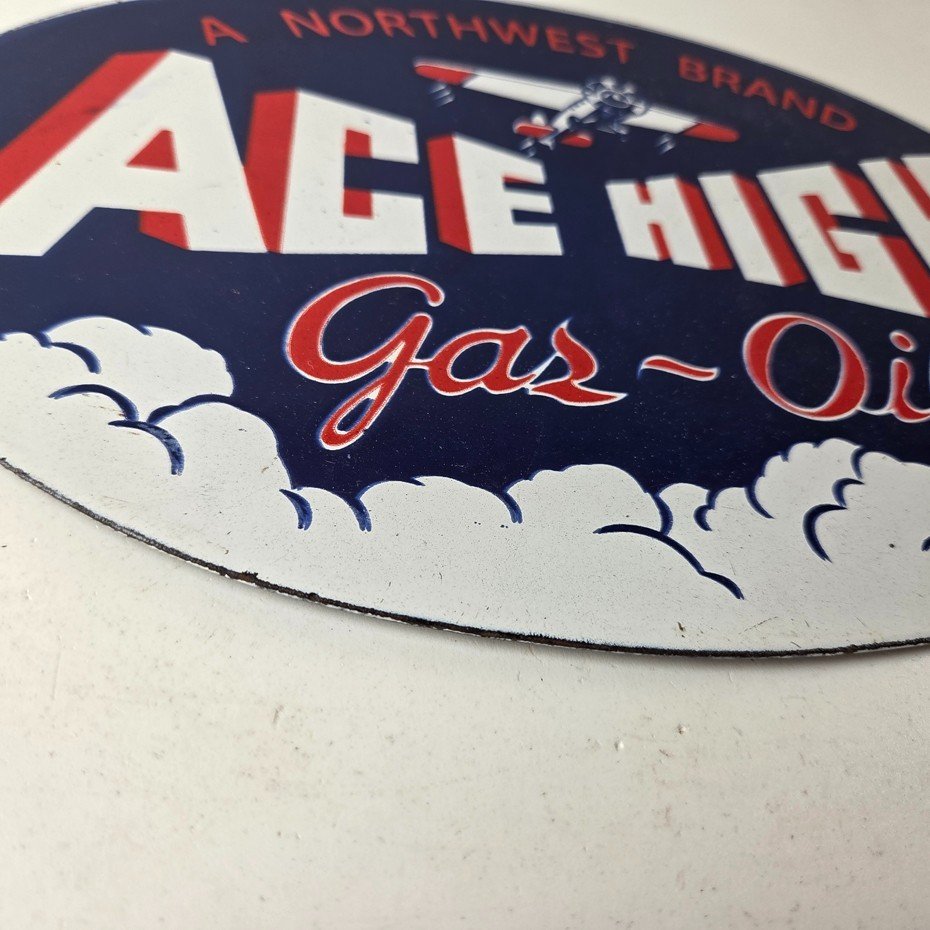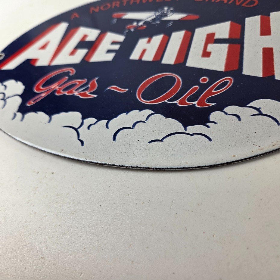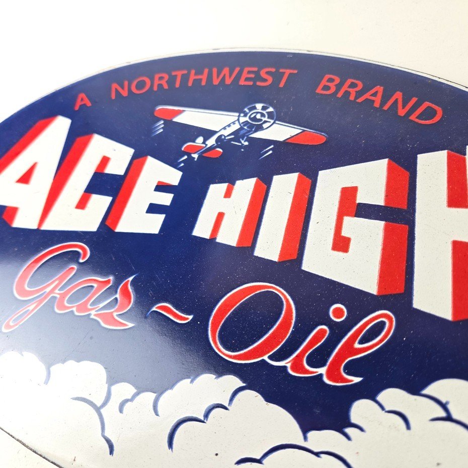 This vintage Ace High Gas & Oil porcelain sign measures 11″ x 7″ and features bold blue & red colors and the classic Ace High airplane. The sign is made of porcelain on both sides and has the graphic on one side.