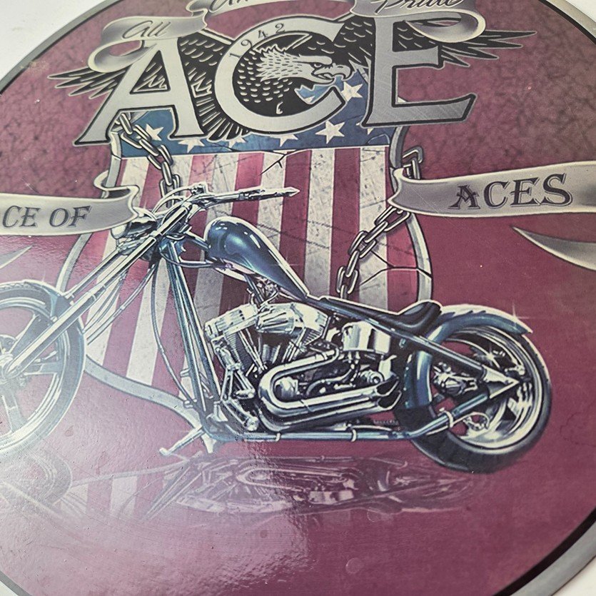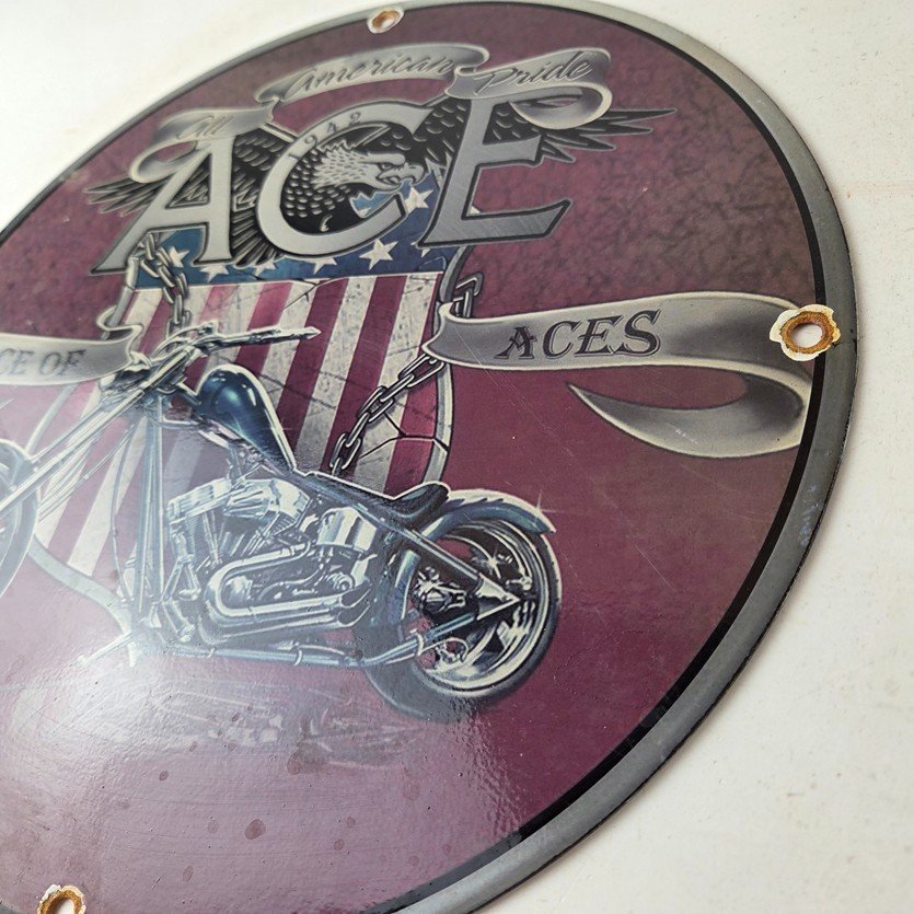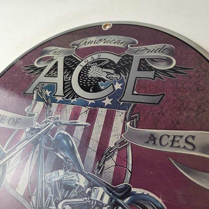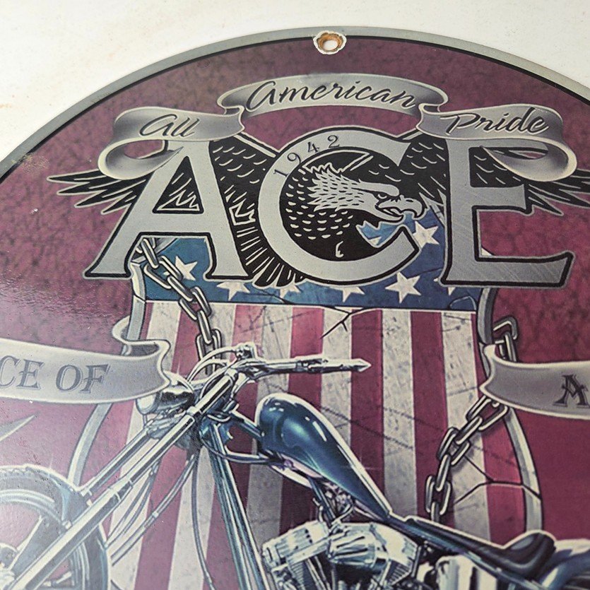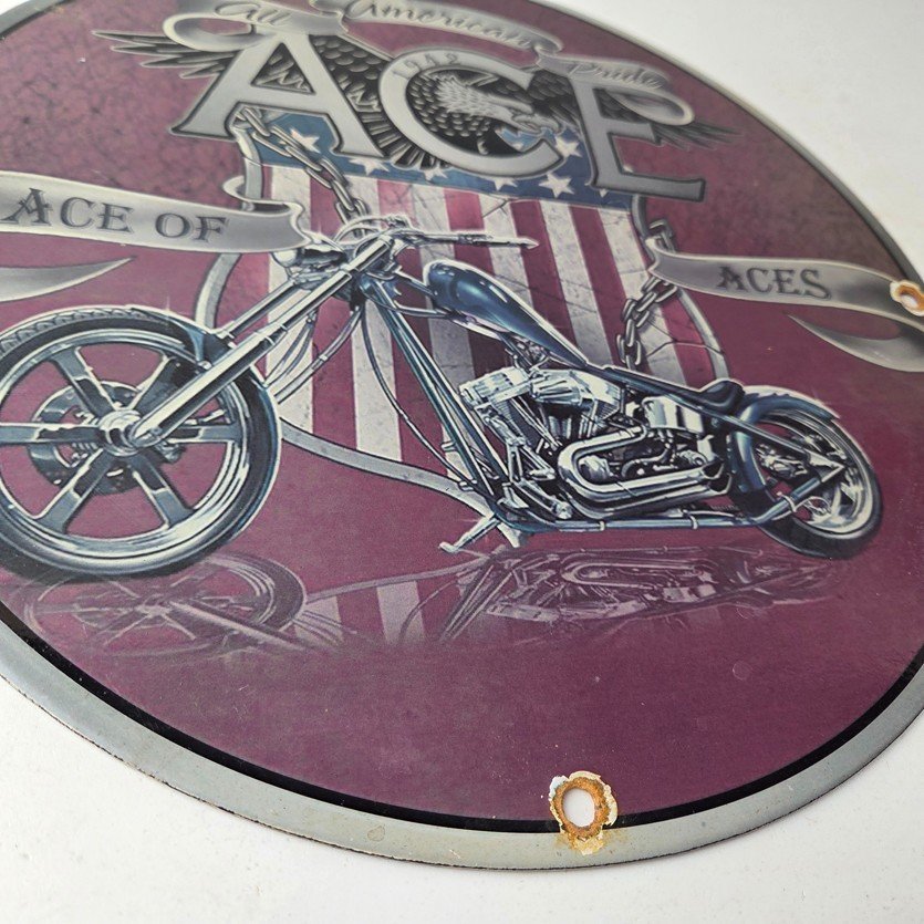 This vintage Motorcycle Porcelain sign is a true gem for any collector of oil & gas memorabilia. Measuring 11 3/4″ across and made of porcelain, this striking piece is perfect for any biker or gas & oil enthusiast. The sign’s vibrant colors make it a standout piece that will add character to any room.