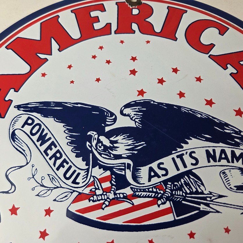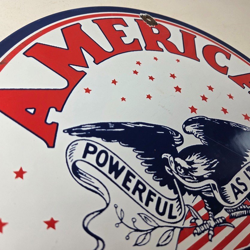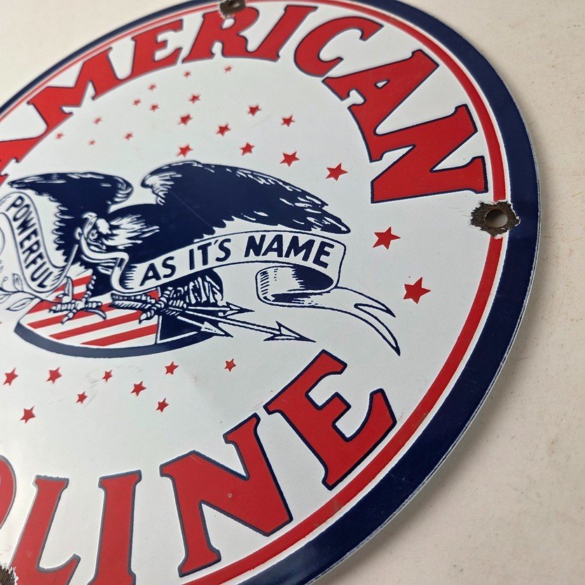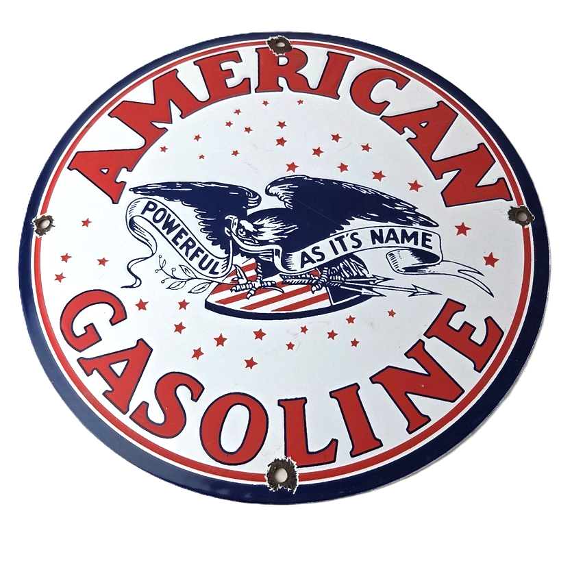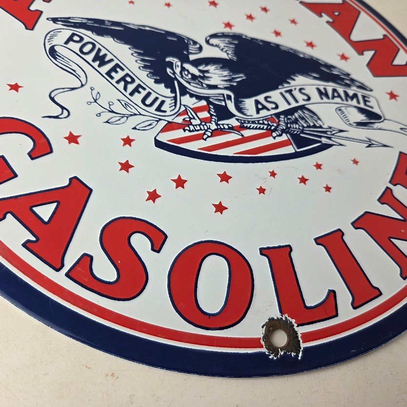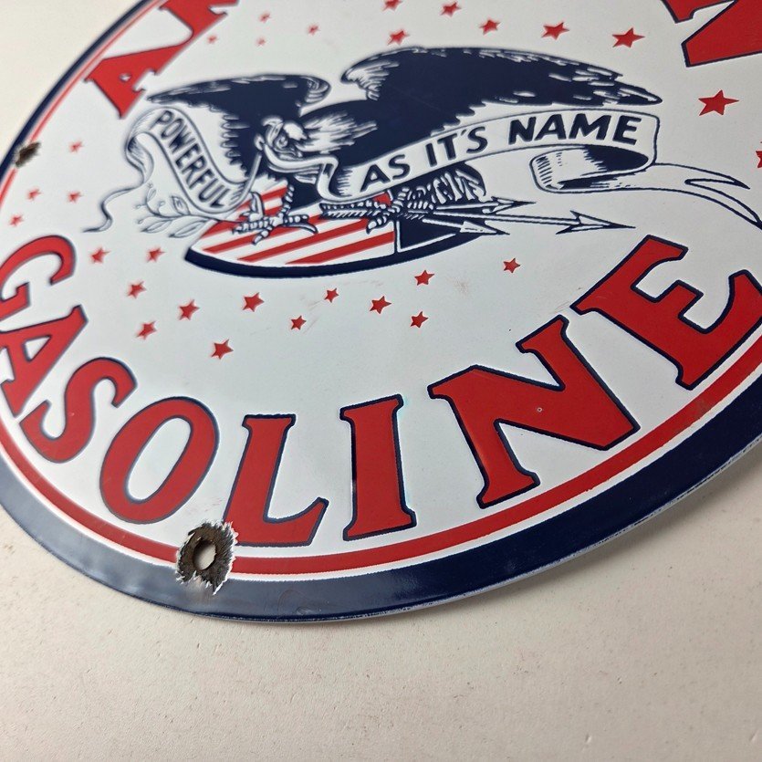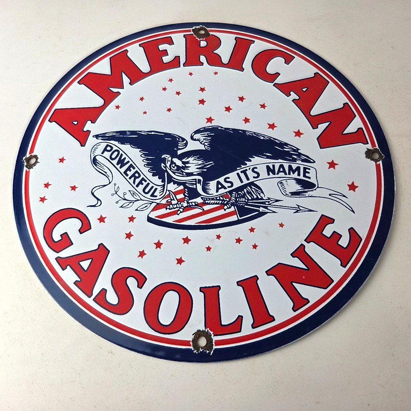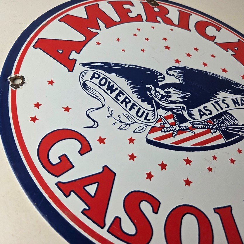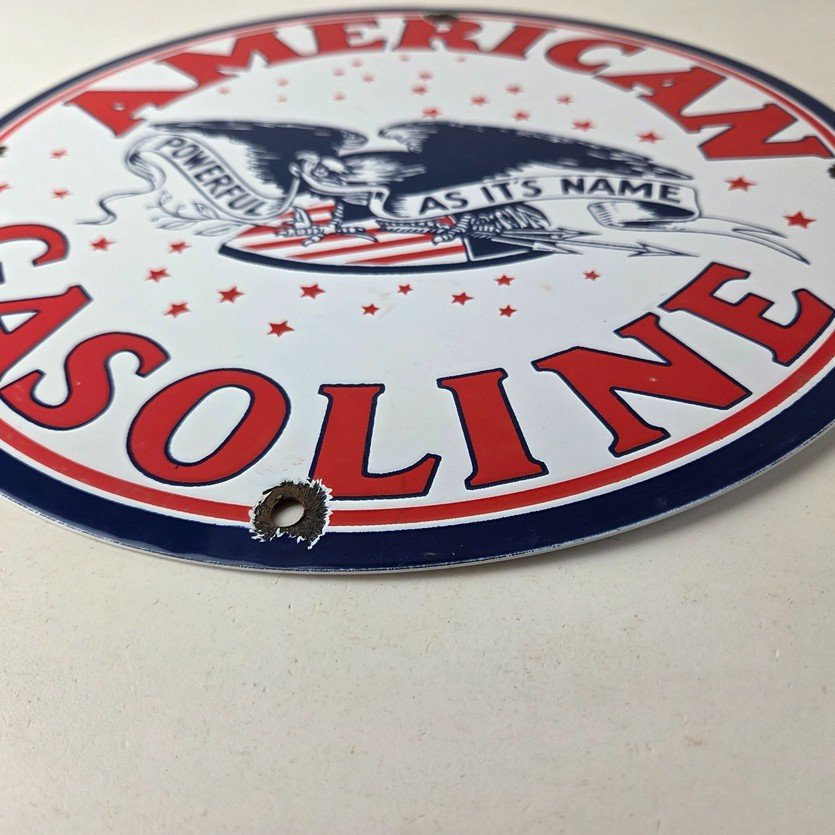 This vintage American Gasoline porcelain sign features a striking design with bold colors and is made of porcelain material. It is perfect for display in a garage, shop, or man cave. The sign measures 11 3/4″ and is in excellent condition, with no major chips or cracks. It was made in the United States and has excellent porcelain and colors.