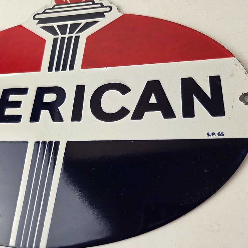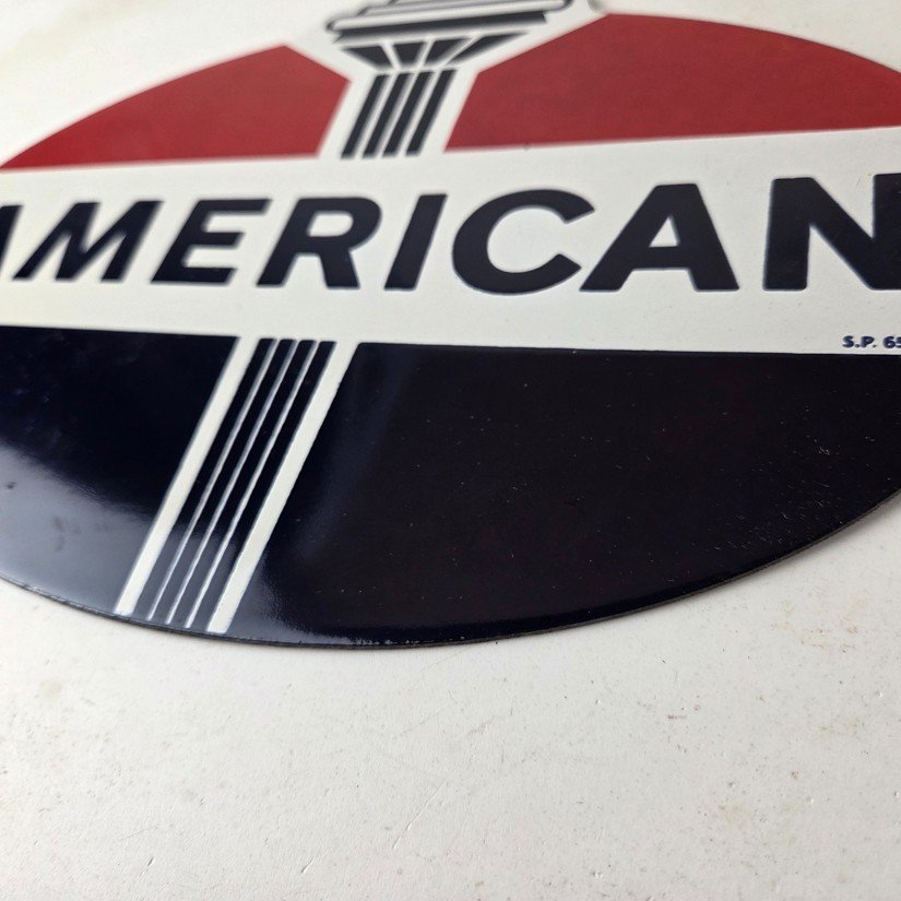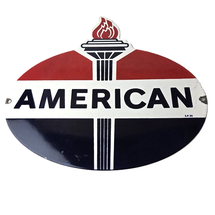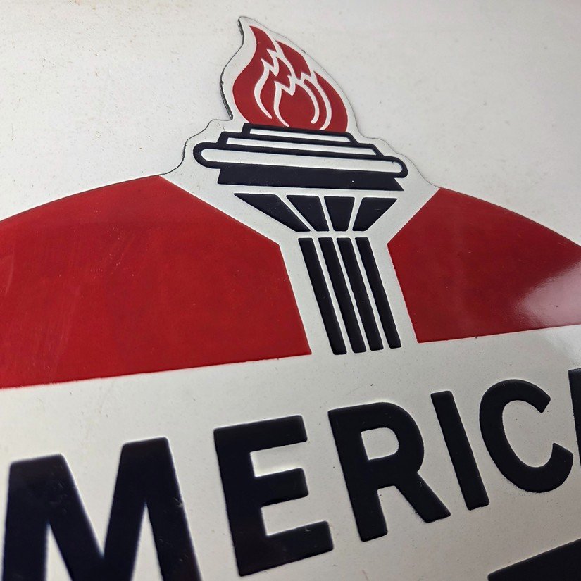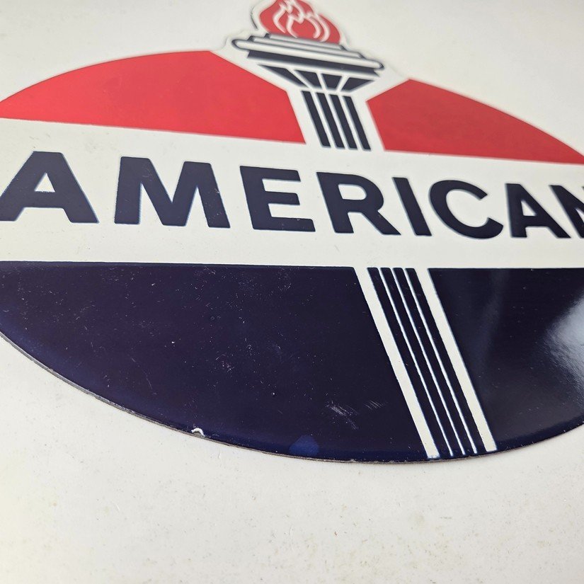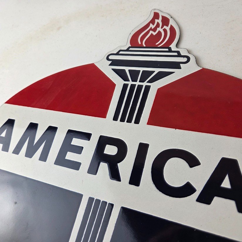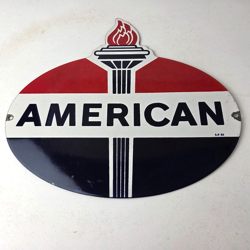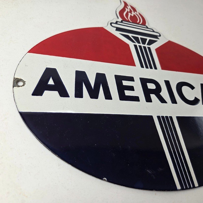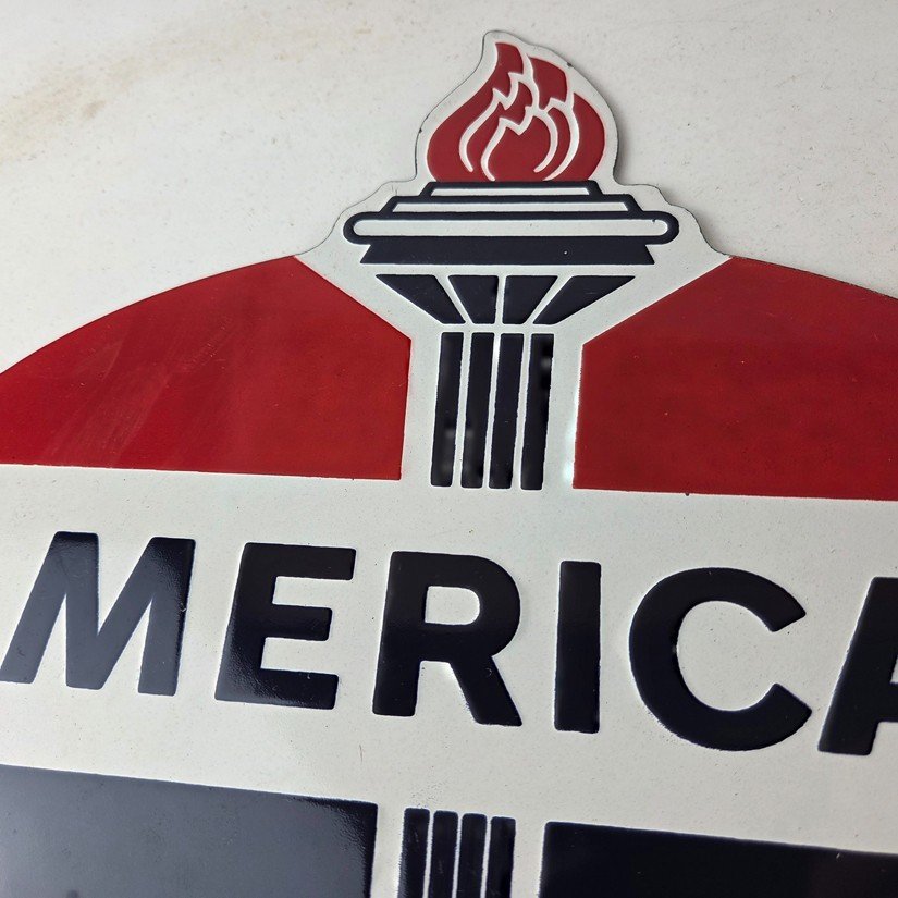 This vintage American Standard sign is a must-have for collectors of gas and oil memorabilia. The sign features a striking torch graphic and comes in classic red, white and blue colors. Made of porcelain, this sign is a durable addition to any collection. Perfect for display in a garage or man cave, this sign is a great conversation starter and adds a touch of nostalgia to any space.