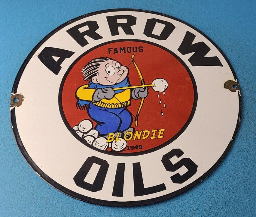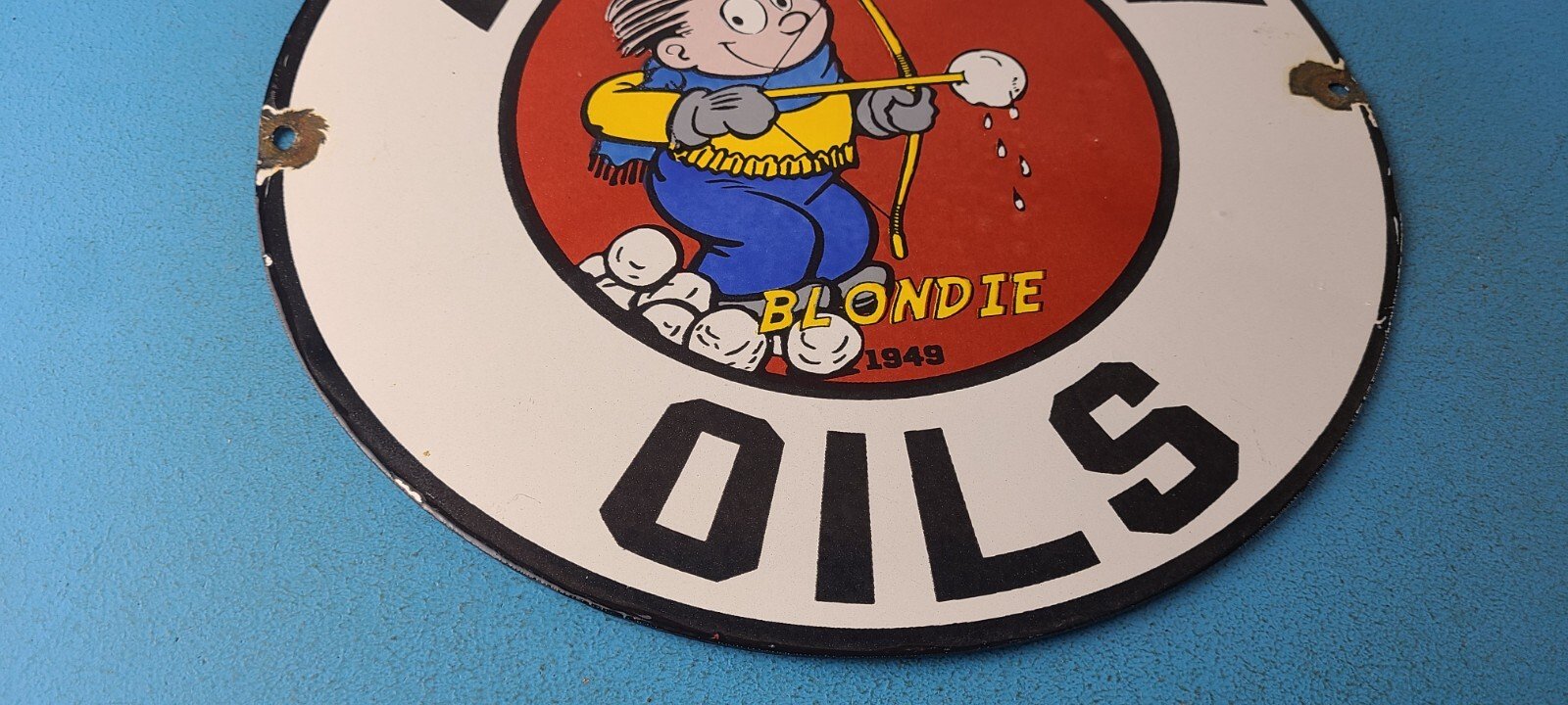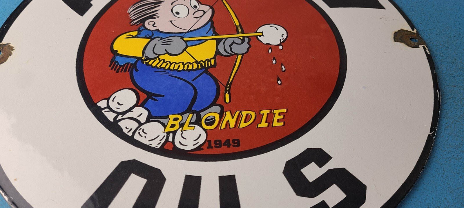 This vintage porcelain sign features Blondie character. The sign measures 12 inches and has a colorful design with excellent porcelain. It is a great piece of gas and oil advertising memorabilia for collectors, retro man cave decor or your shop or garage. The sign is in excellent condition and can be combined with other items for shipping at a rate of $5 per additional item.