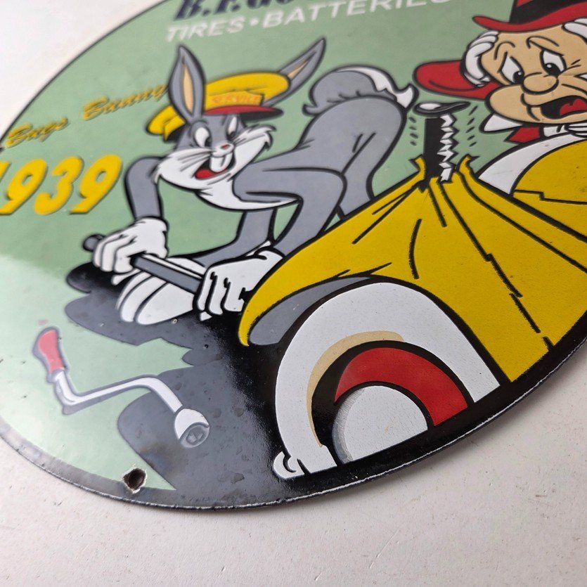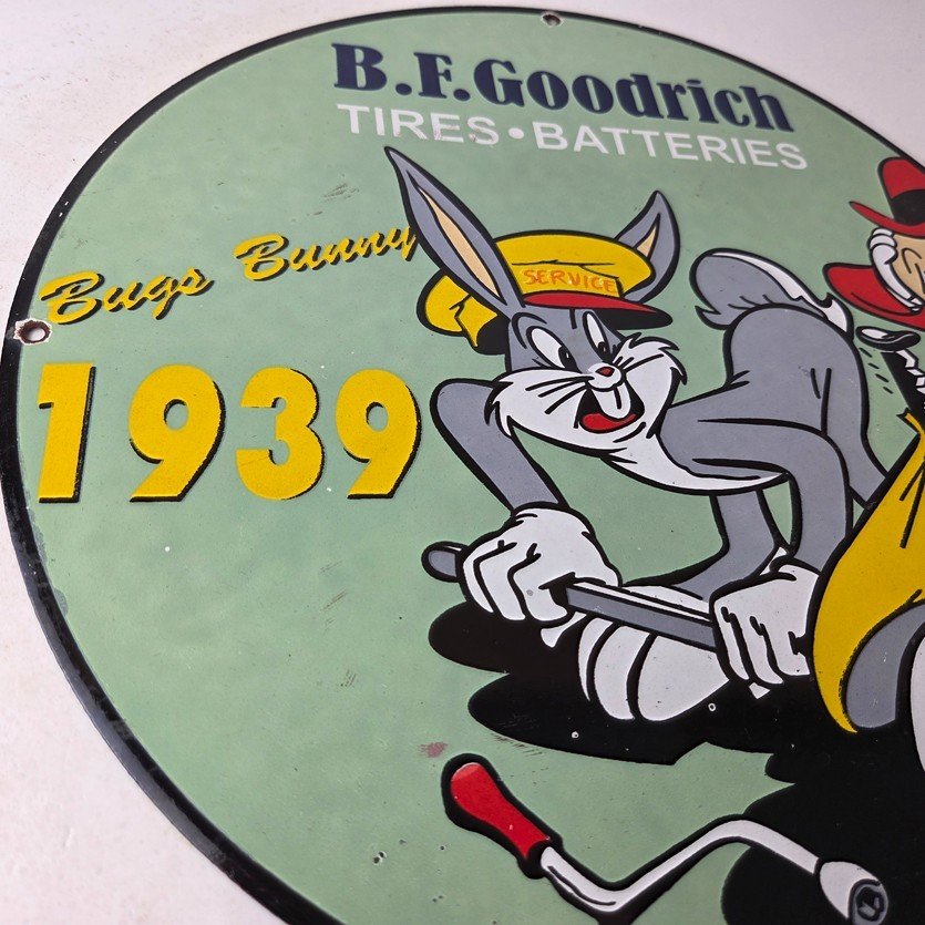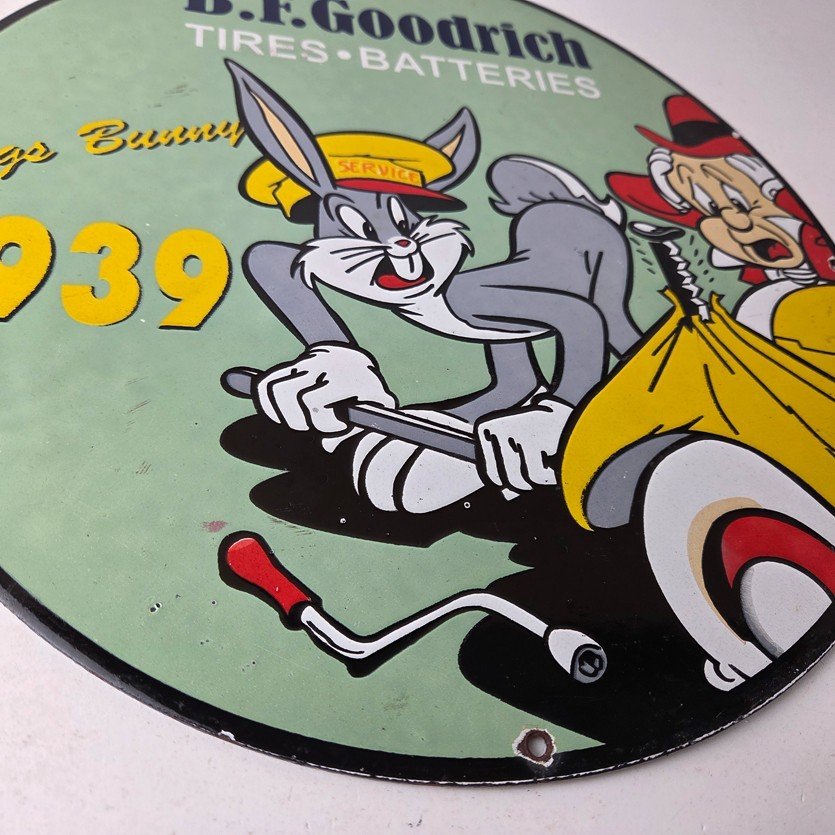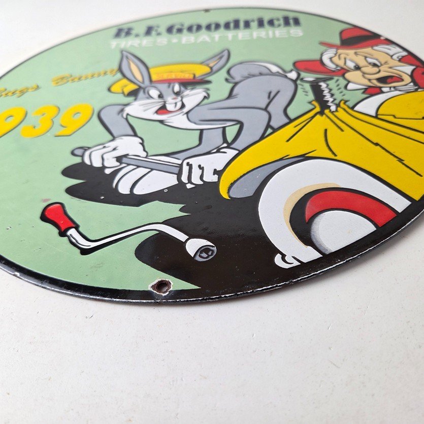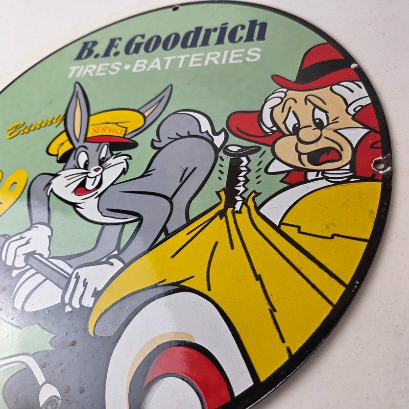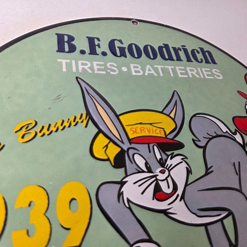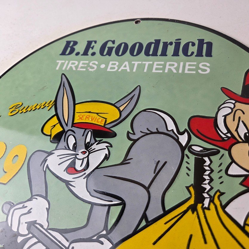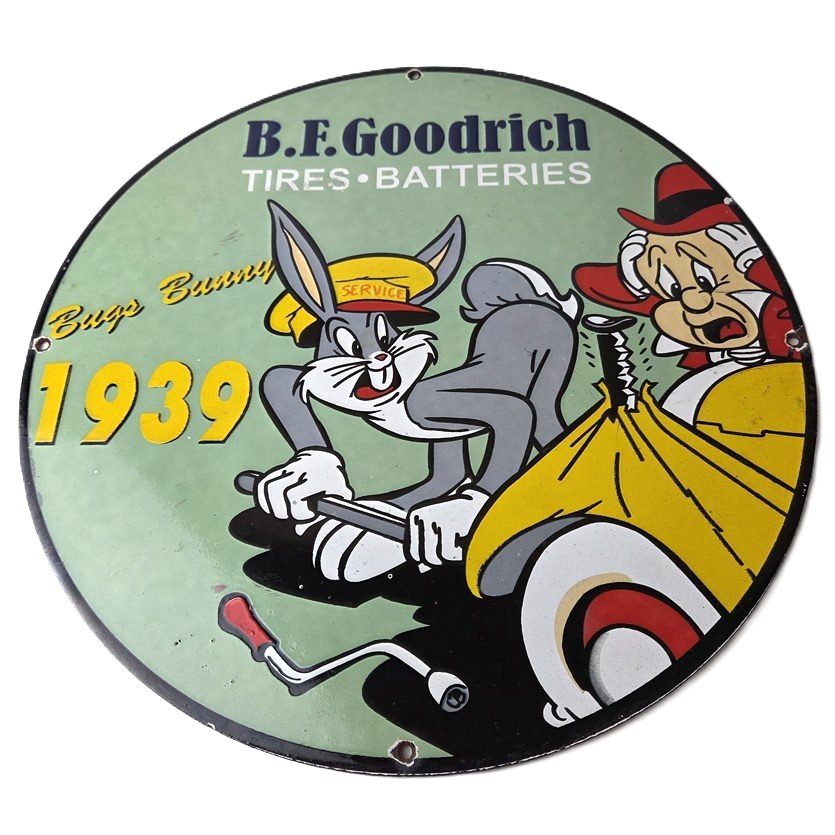 The sign showcases the iconic Goodrich graphic and the rabbit, making it a great addition to any collection, man cave, display case or garage. Made of porcelain on both sides and measures 12″ across. The vibrant colors and intricate design make it perfect for display on any wall or shelf.