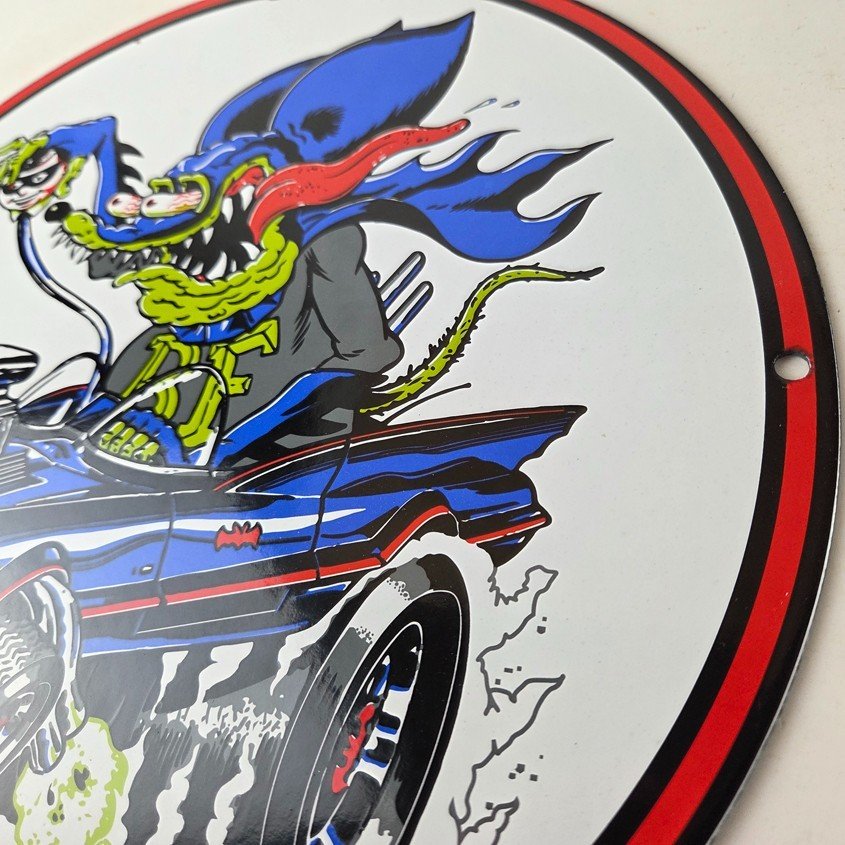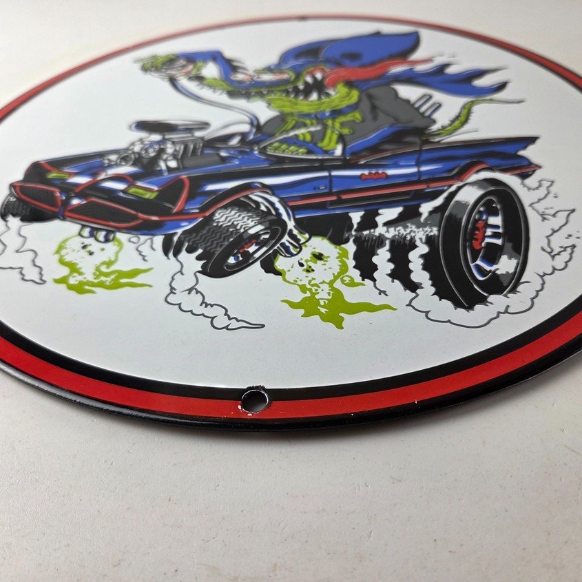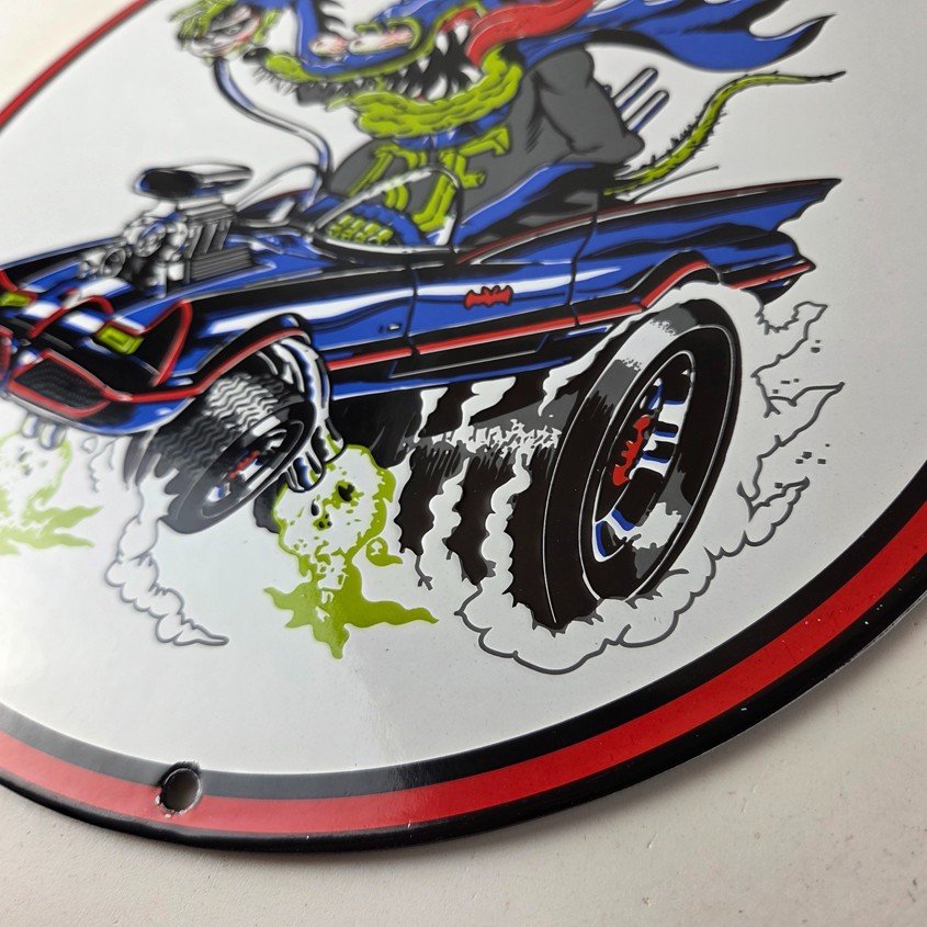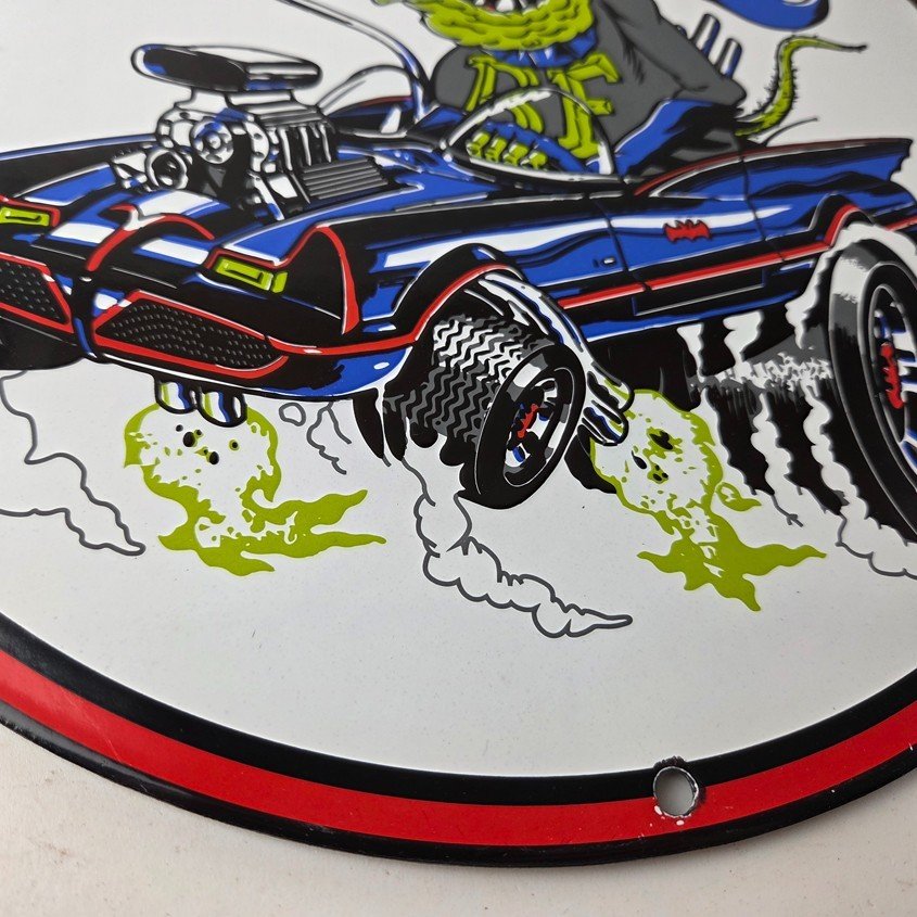 This vintage porcelain sign features the iconic Rat Fink character created by Ed Big Daddy Roth. The sign is perfect for hot rod enthusiasts and collectors of gas and oil memorabilia. This pump plate wall sign showcases the “Bat Man Rat Rod” edition. It is a unique piece of advertising that would make a great addition to any collection or display.