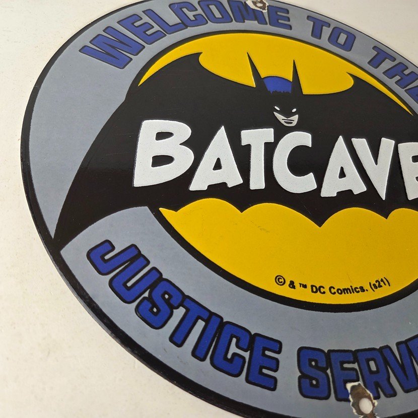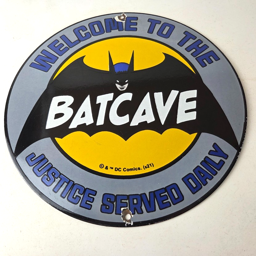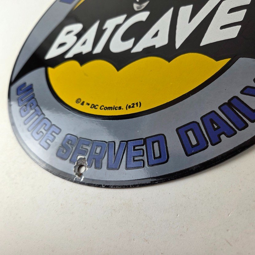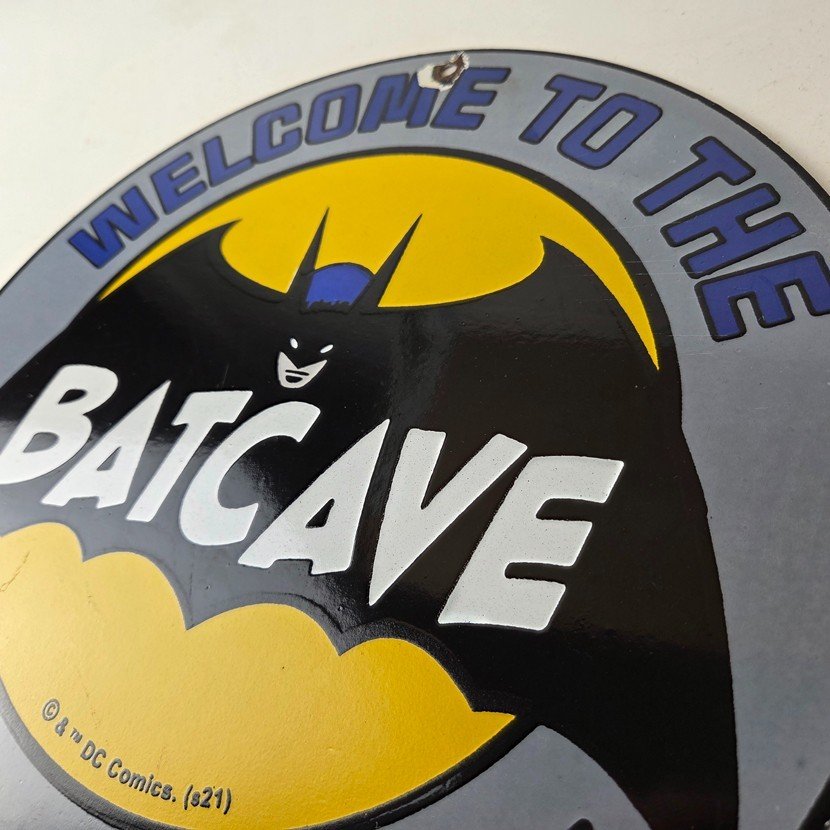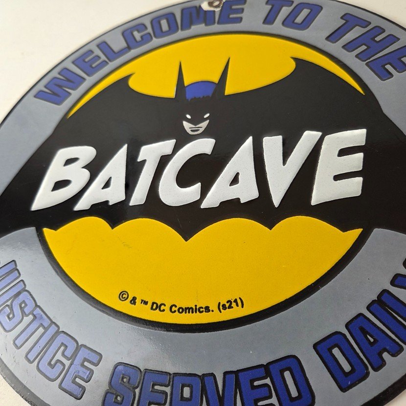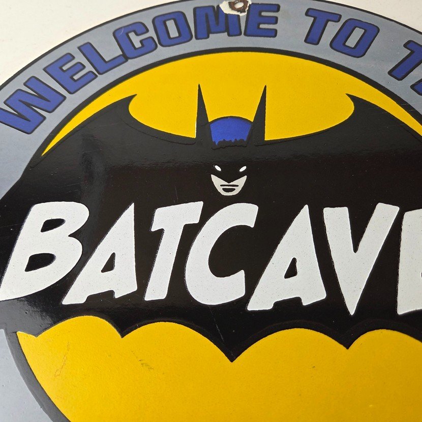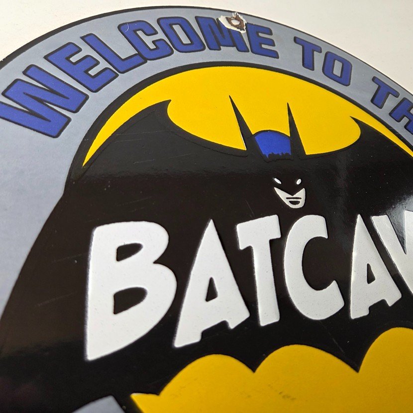 Vintage Bat Cave Batman Porcelain Sign.
