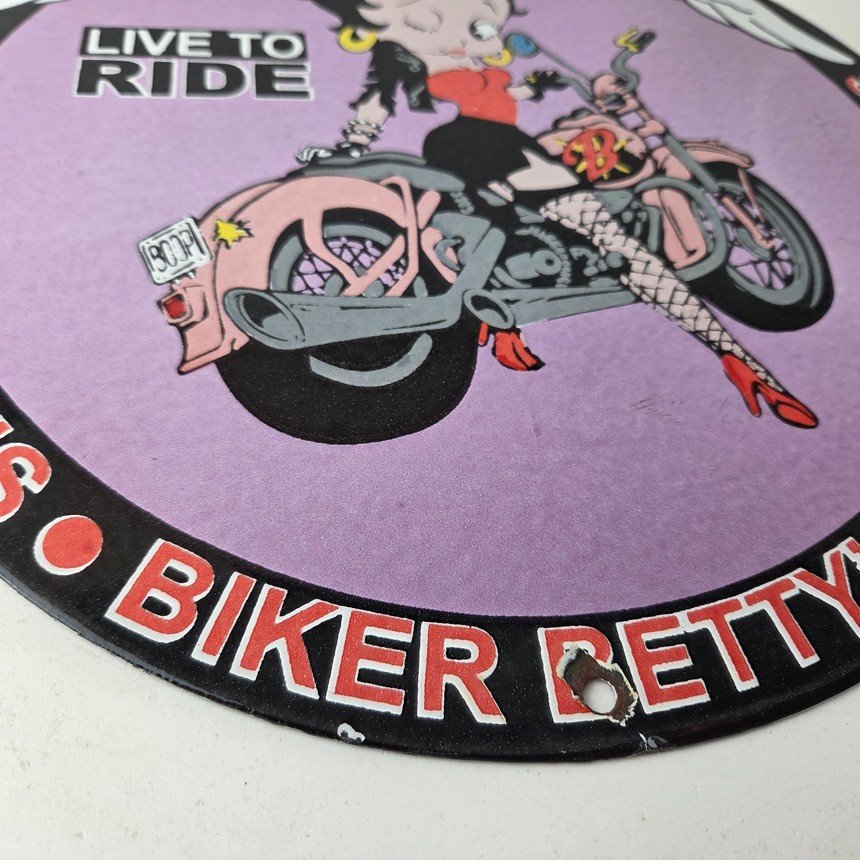 This vintage Harley Davidson Motorcycle porcelain sign features a striking design of Betty Boop with bold colors and is made of porcelain material. It is perfect for display in a garage, shop, or man cave. The sign measures 12″ and is in excellent condition, with no major chips or cracks.