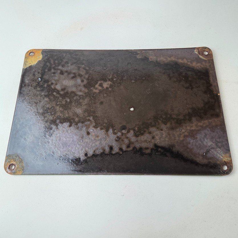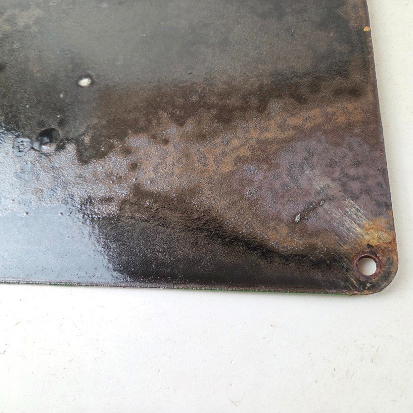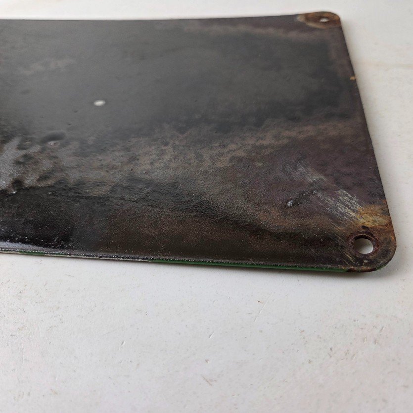 Made of porcelain enamel on steel with patina and wear: rust spotting around the mounting holes, minor edge chips, light surface scratches, and minimal discoloration. This is a porcelain enamel advertising sign in excellent condition, exactly as shown in the photos.