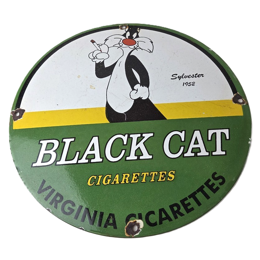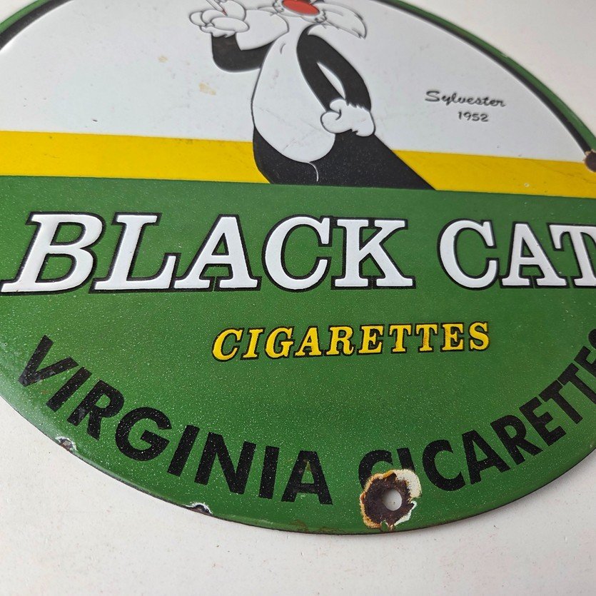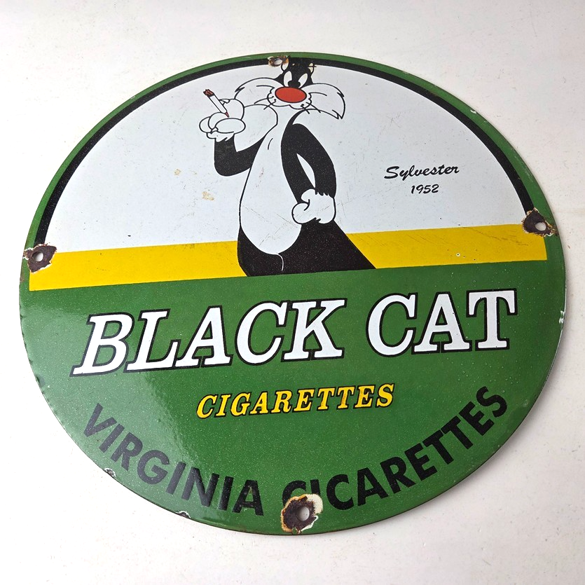 This vintage Cigarette Porcelain sign features the iconic Black Cat brand and is perfect for collectors of Tobacco or gas and oil advertising memorabilia. The sign measures 12″ and features a vibrant green and yellow color scheme with bold lettering.