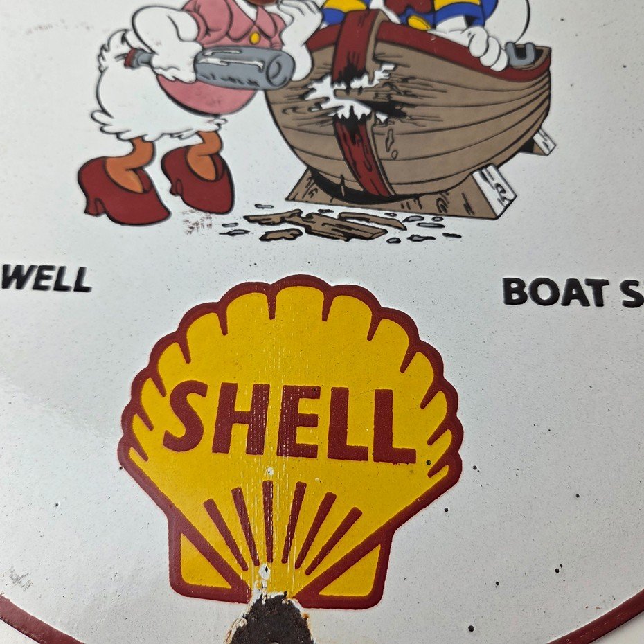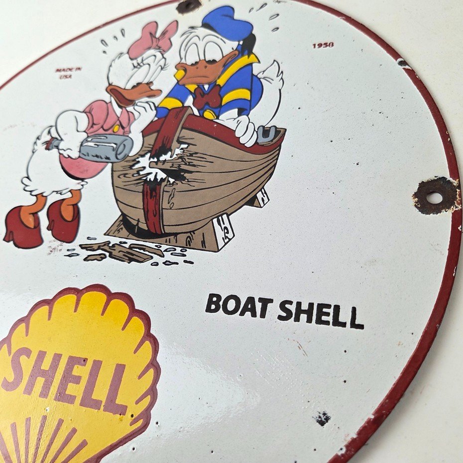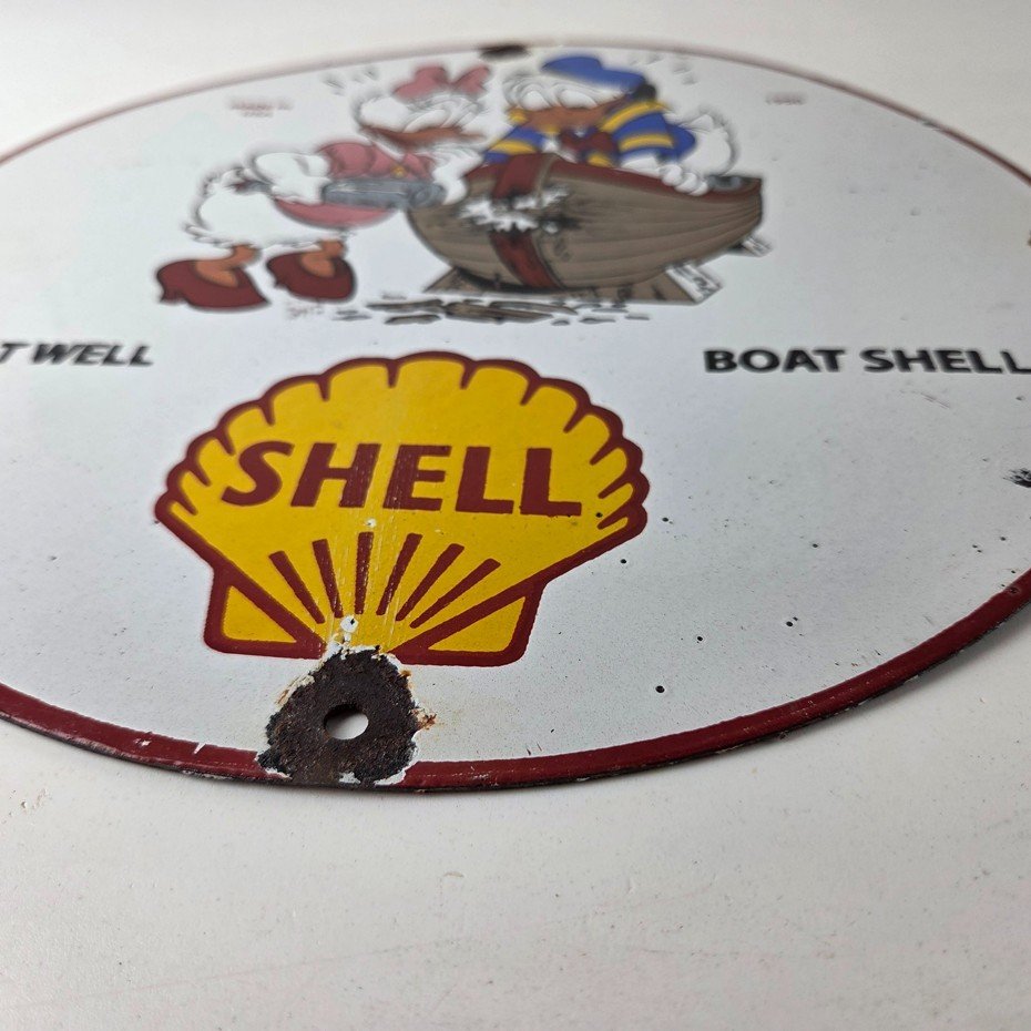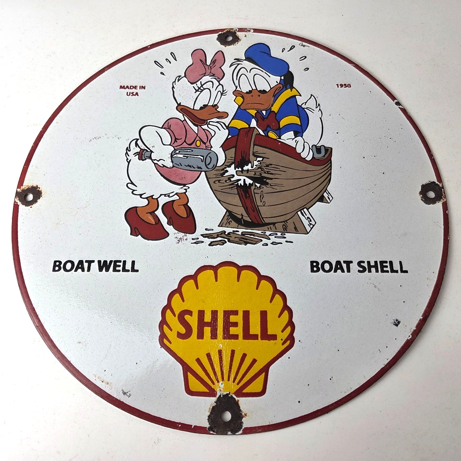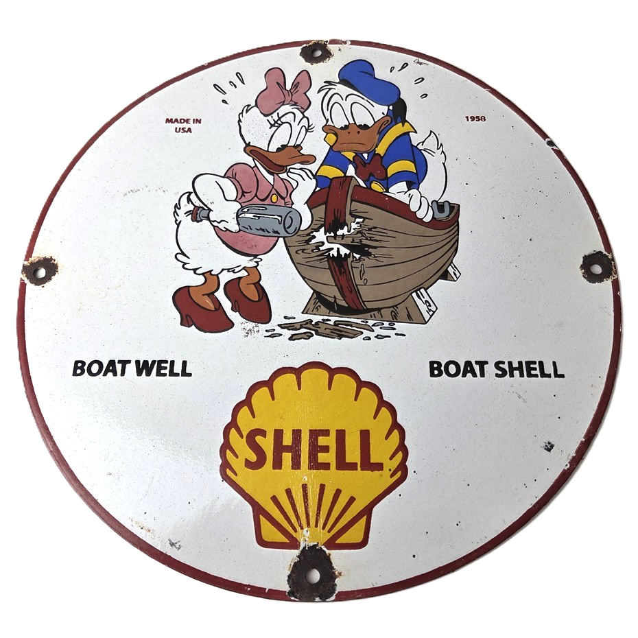 This vintage Shell Gasoline porcelain sign featuring a classic Walt Disney Old Boat with Donald Duck in the wooden boat. This has vibrant colors of red, yellow, black, and blue with excellent porcelain and measures 12″ across.