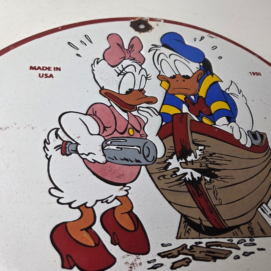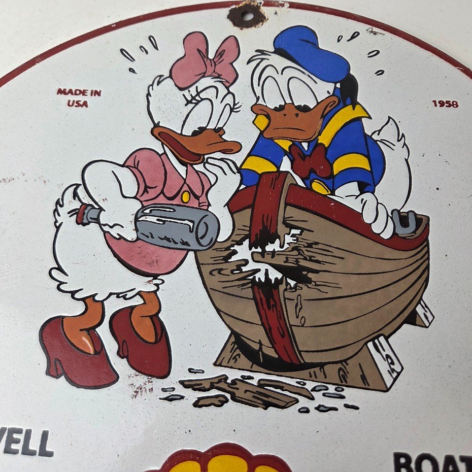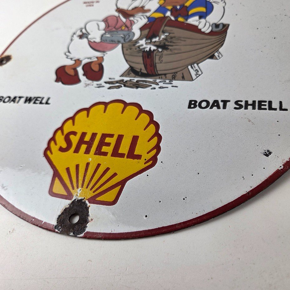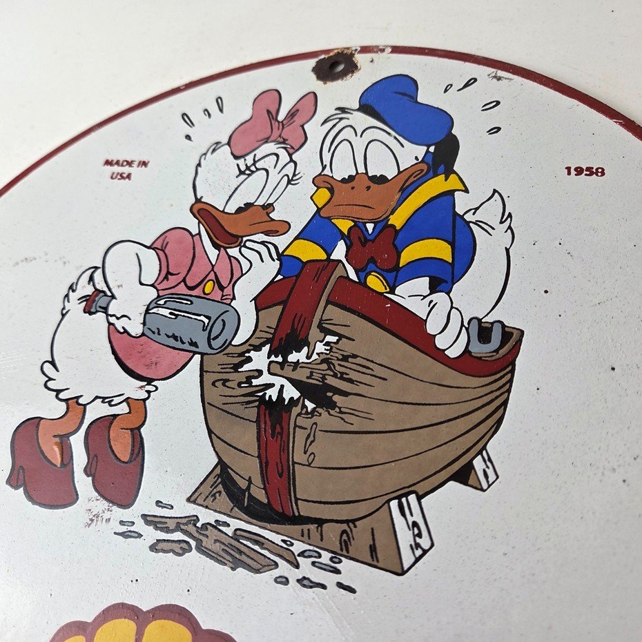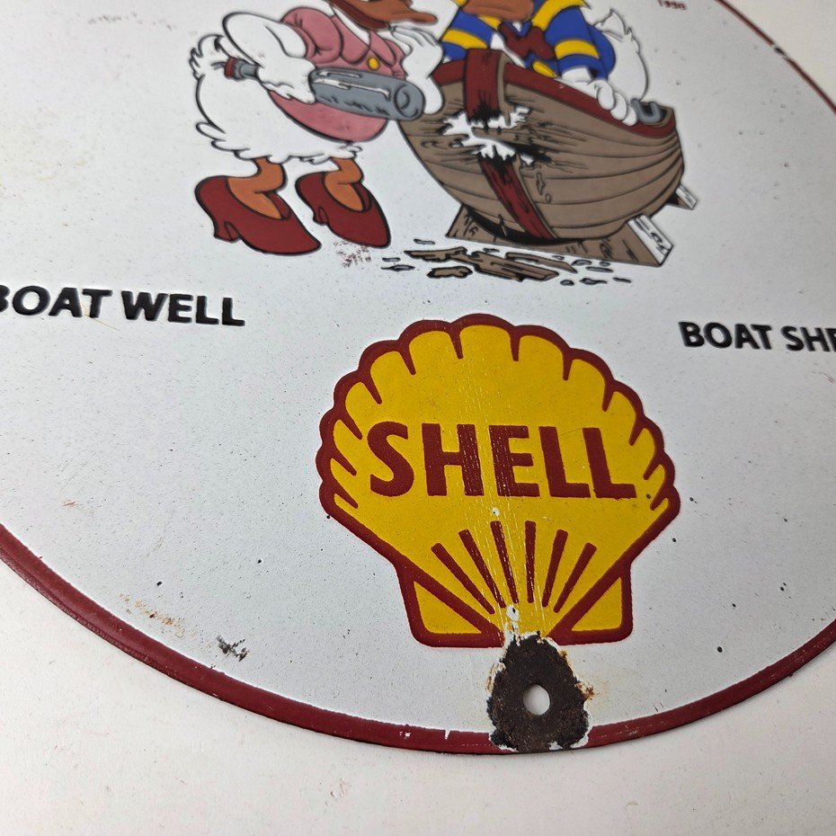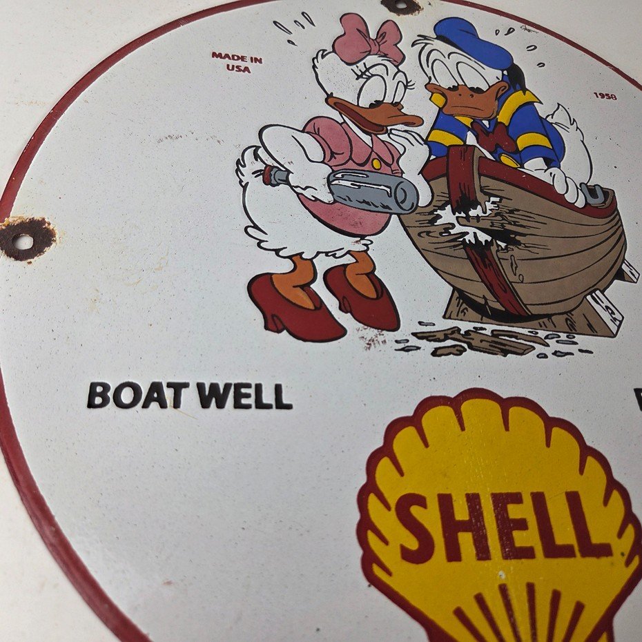This vintage Shell Gasoline porcelain sign featuring a classic Walt Disney Old Boat with Donald Duck in the wooden boat. This has vibrant colors of red, yellow, black, and blue with excellent porcelain and measures 12″ across.