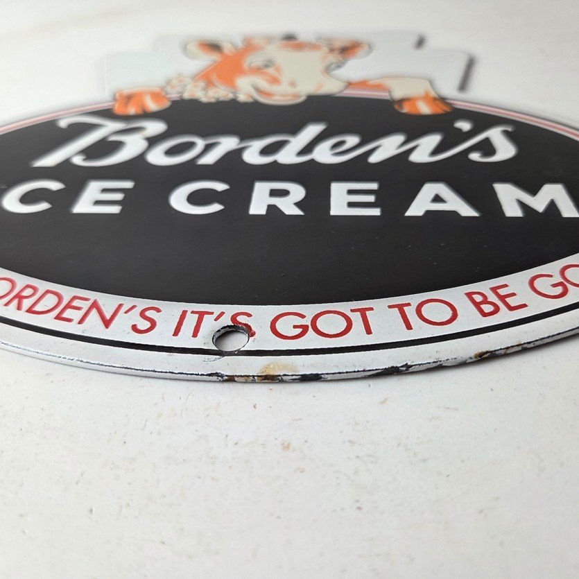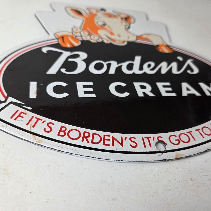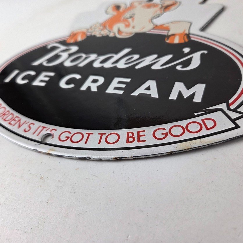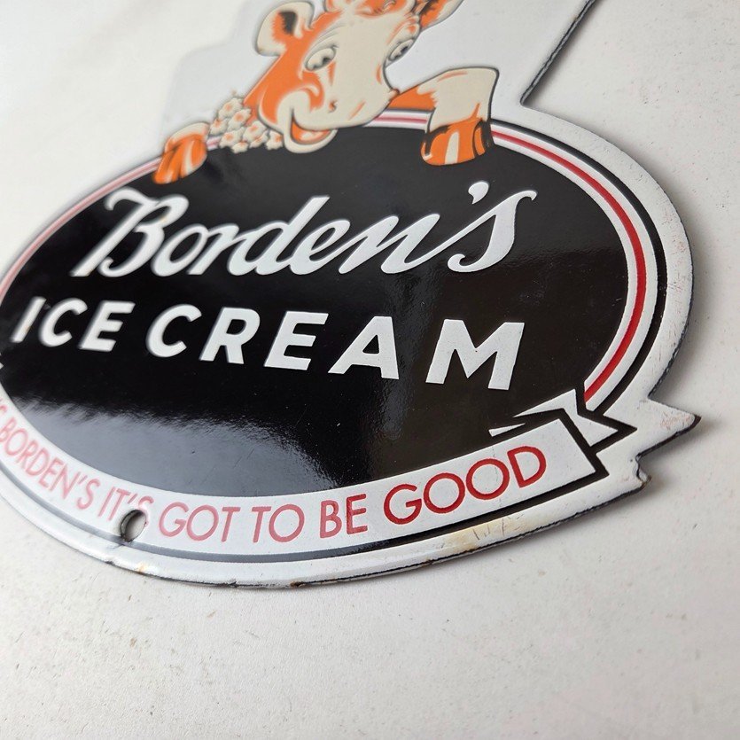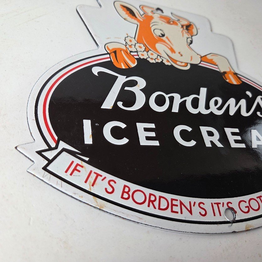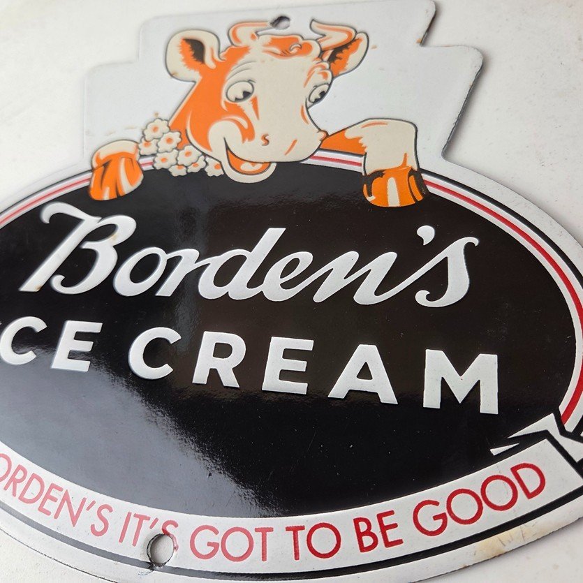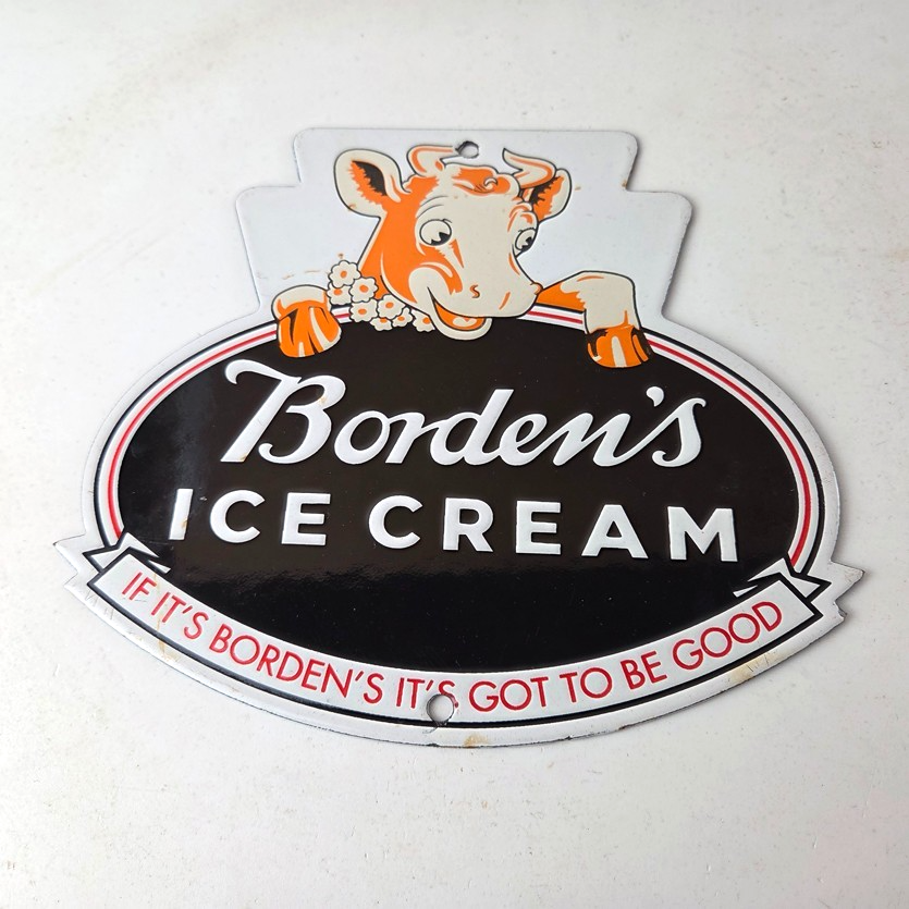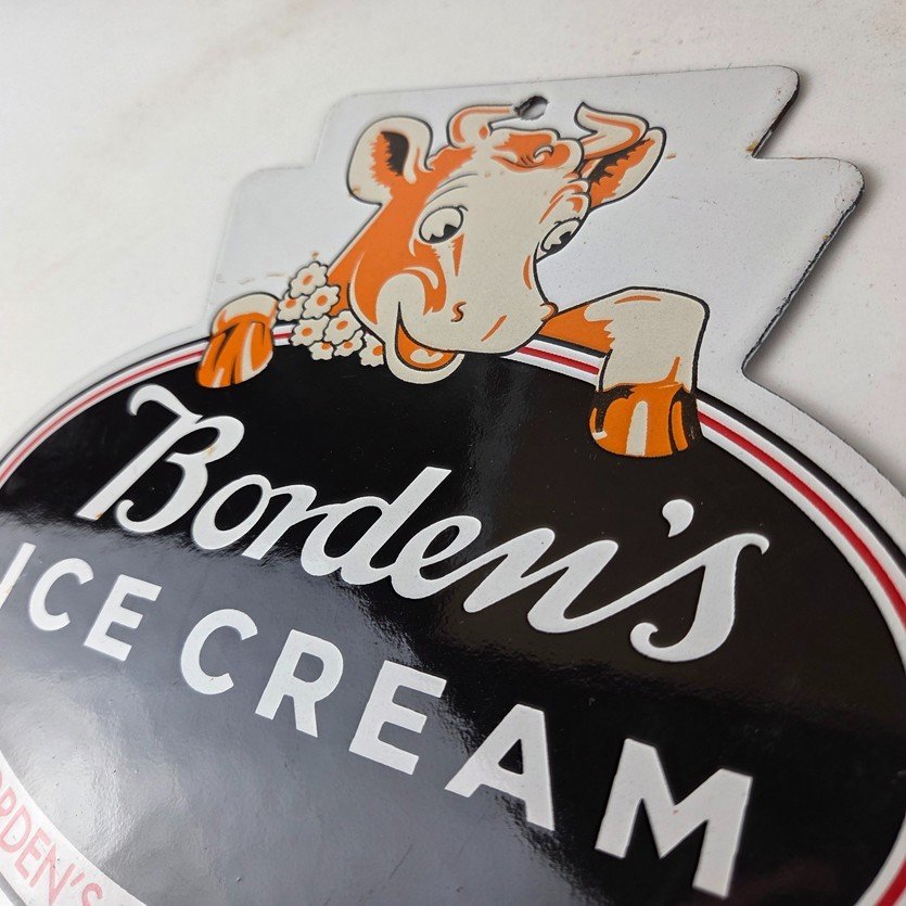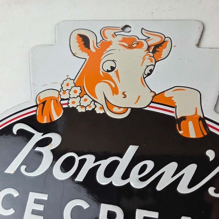 This vintage Borden’s Ice Cream porcelain sign features the iconic Elsie the Cow, advertising for Bordens Ice Cream. Add a vintage touch to your gas station or soda beverage collection with this Borden’s sign. Measuring 8 3/4″ by 8″, this sign has excellent colors and porcelain.