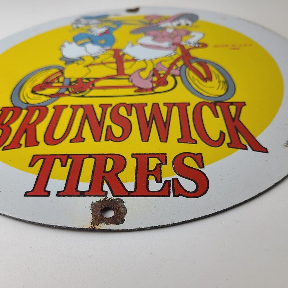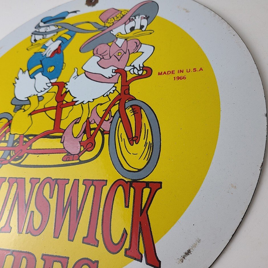 This vintage porcelain sign is a neat piece of advertising memorabilia with Donald Duck. It features the iconic Brunswick Tires lettering and is designed for use in gas service stations and mechanic shops. The sign is made of high-quality porcelain and is in good condition. The sign is perfect for collectors of gas and oil memorabilia, as well as people who need to fill their garage or shop.