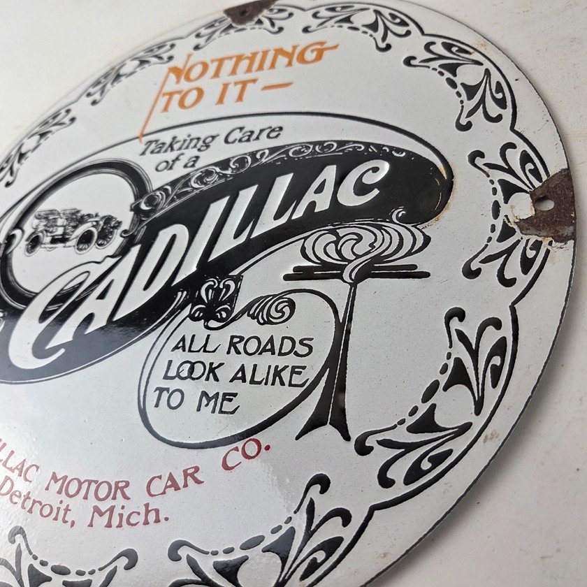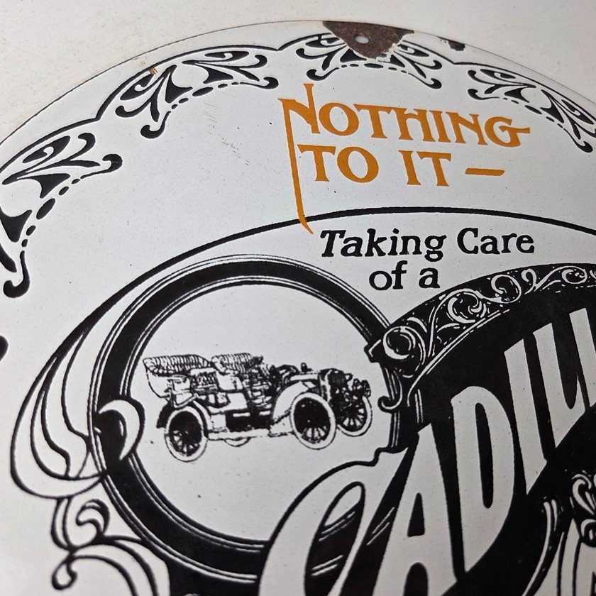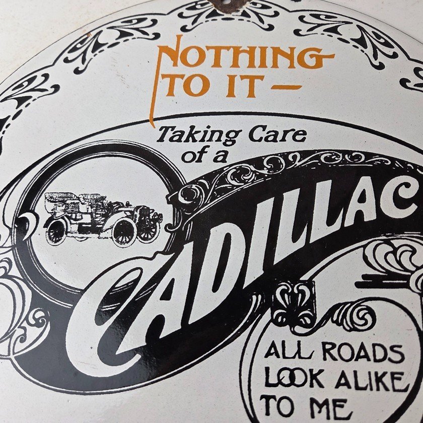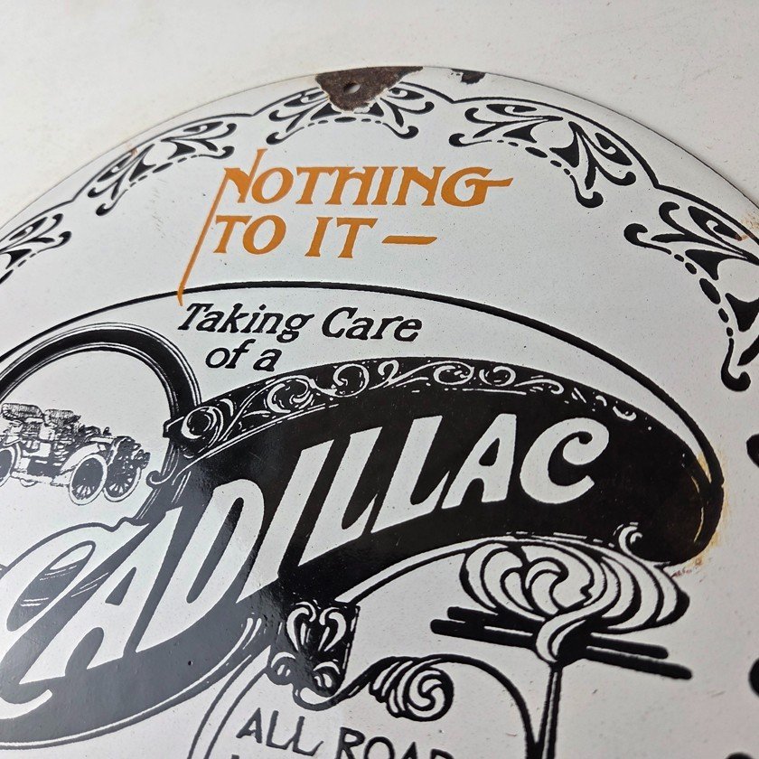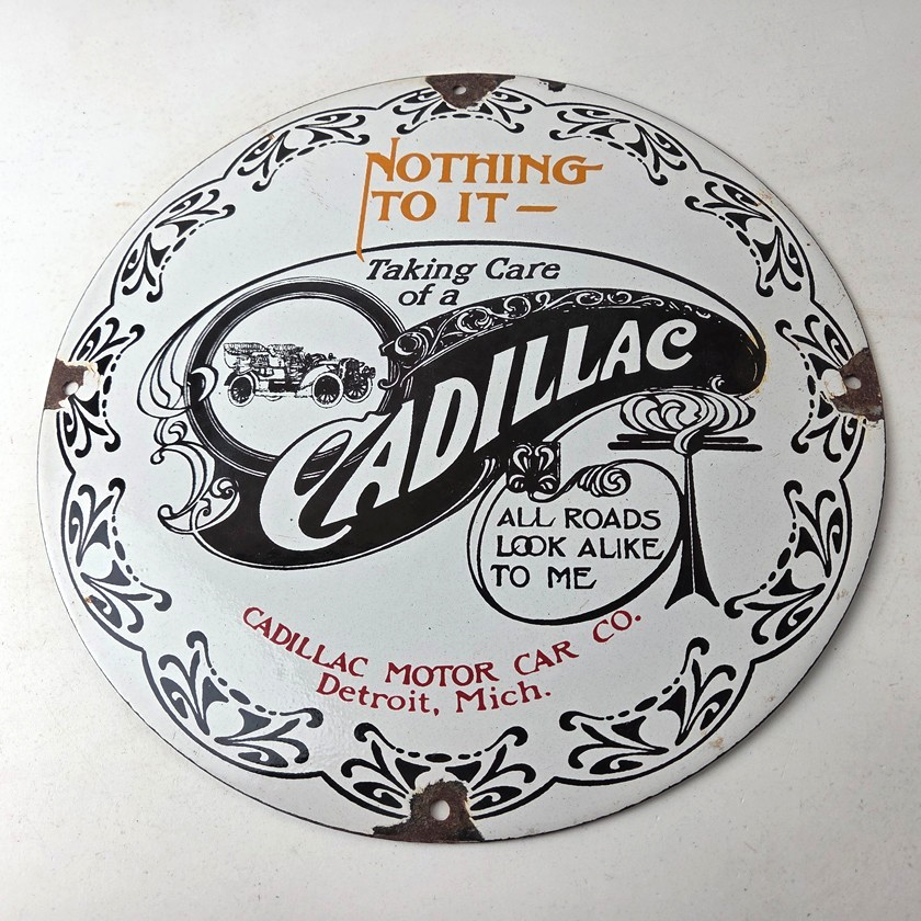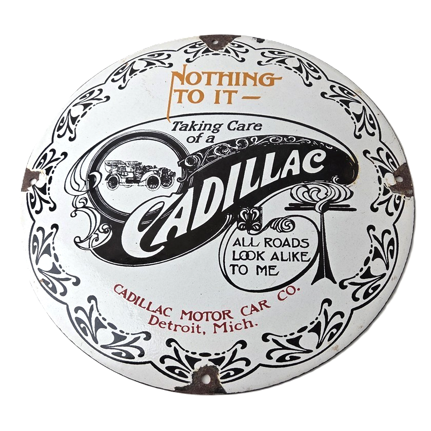 For sale is a Cadillac porcelain sign featuring an old car advertising for Cadillacs. Measuring at 12″, this sign is the perfect size to display in your garage or man cave.