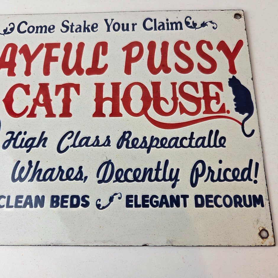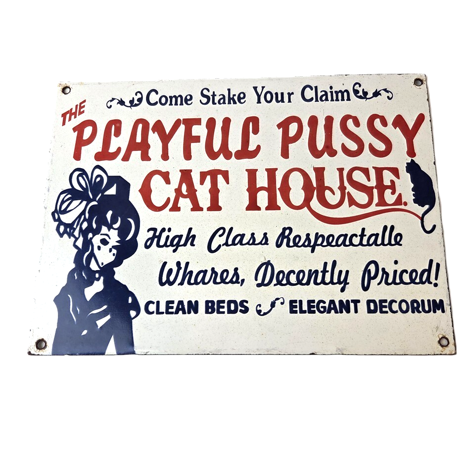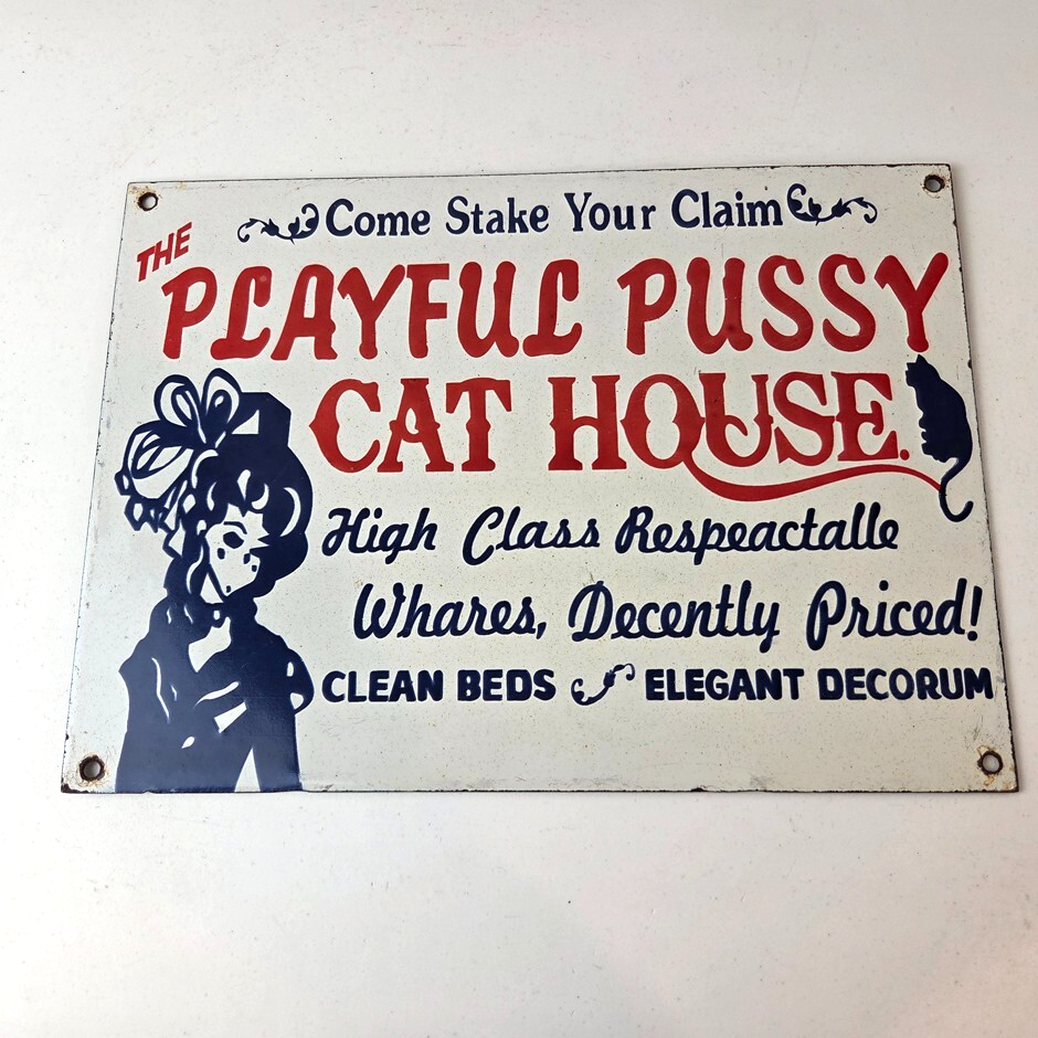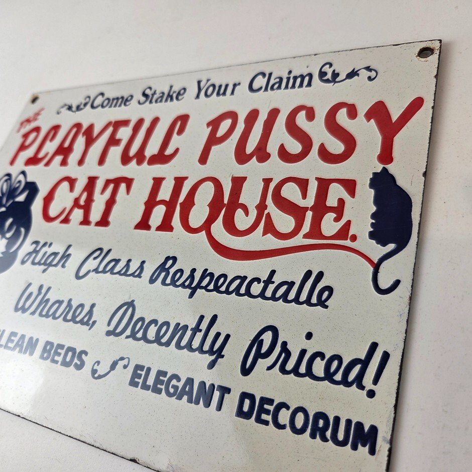 This vintage Cat House porcelain sign is a must-have. Measures 11″ x 8″ and has large red and black lettering with excellent porcelain on both sides.