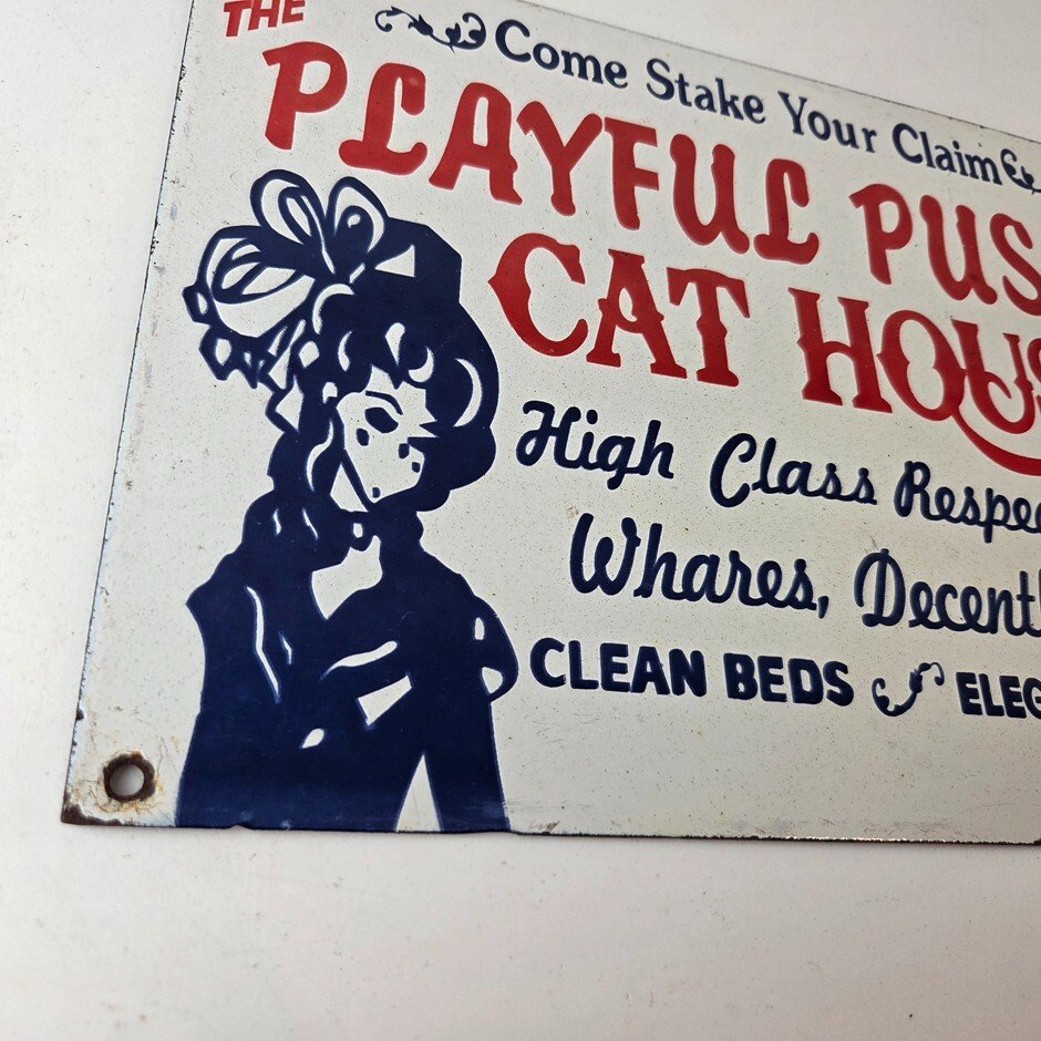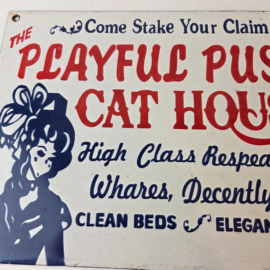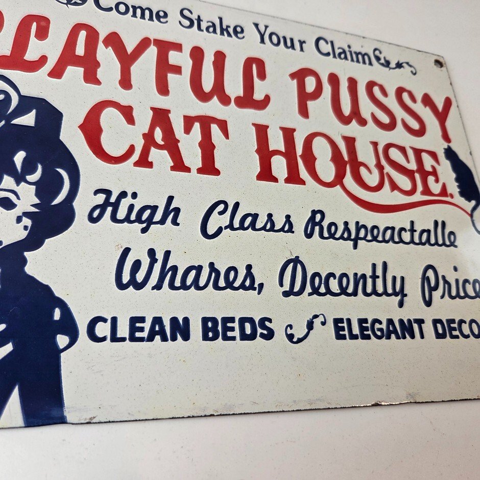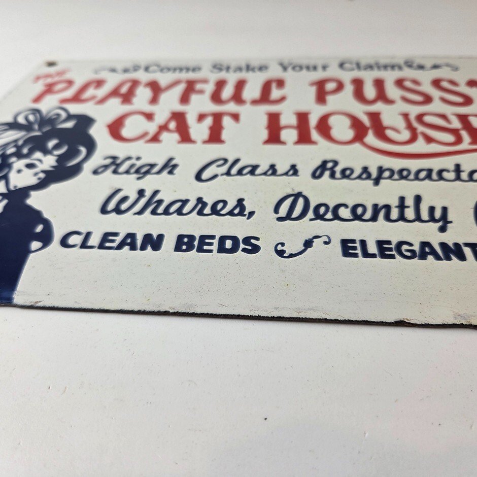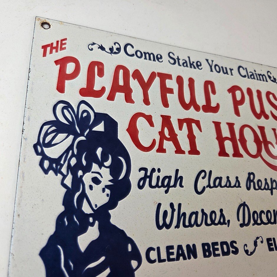 This vintage Cat House porcelain sign is a must-have. Measures 11″ x 8″ and has large red and black lettering with excellent porcelain on both sides.