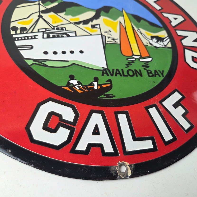 This vintage Catalina Island California porcelain sign features really nice graphic with large lettering around the rim. This sign is made of porcelain and measures 12″ across.