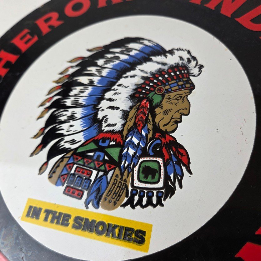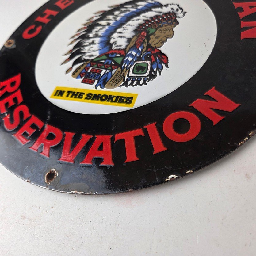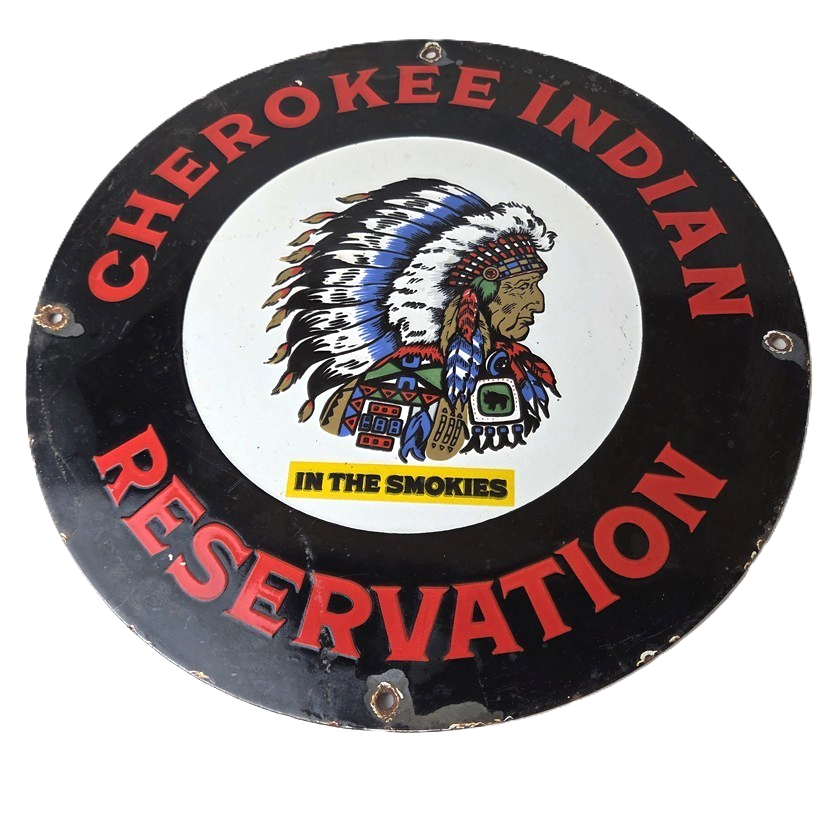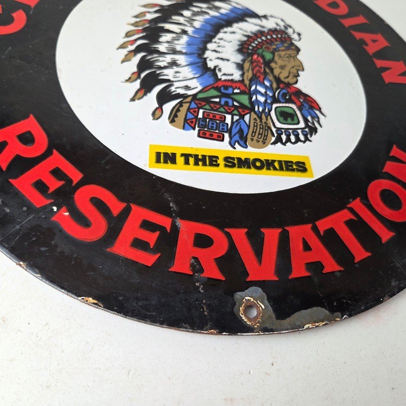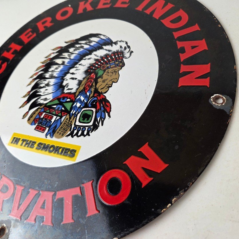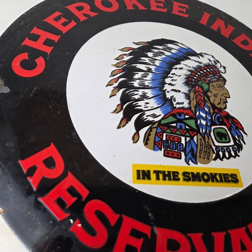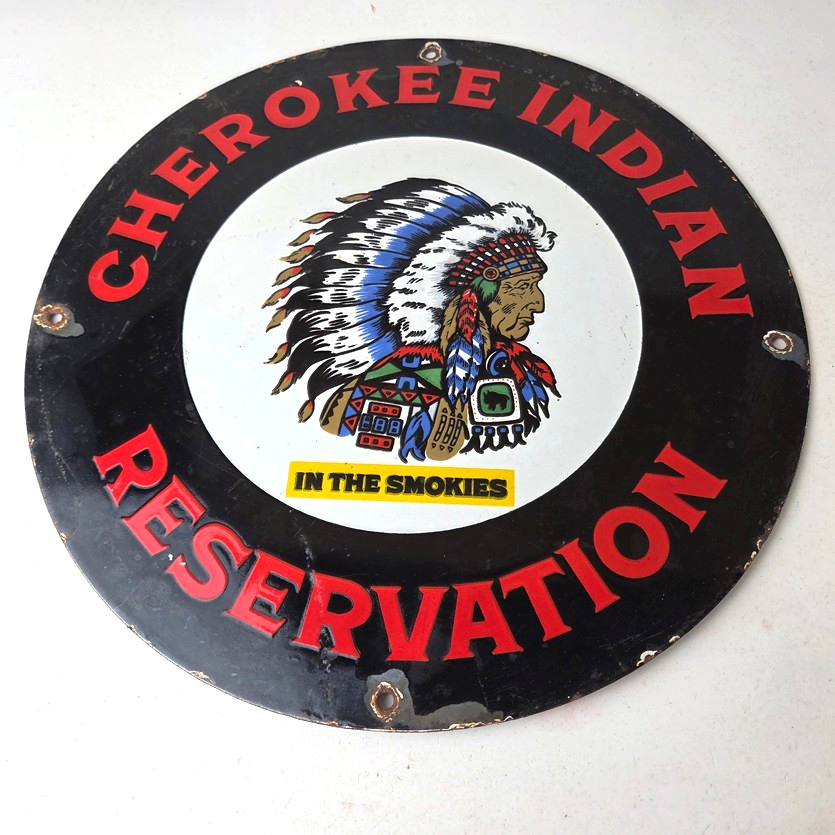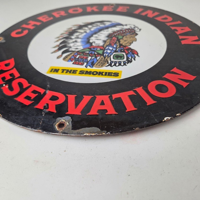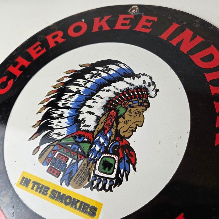 This sign will enhance your mancave, collection, shop, or garage. It is your chance to own a piece of Cherokee Indian Reservation advertising.