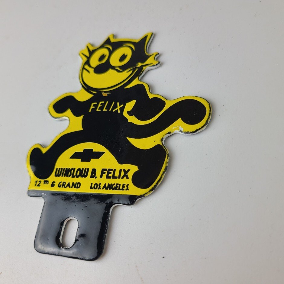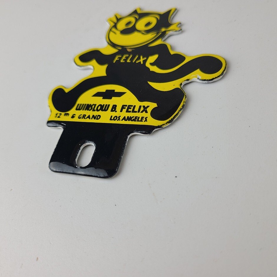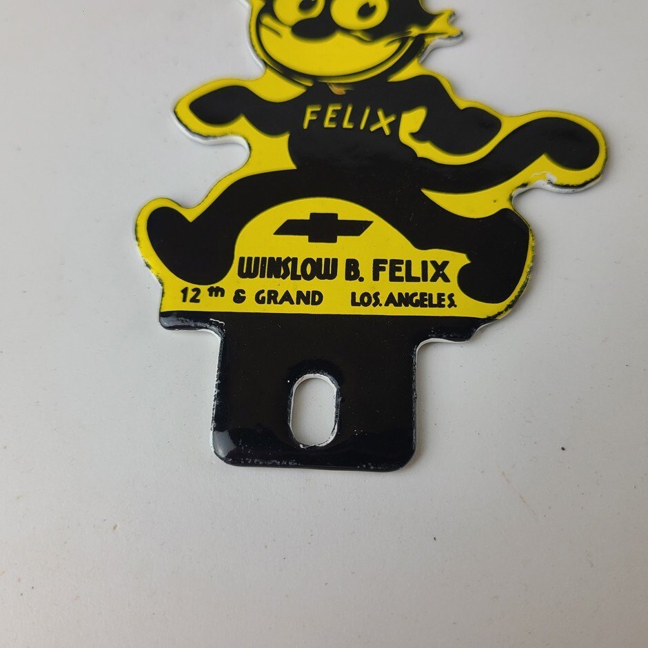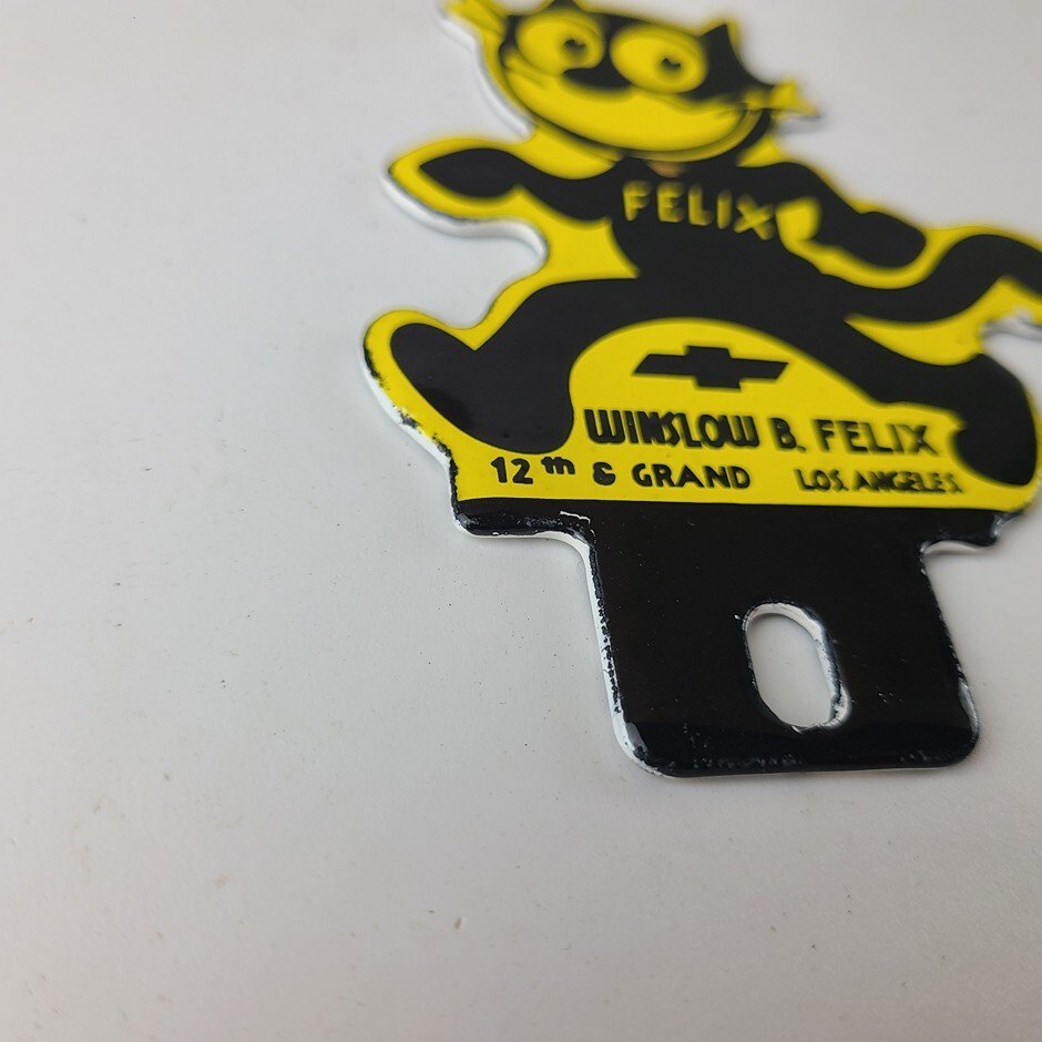 This vintage Chevrolet Felix the Cat porcelain license plate topper is a true gem for any collector of automotive, oil & gas memorabilia. featuring bold orange and black colors, this topper has excellent porcelain.