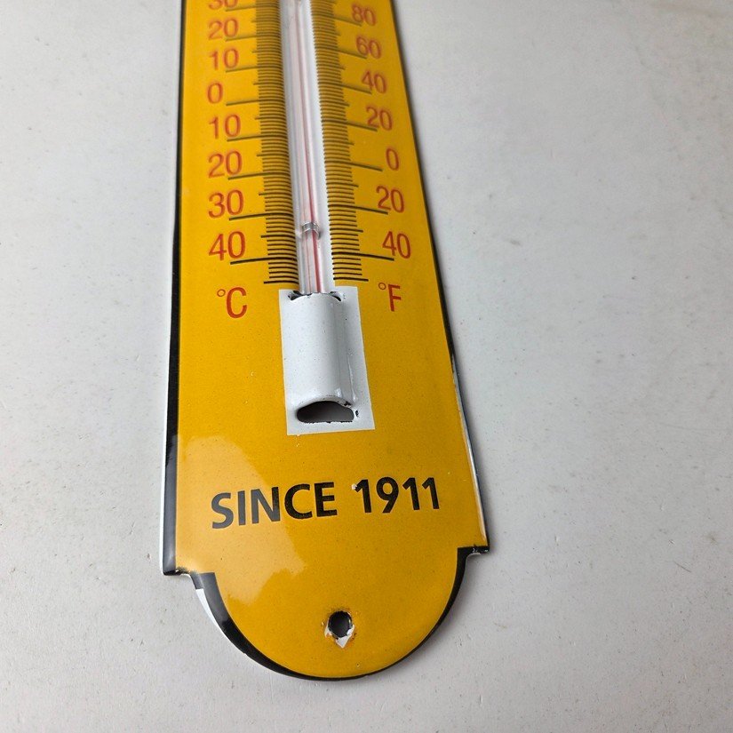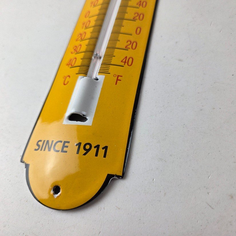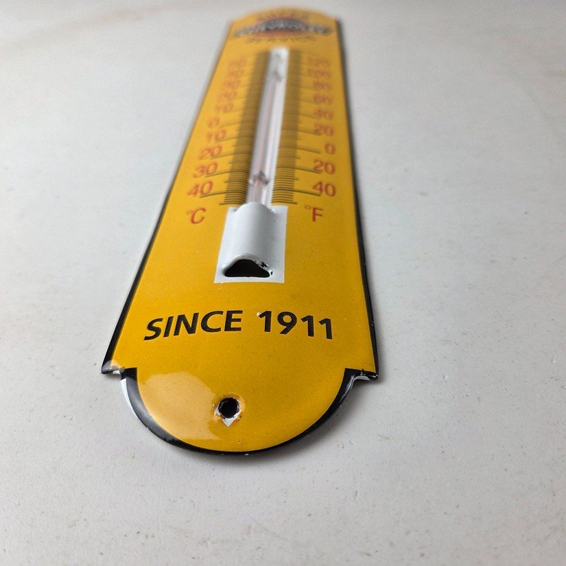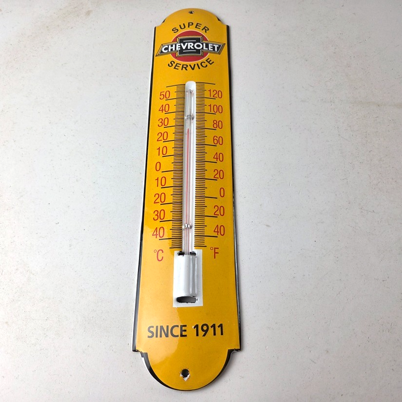 This vintage Chevrolet porcelain thermometer measures 11 3/4″ x 2 1/2″. This thermometer is a great addition to any collection. It features the iconic Chevy Bow Tie and has vibrant yellow color with excellent gloss.