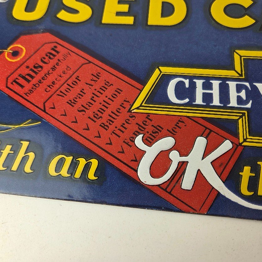 Measuring 12 inches by 6 inches, this sign features bold Chevrolet colors with the iconic Chevy Bowtie. This sign is perfect for any car enthusiast or collector of gas and oil memorabilia and would make a great addition to any advertising collection. Whether you’re a fan of classic automobiles or just love the aesthetic of vintage signage, this Chevrolet sign is sure to be a conversation starter.