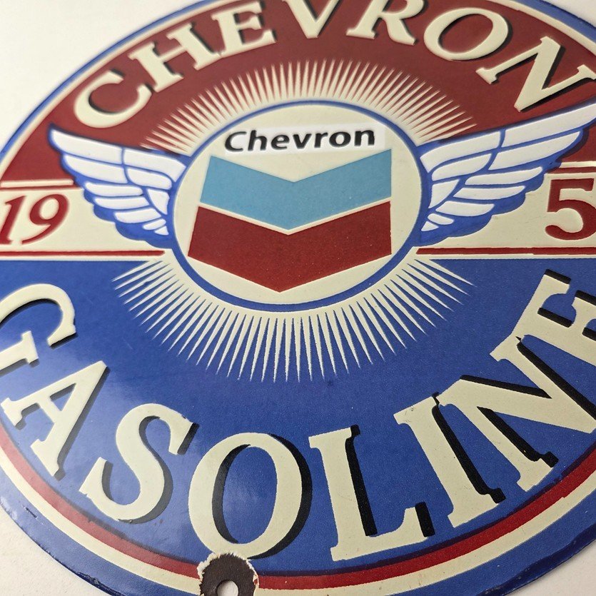 This vintage Chevron Gasoline porcelain sign features the iconic Chevron lettering with the logo of Chevron with wings. The sign has excellent colors with the Chevron brand name prominently displayed. It measures 12″ and has excellent porcelain.