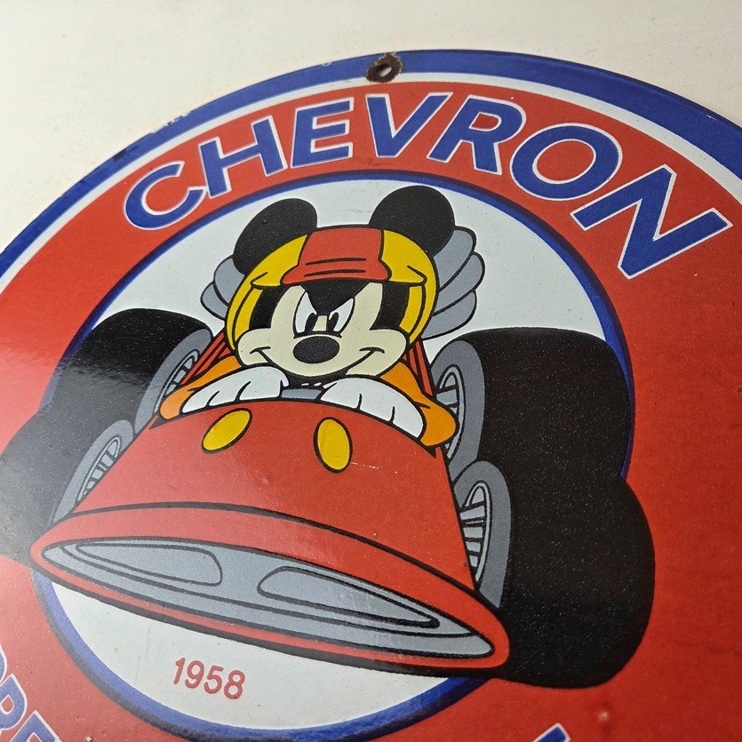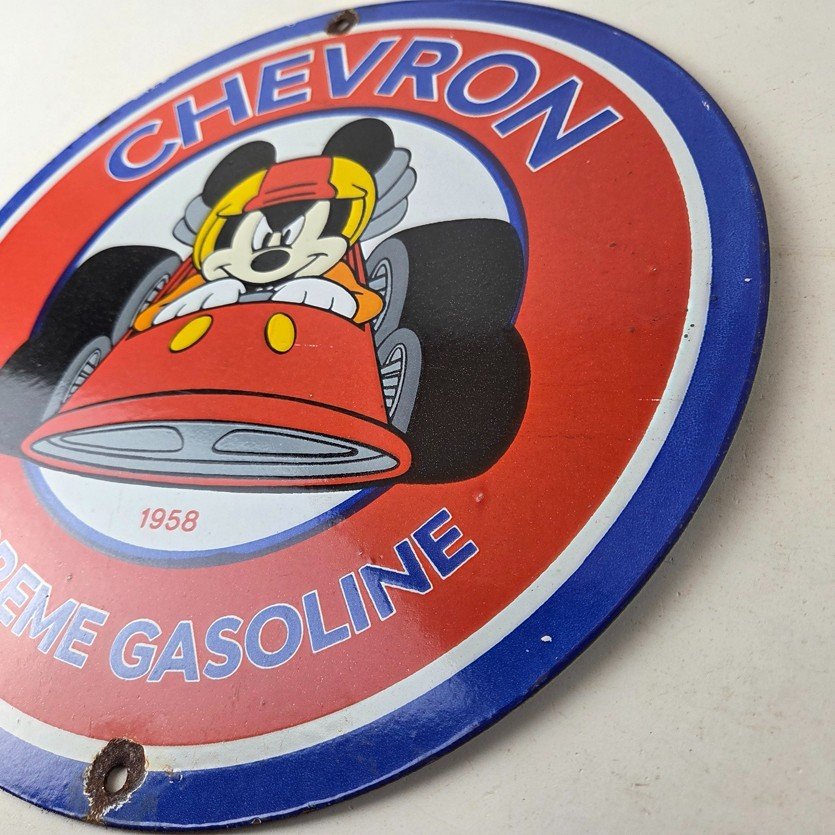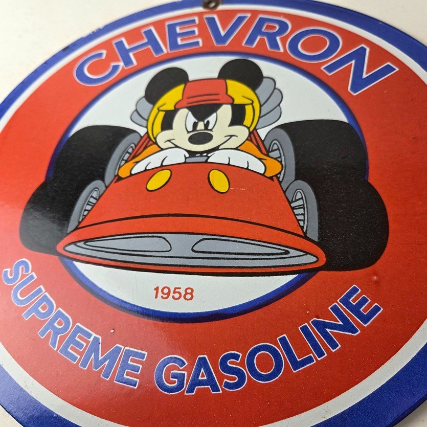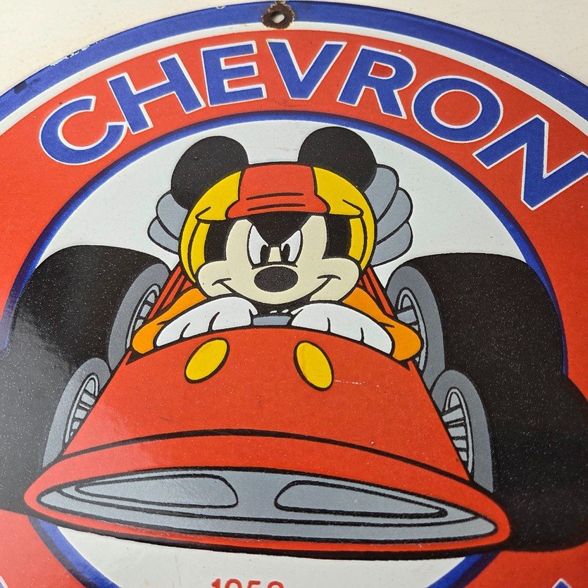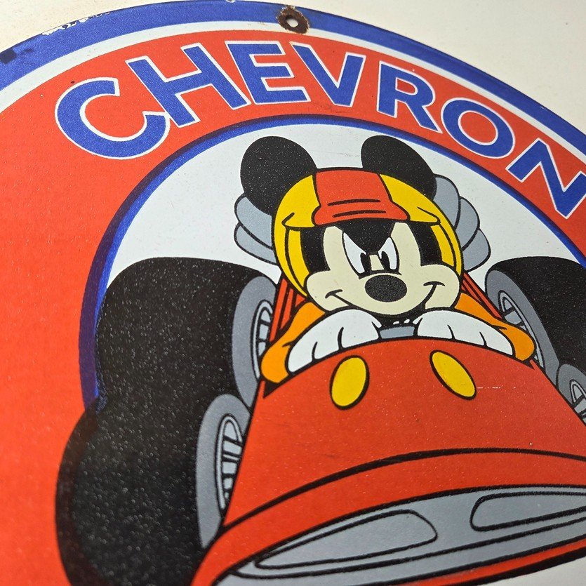 This vintage Chevron Gasoline porcelain sign features the iconic Chevron Gasoline brand and Mickey Mouse in a racecar. The sign has large Chevron Gasoline lettering.