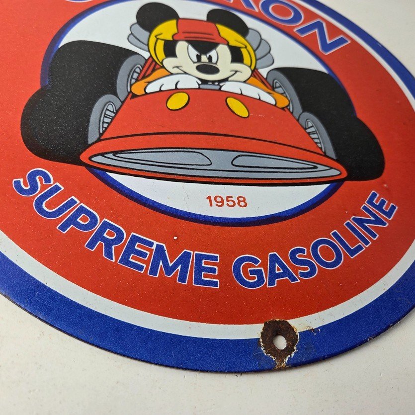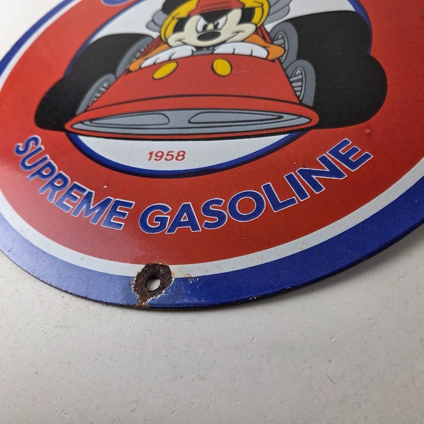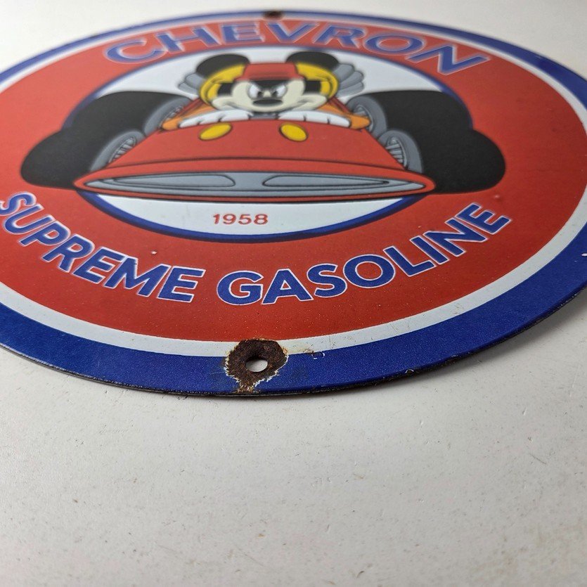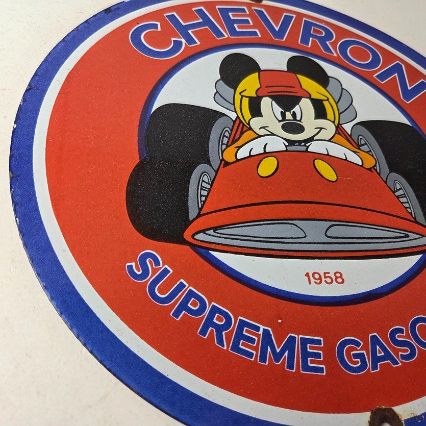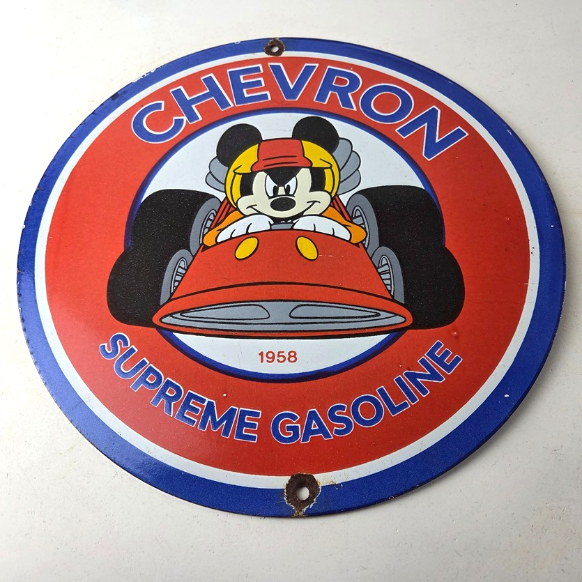 This vintage Chevron Gasoline porcelain sign features the iconic Chevron Gasoline brand and Mickey Mouse in a racecar. The sign has large Chevron Gasoline lettering.