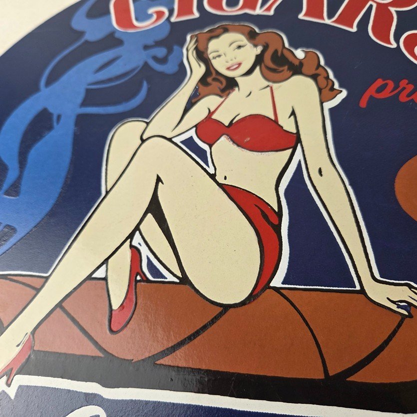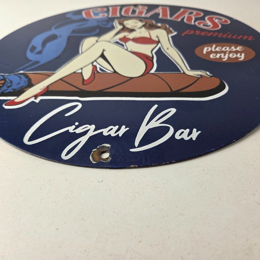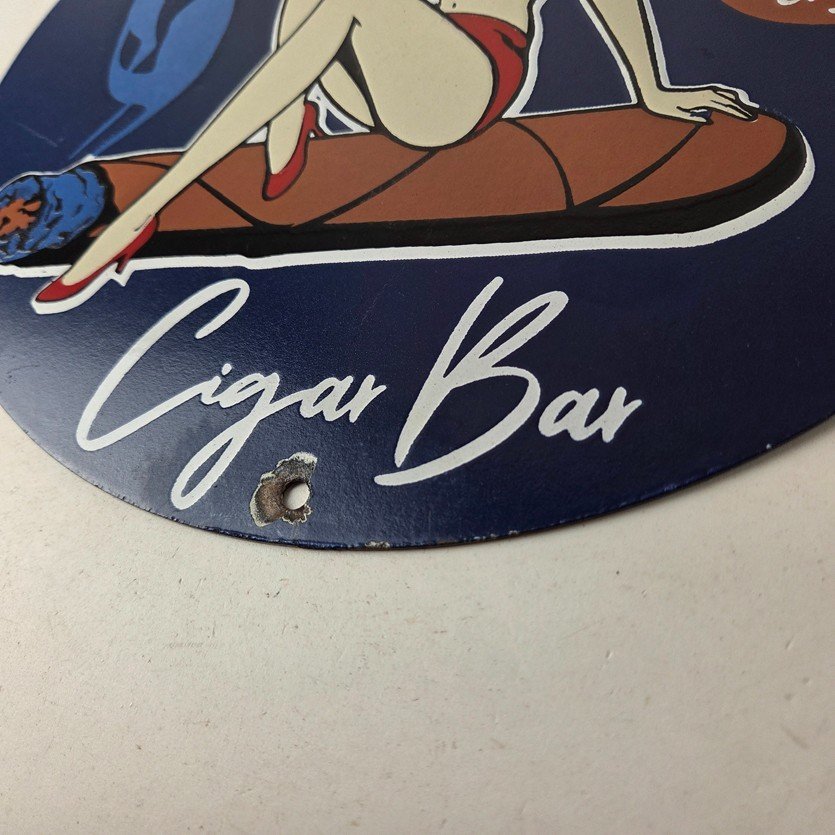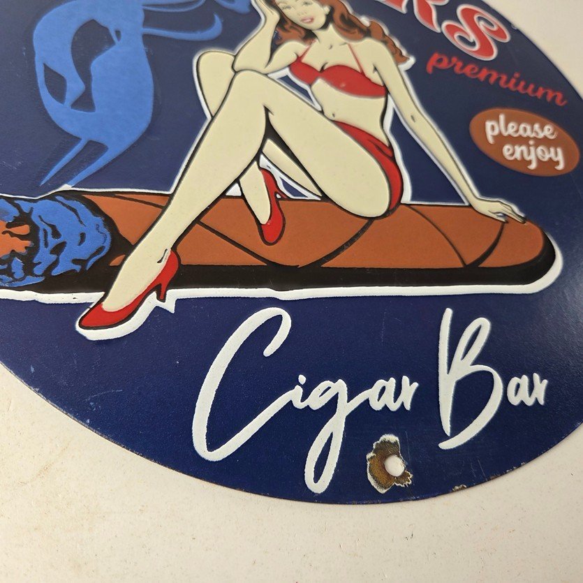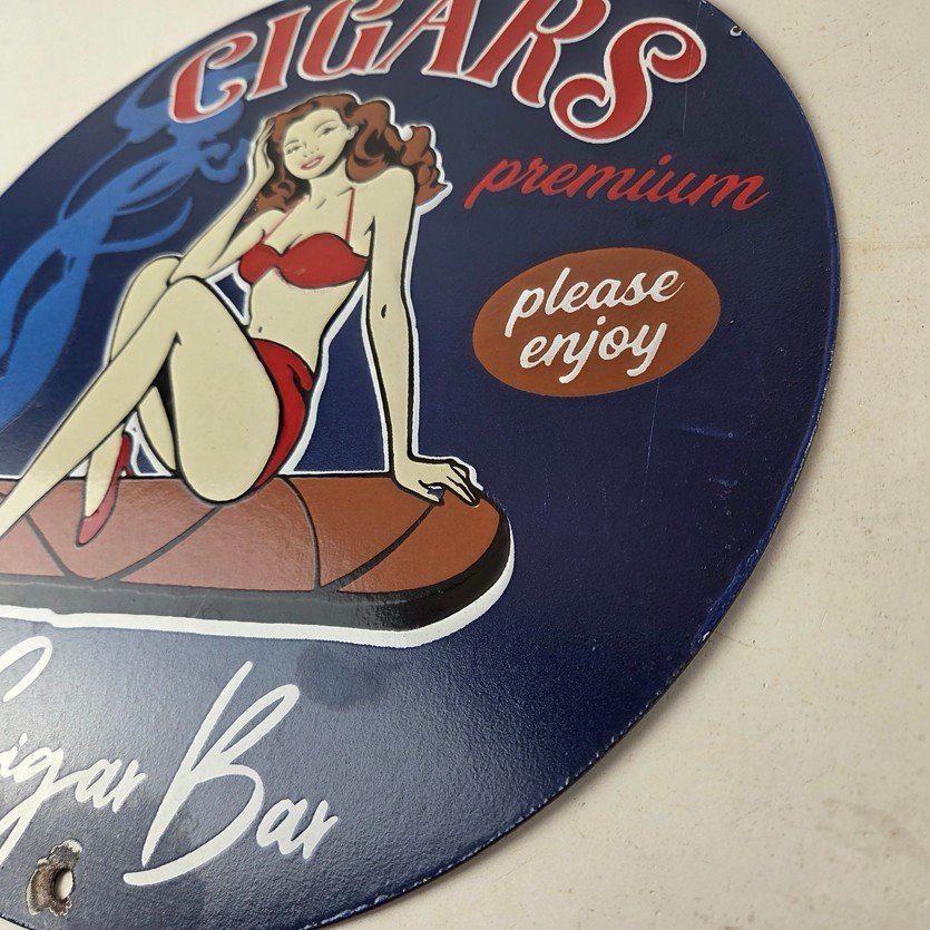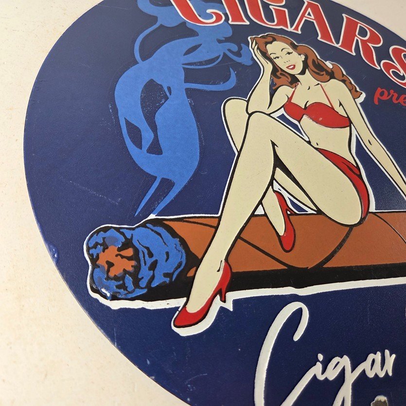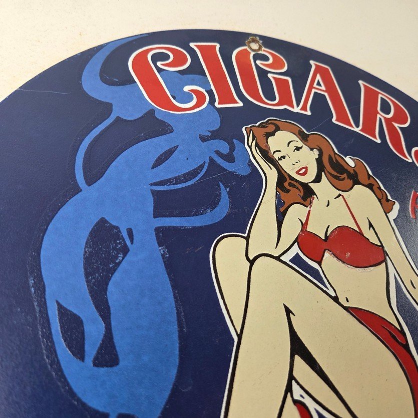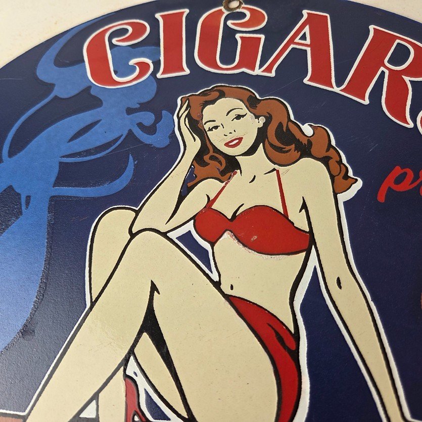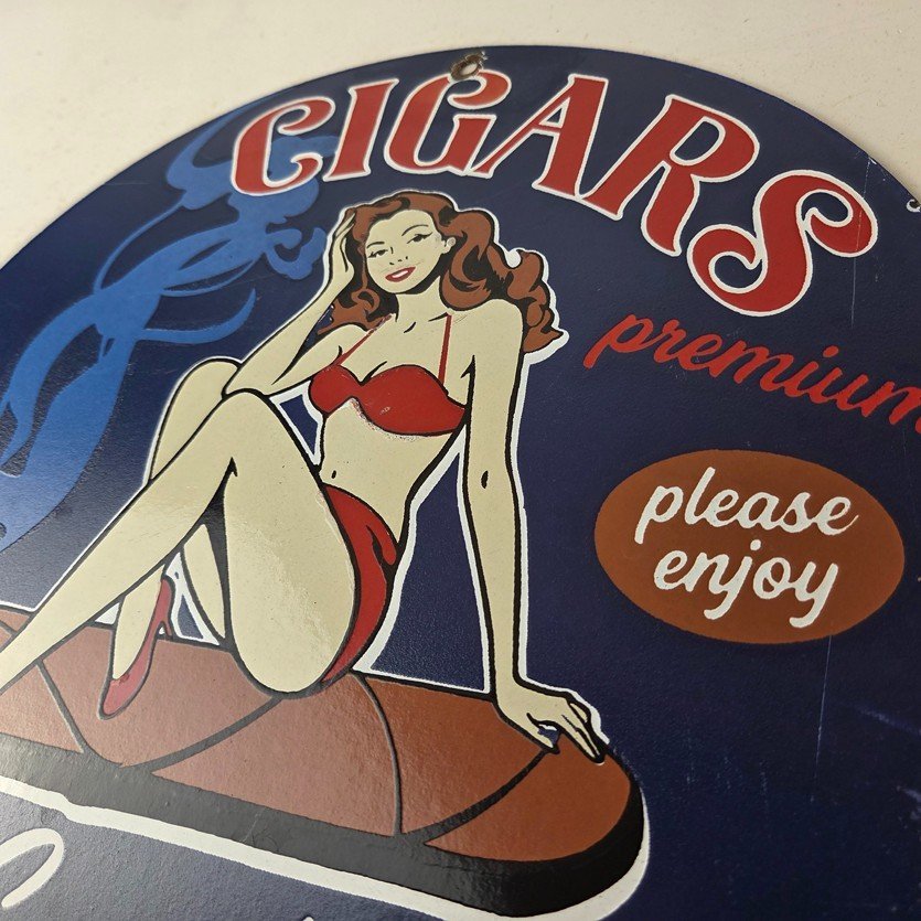 For sale is a vintage Cigar Porcelain Sign featuring the pinup girl. This unique piece is 12″ are suitable for those who collect porcelain tobacco signs.