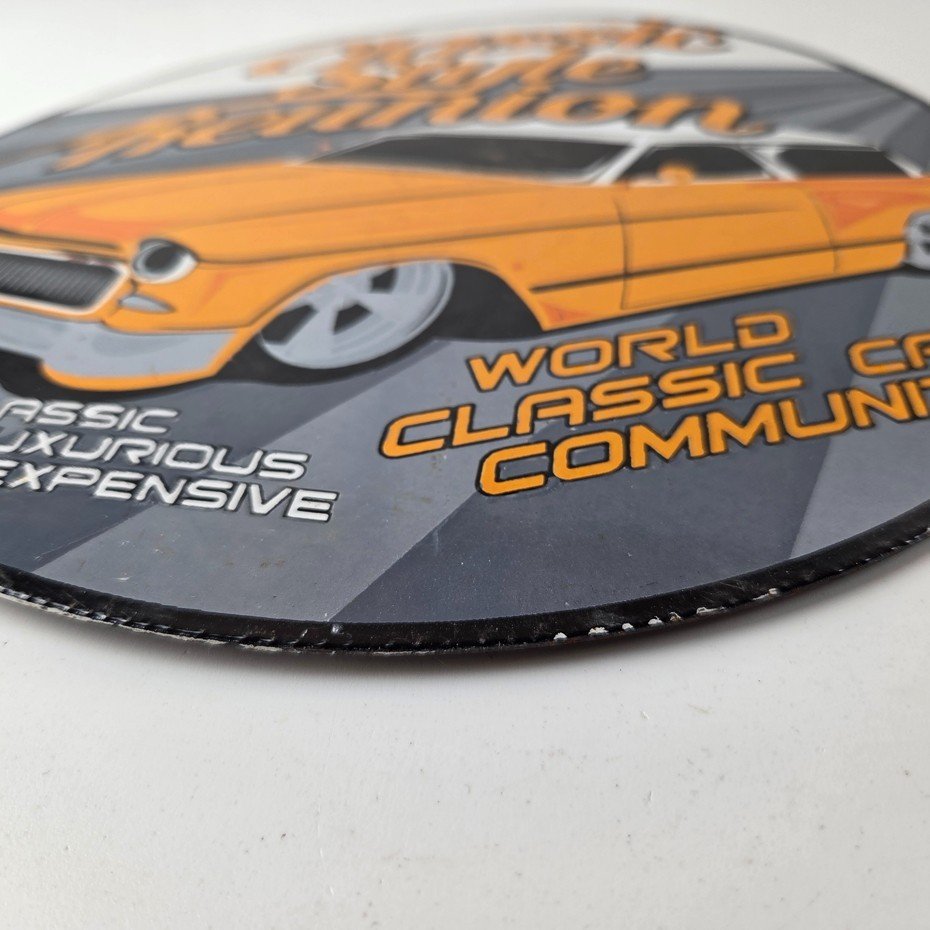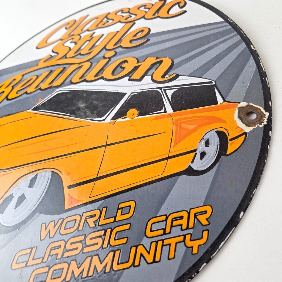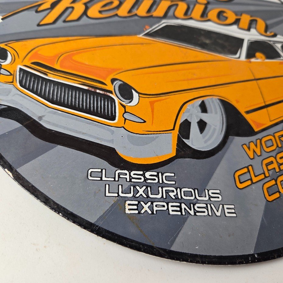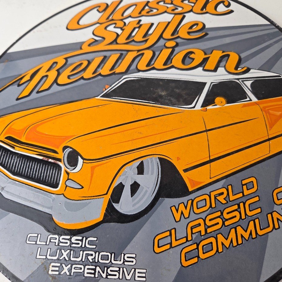 This vintage Classic Style Reunion porcelain sign features the iconic old luxury car on a porcelain enamel advertisement and measures 12″ across. This sign is in excellent condition and has vibrant orange colors.