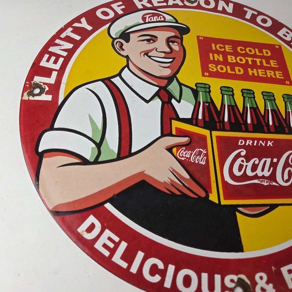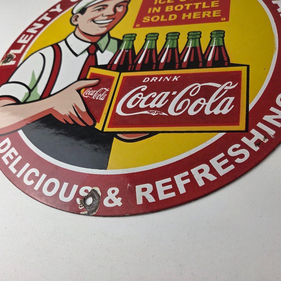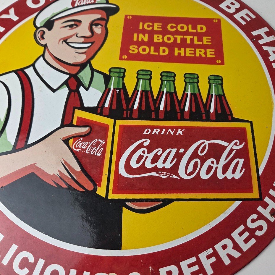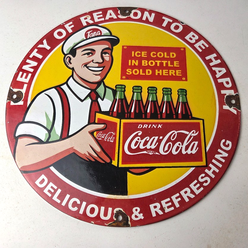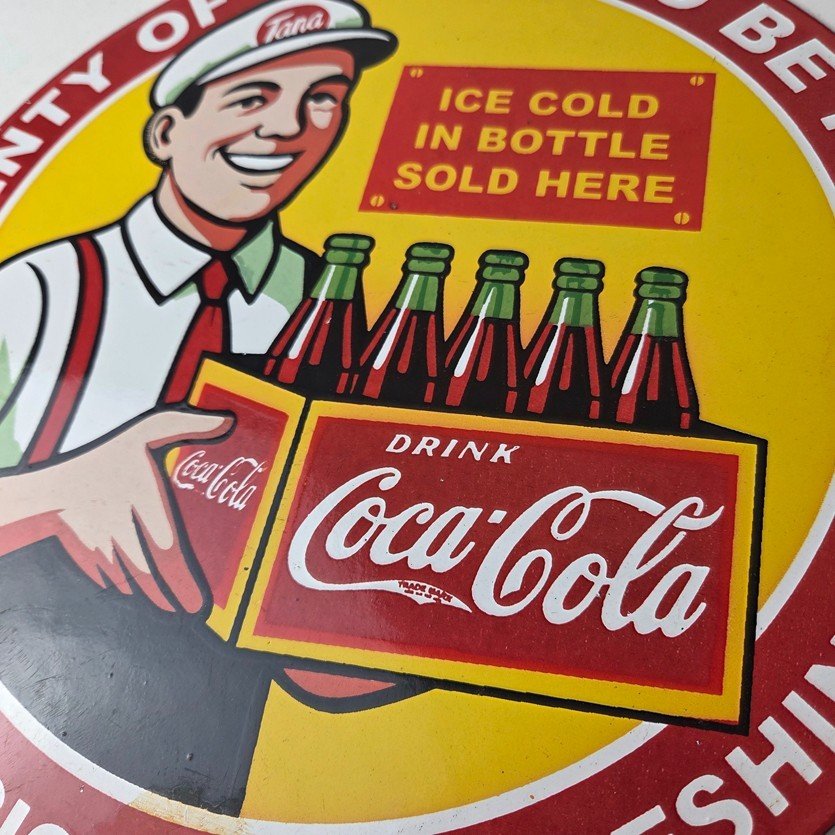 This is a vintage Coca Cola porcelain sign featuring the iconic Coca Cola bottles. If you love retro gas and oil memorabilia, or the classic soda signs, you will appreciate this sign. It measures 12 inches in diameter and is in excellent condition.