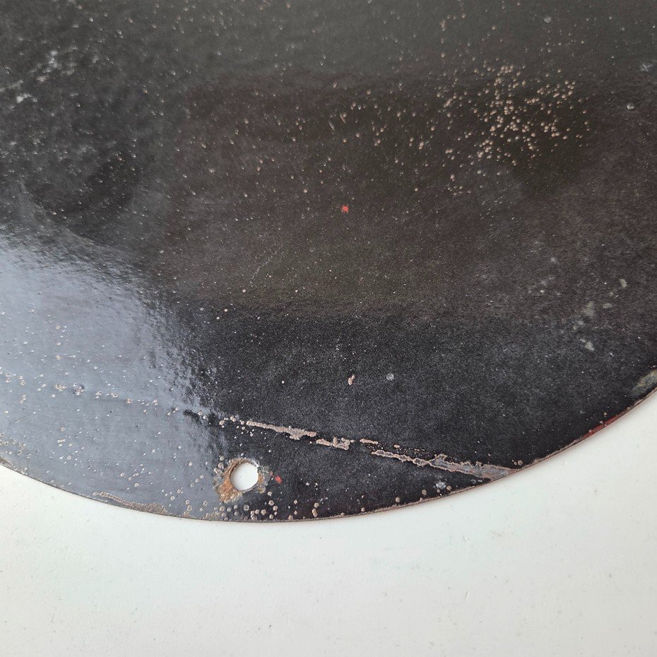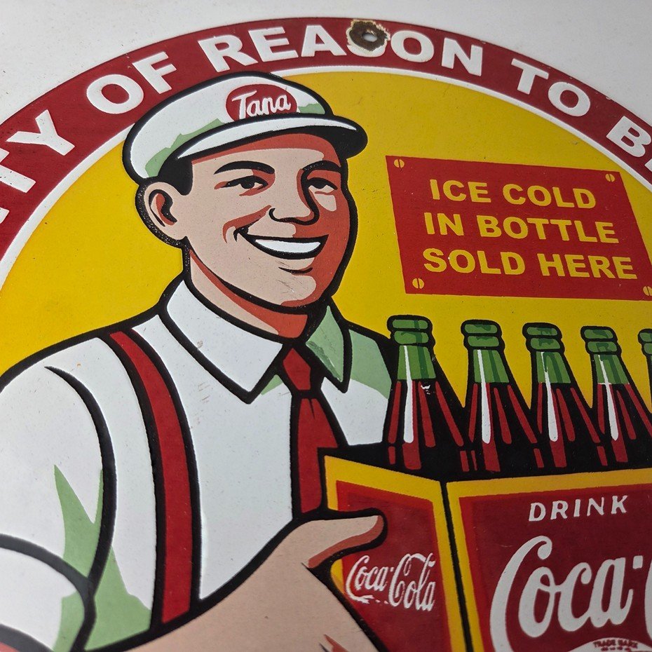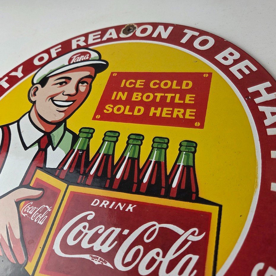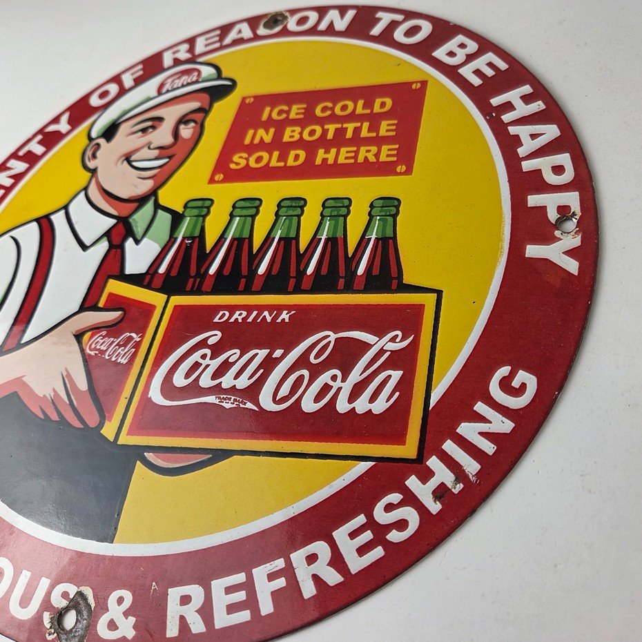 This is a vintage Coca Cola porcelain sign featuring the iconic Coca Cola bottles. If you love retro gas and oil memorabilia, or the classic soda signs, you will appreciate this sign. It measures 12 inches in diameter and is in excellent condition.