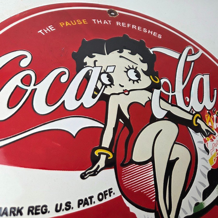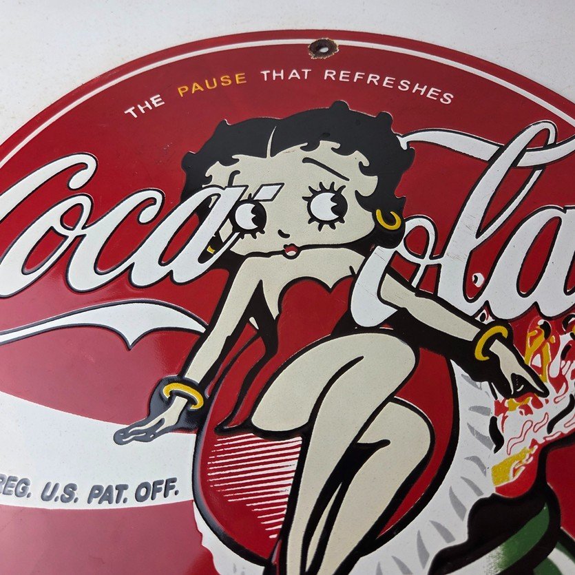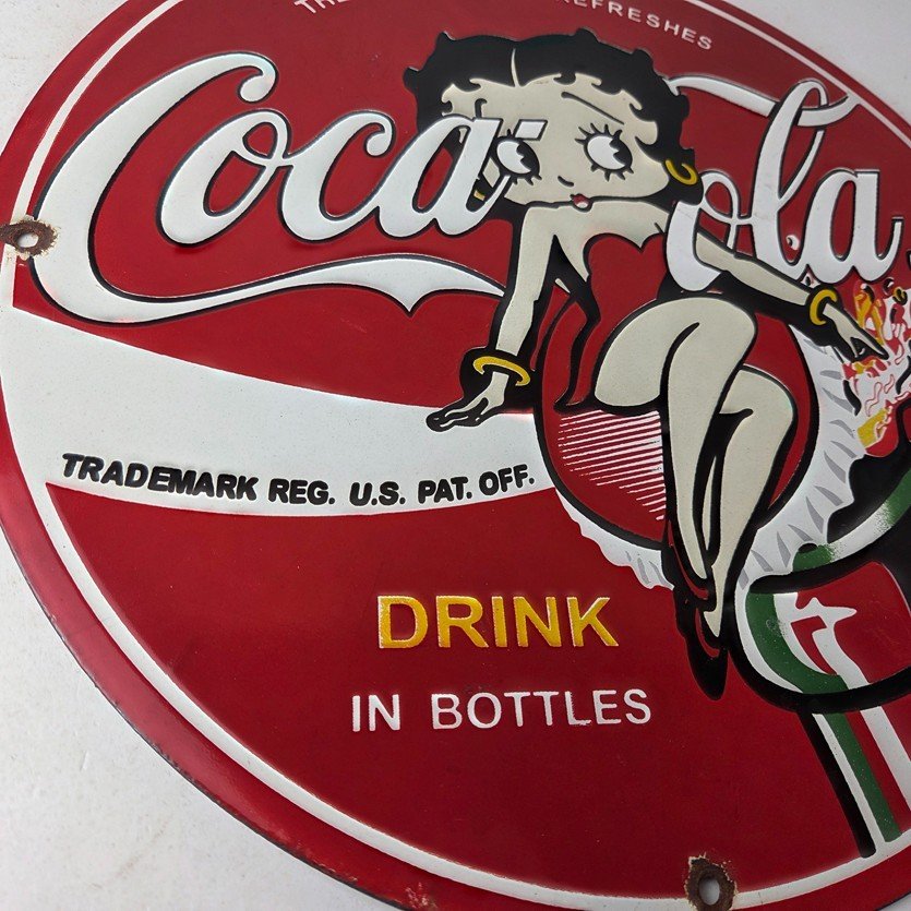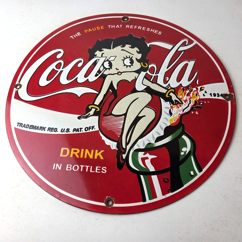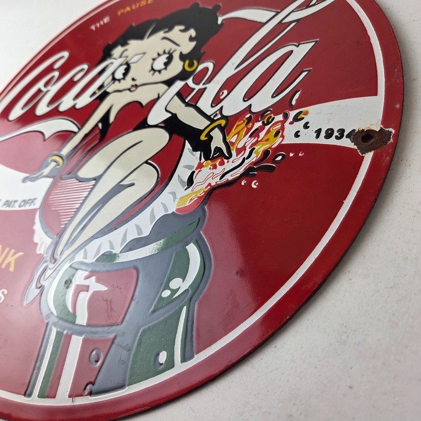This vintage Coca Cola porcelain sign features a striking design of Betty Boop with bold red colors and is made of porcelain material. It is perfect for display in a garage, shop, or man cave. The sign measures 12″ and is in excellent condition, with no major chips or cracks.