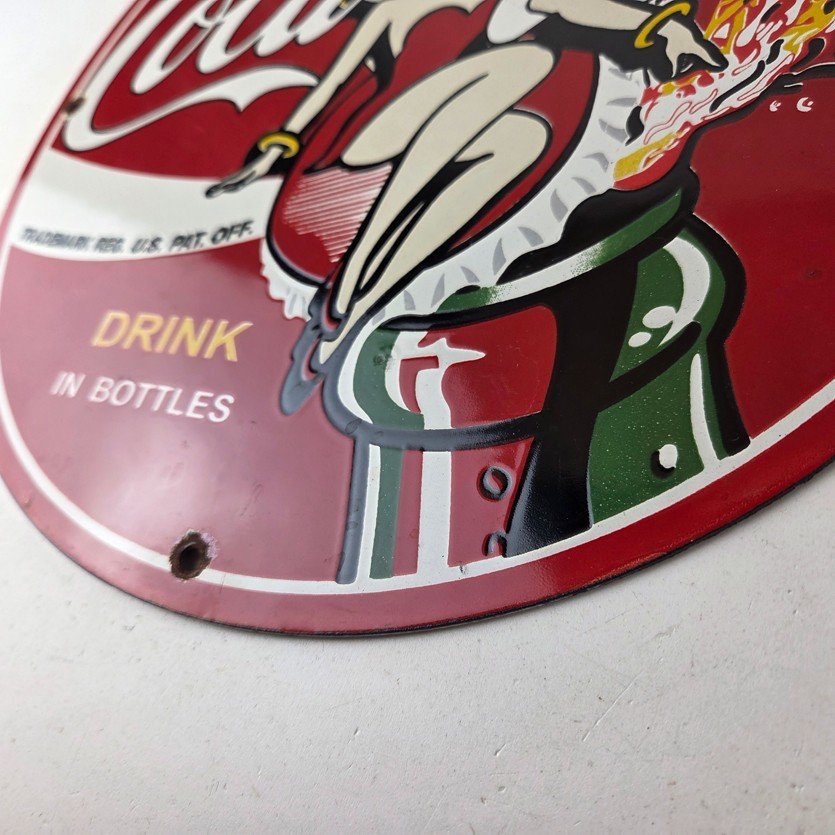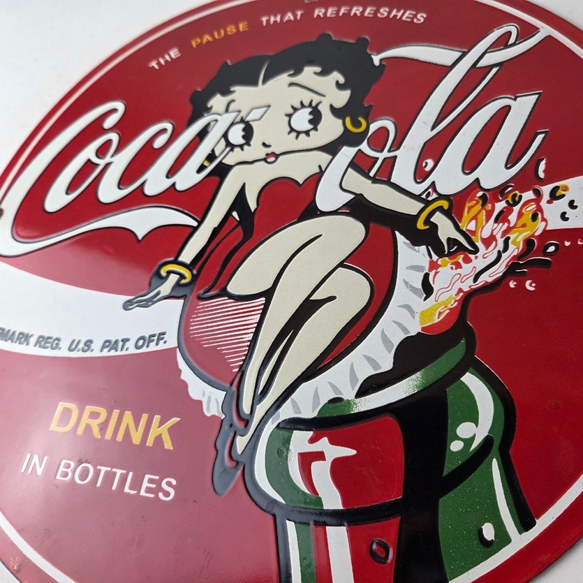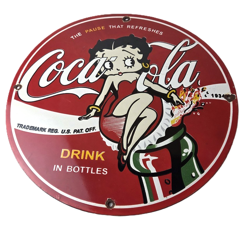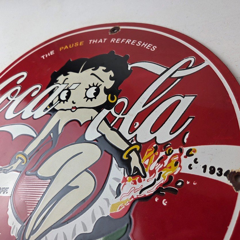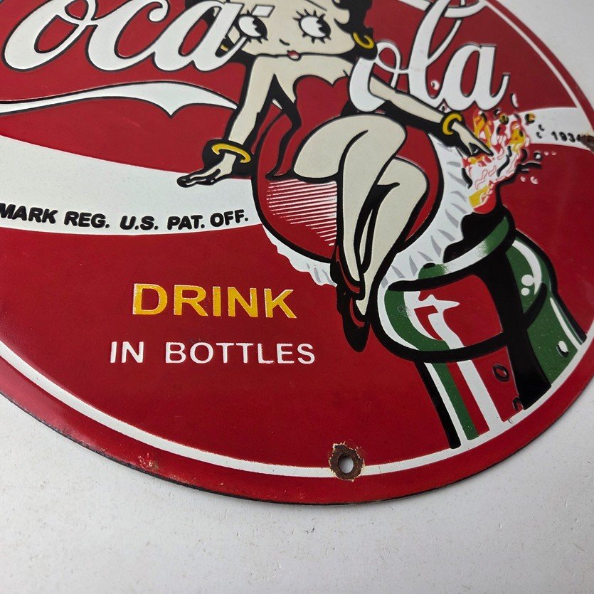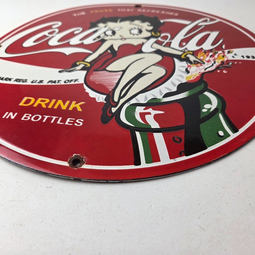 This vintage Coca Cola porcelain sign features a striking design of Betty Boop with bold red colors and is made of porcelain material. It is perfect for display in a garage, shop, or man cave. The sign measures 12″ and is in excellent condition, with no major chips or cracks.