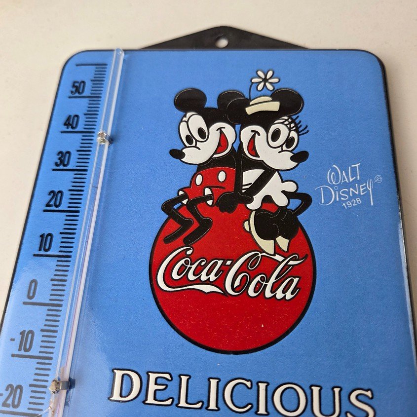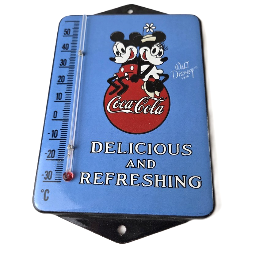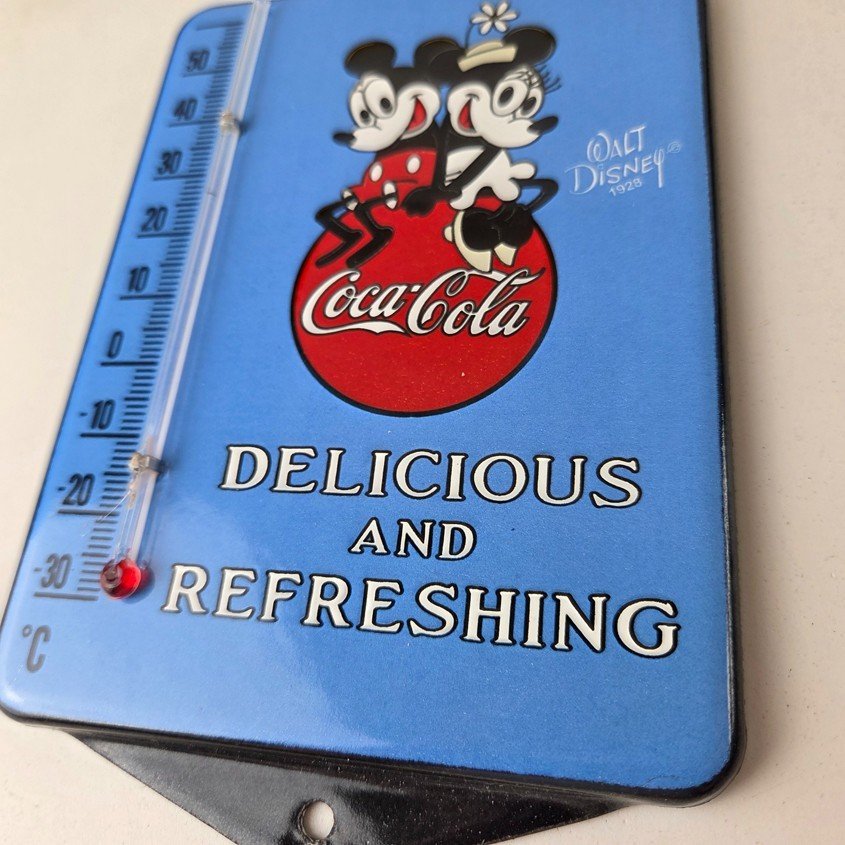 This vintage Coca-Cola thermometer is a must-have for any collector of soda and Walt Disney memorabilia. This thermometer features the iconic Disney graphic with the Coca Cola lettering. Measuring at 4 3/4 by 7 1/2 inches, it is a great size for display. With its bright colors and classic design this sign is sure to catch the eye of anyone who appreciates Soda advertising.