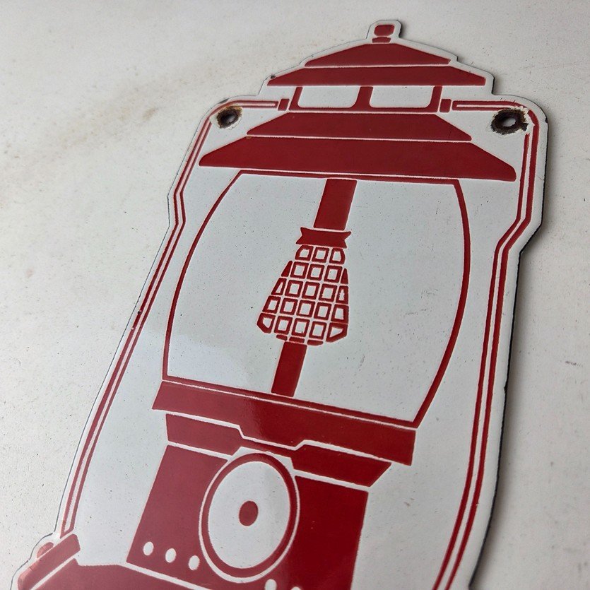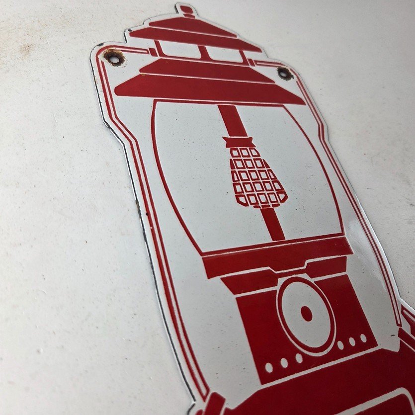 Measuring at 11 1/2″ by 5″, this sign is sure to catch the eye of anyone who enters your garage or shop. This sign features the iconic Coleman graphic, making it a great addition to any vintage collection. The timeless design and durable porcelain construction make this sign a great piece that will add character and charm to any space like your man cave, collection, shop, or garage.