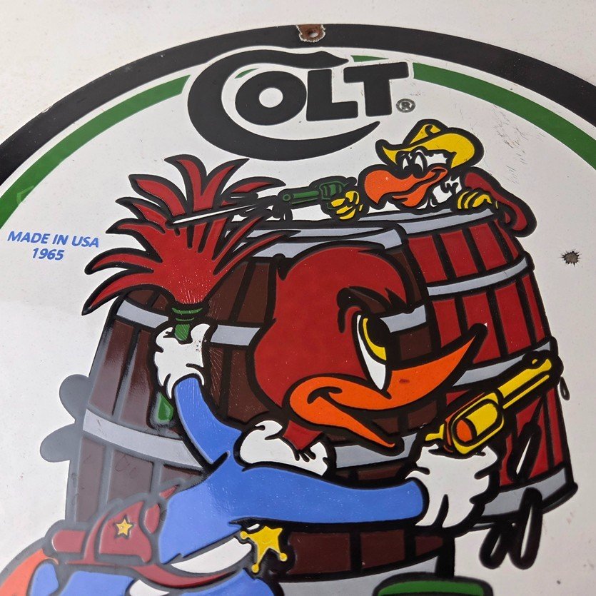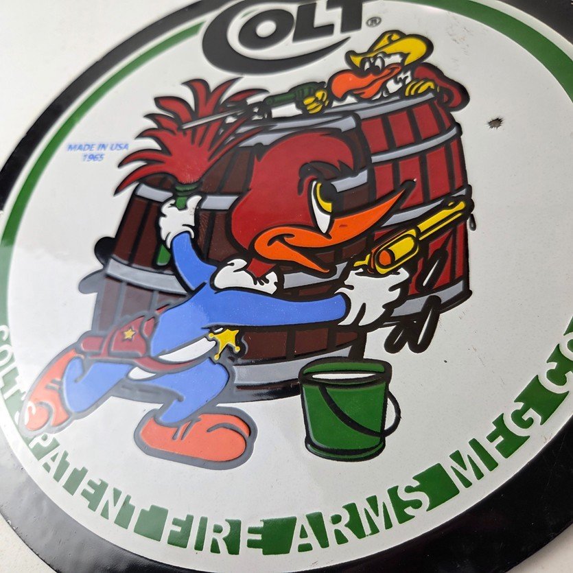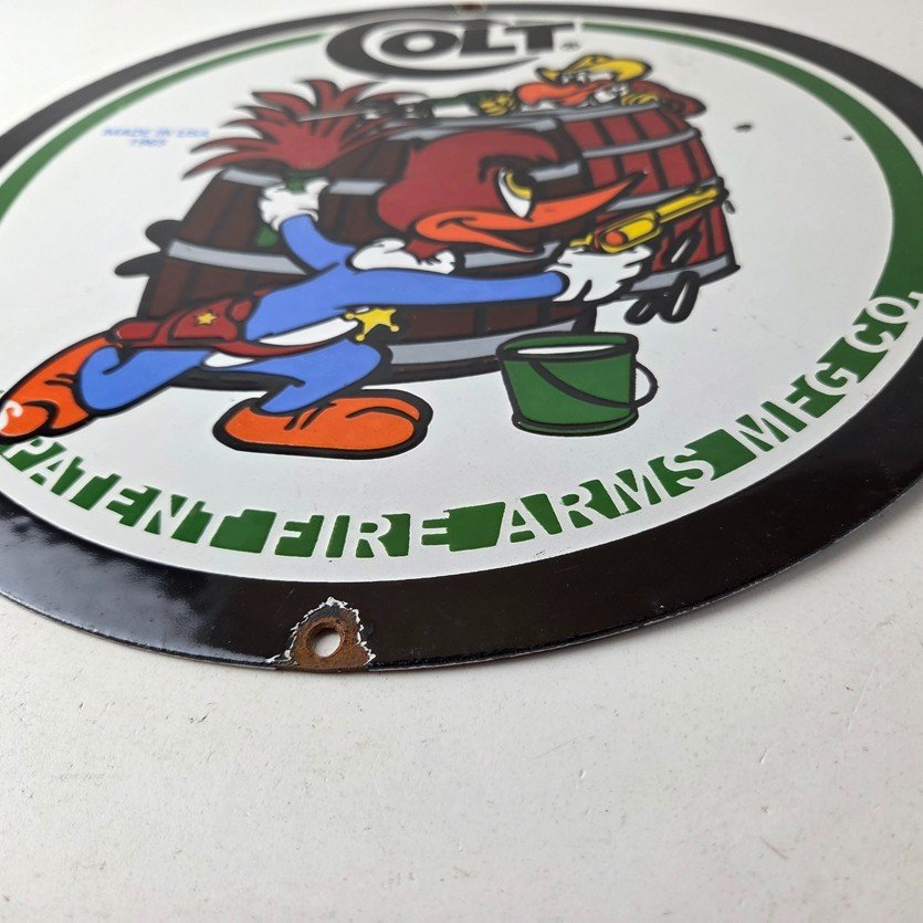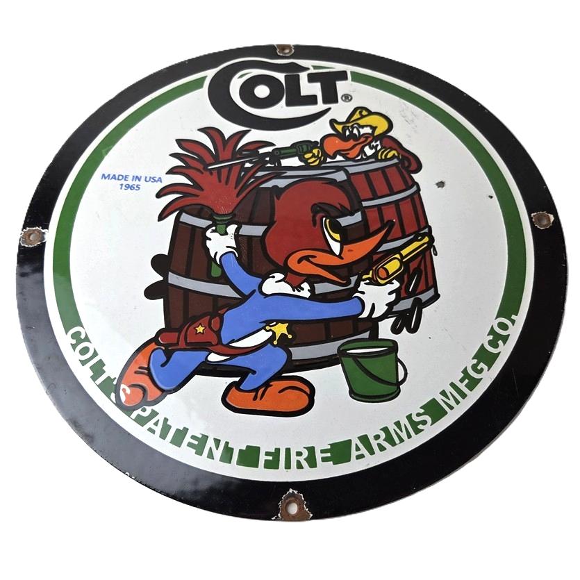 Add a vintage touch to your gas station or collection with this eye-catching Colt Firearms porcelain sign. Featuring a brown design, this 12-inch sign is a must-have for any gas and oil or advertising enthusiast. The sign showcases the iconic Colt pistols and guns graphic, making it a unique and collectible item for fans of the brand and theme. Whether you’re looking to decorate your man cave, she shed, bar or garage, or simply add to your collectibles, this porcelain sign is an excellent choice.