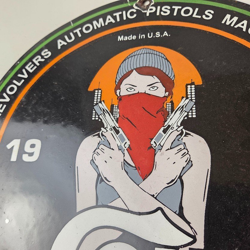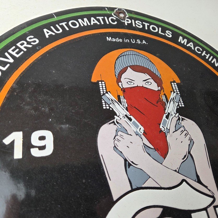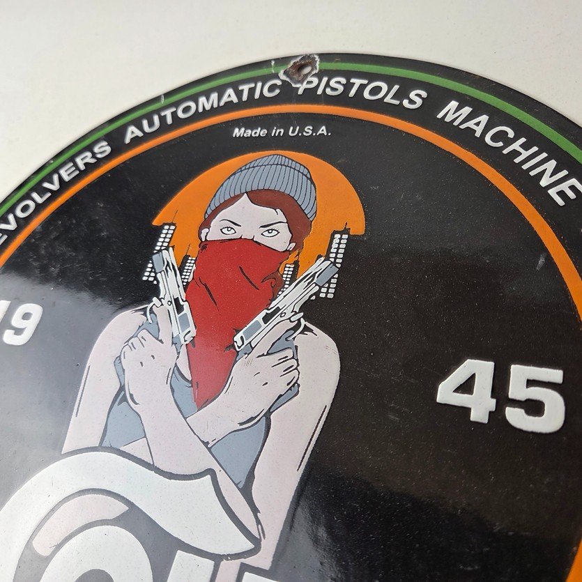 This vintage Colt Firearms porcelain sign features the iconic Colt brand and the girl with the two pistols in the center, advertising for pistols, machine guns and revolvers. The sign is in excellent condition and excellent porcelain and colors.