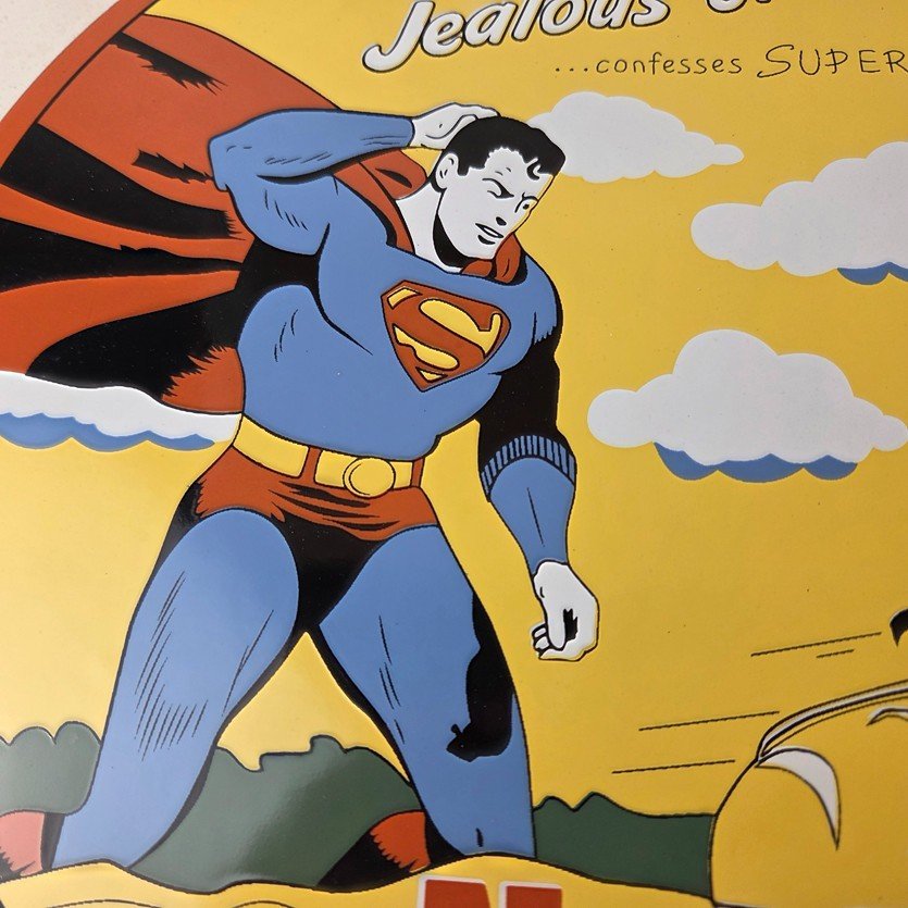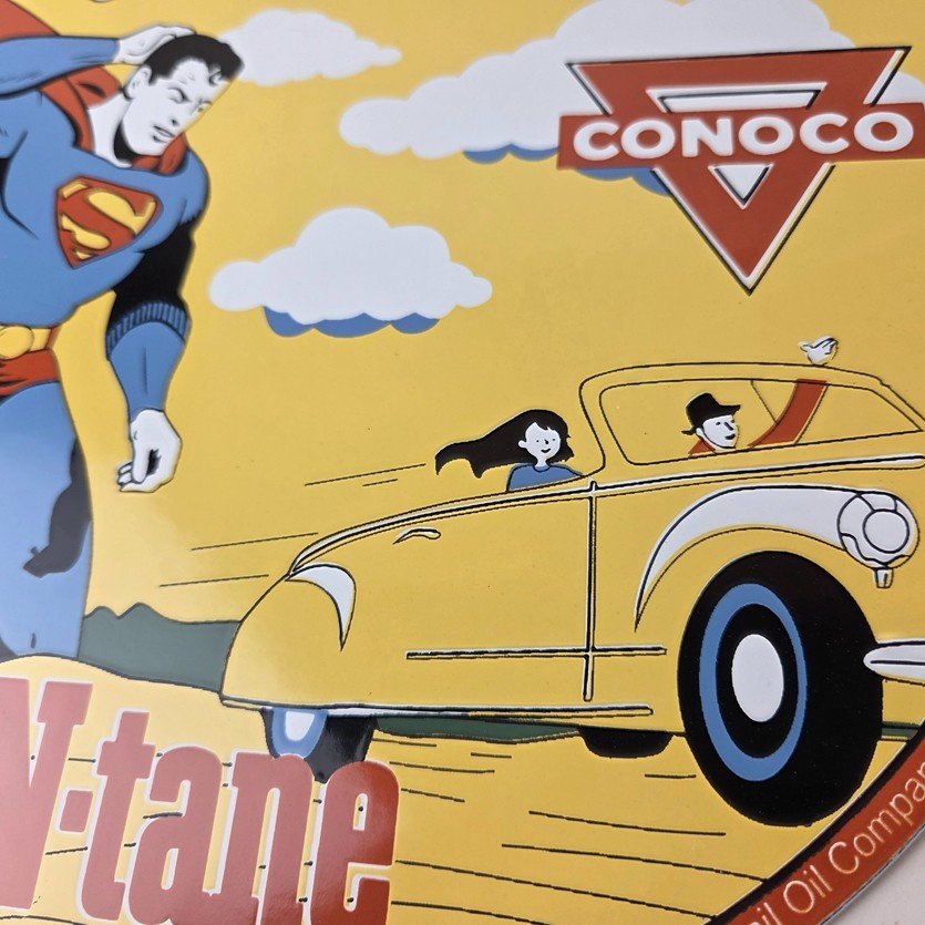This vintage Conoco Gasoline porcelain sign features N-Tane octane and the iconic character of Superman from DC Comics. The sign boasts vibrant colors, making it perfect for any collector of gas and oil advertising memorabilia. The sign is made of porcelain and is in excellent shape, showcasing the durability and craftsmanship of vintage gas pump signs.