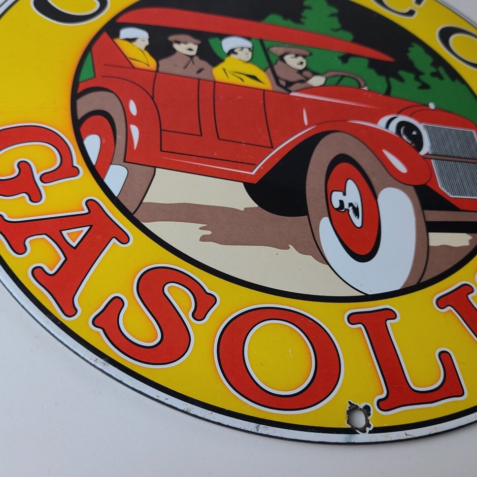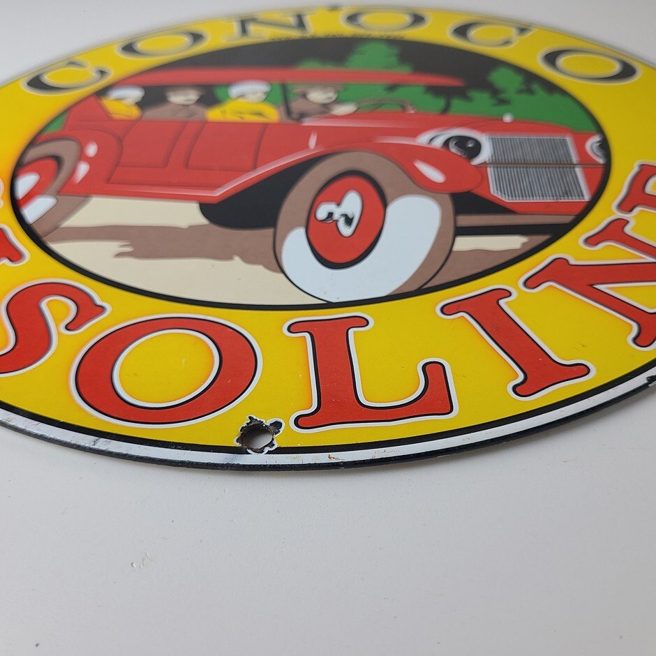 This vintage porcelain sign is a must-have for collectors and fans of Conoco Gasoline. With its vibrant colors, this sign is sure to catch the eye of anyone in the room. The sign features the iconic Conoco Gasoline lettering, making it a unique and amazing addition to any collection. Whether you’re a fan of gas and oil memorabilia or an old automobile enthusiast, this sign is the perfect piece to display.
