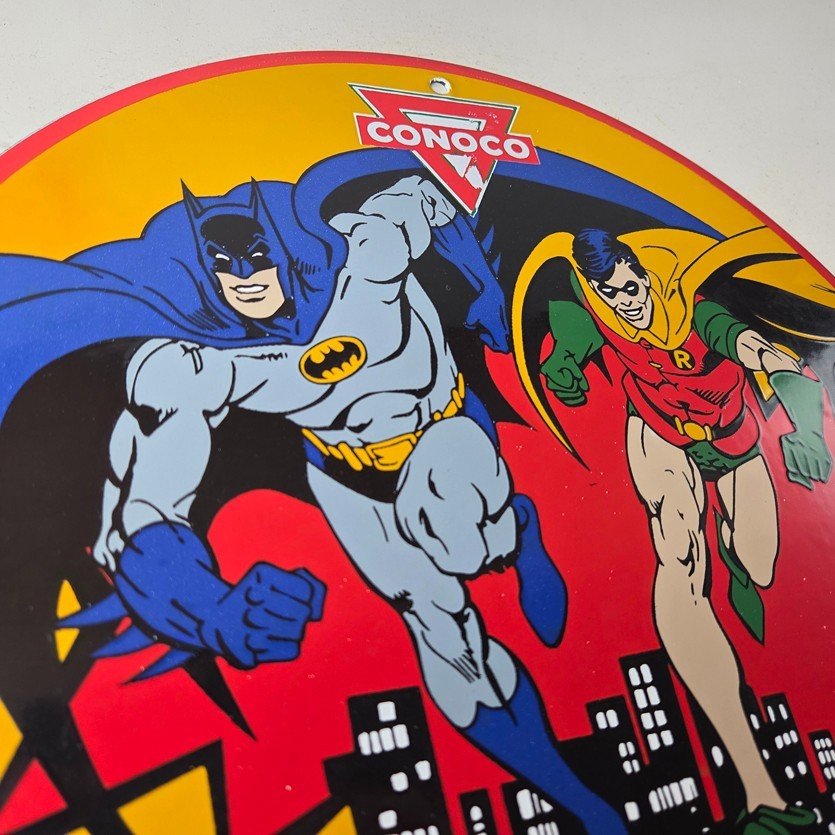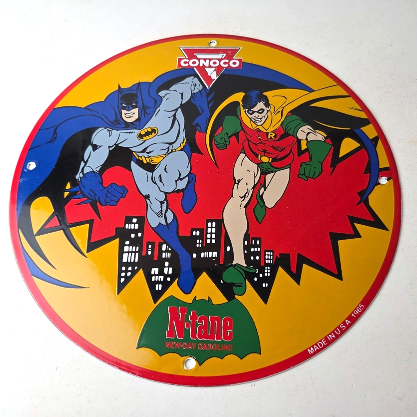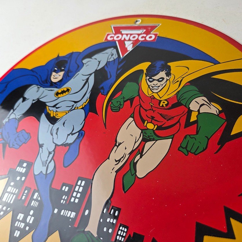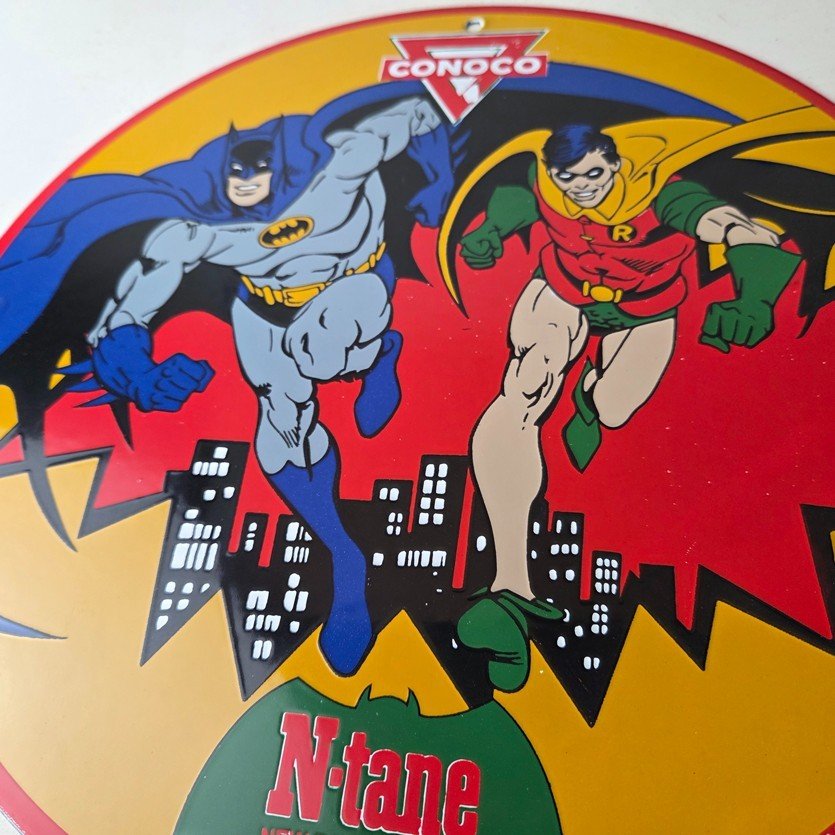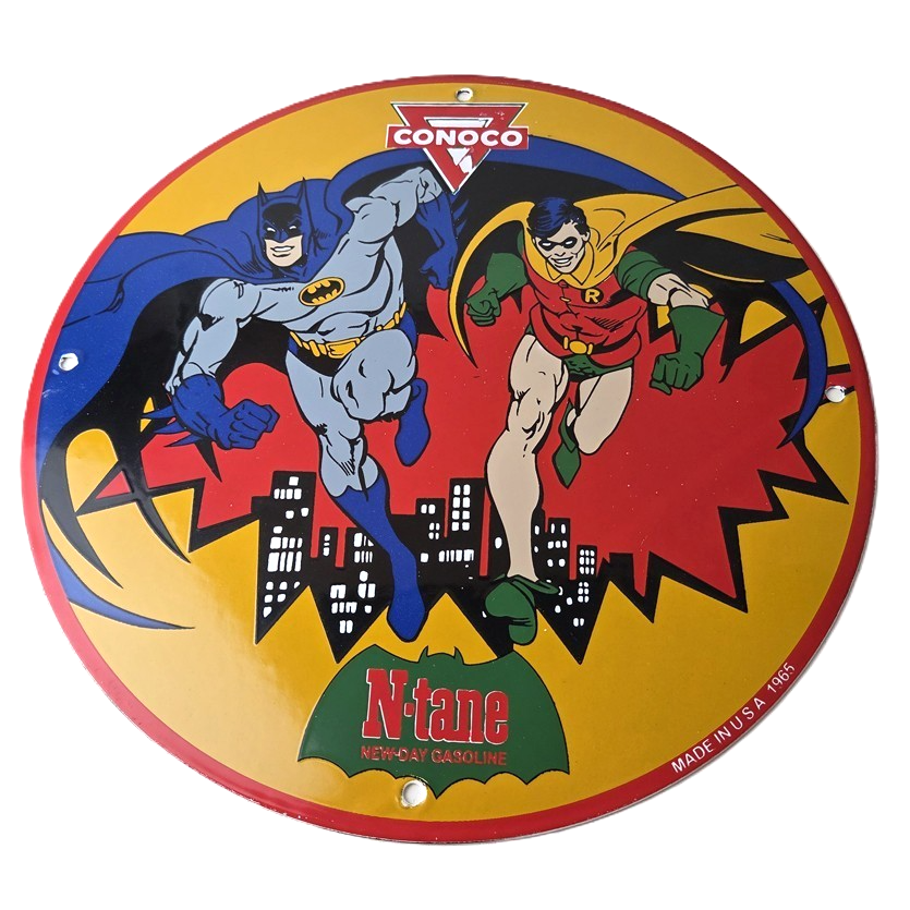 This vintage porcelain sign is a must-have for collectors and fans of Conoco Gasoline and Batman & Robin DC comics. With its vibrant colors of orange, green, blue and red, this sign is sure to catch the eye of anyone in the room. The sign features the iconic Conoco Gasoline logo and Batman & Robin characters, making it a unique and amazing addition to any collection. Whether you’re a fan of gas and oil memorabilia or a comic book enthusiast, this sign is the perfect piece to display.