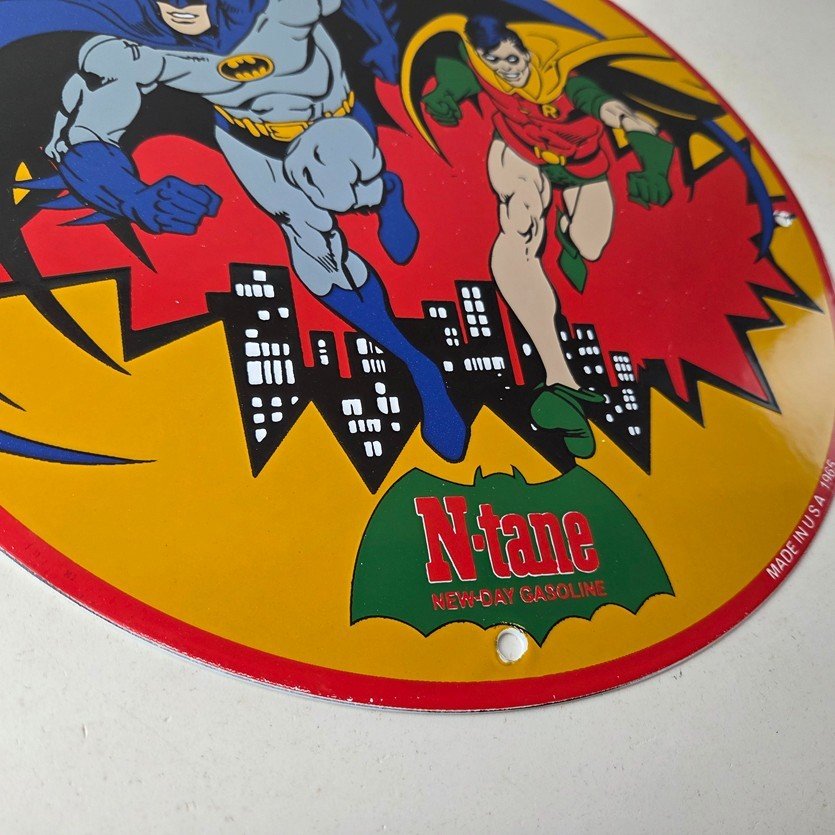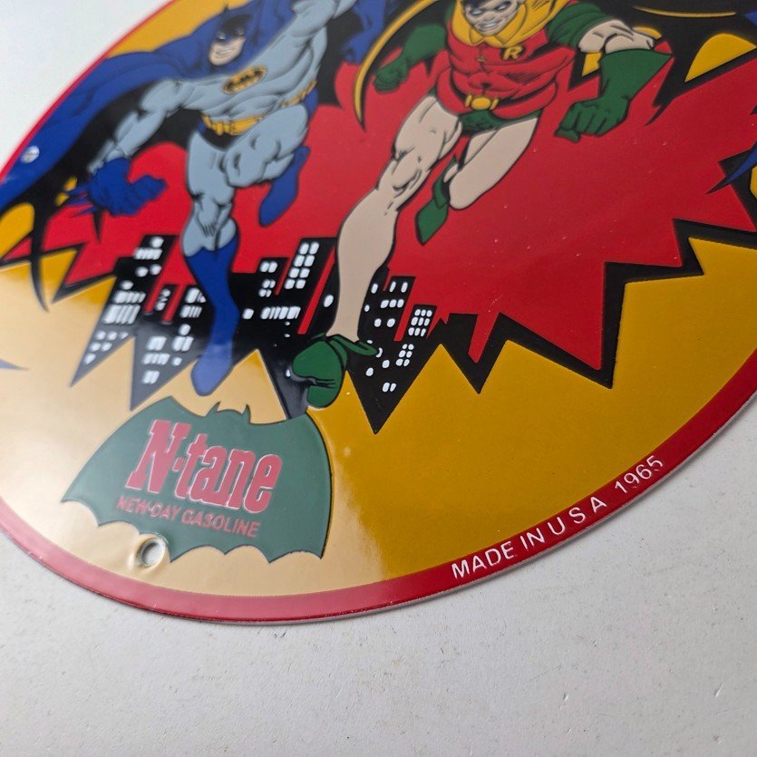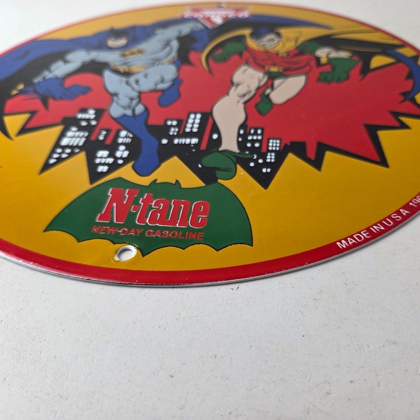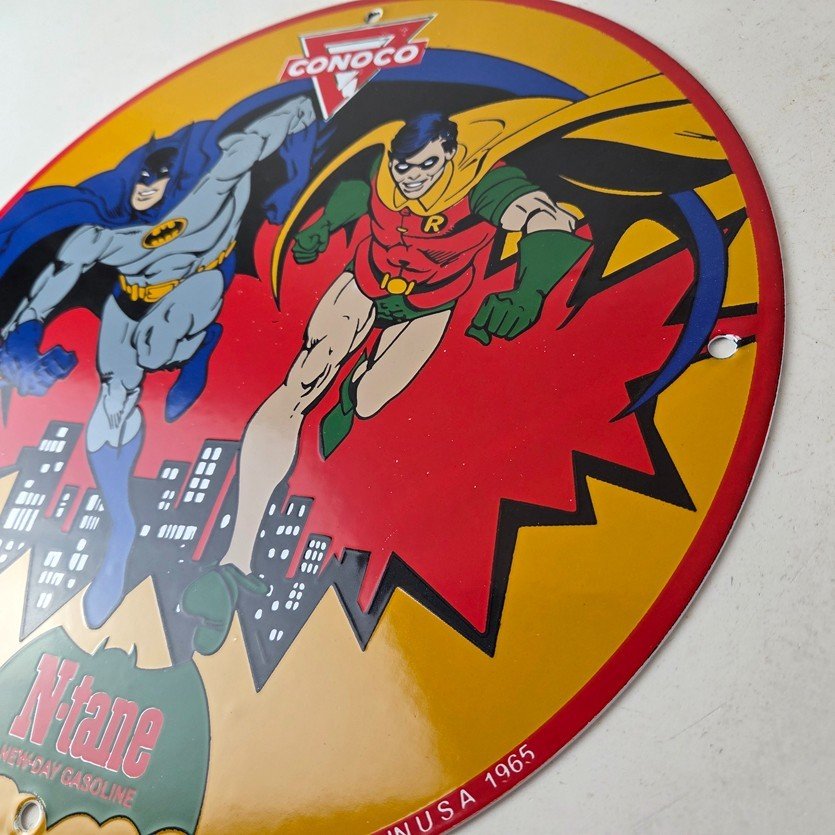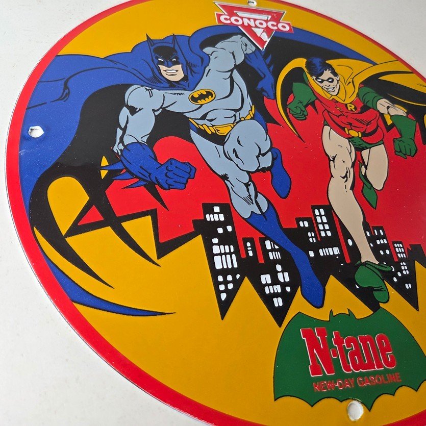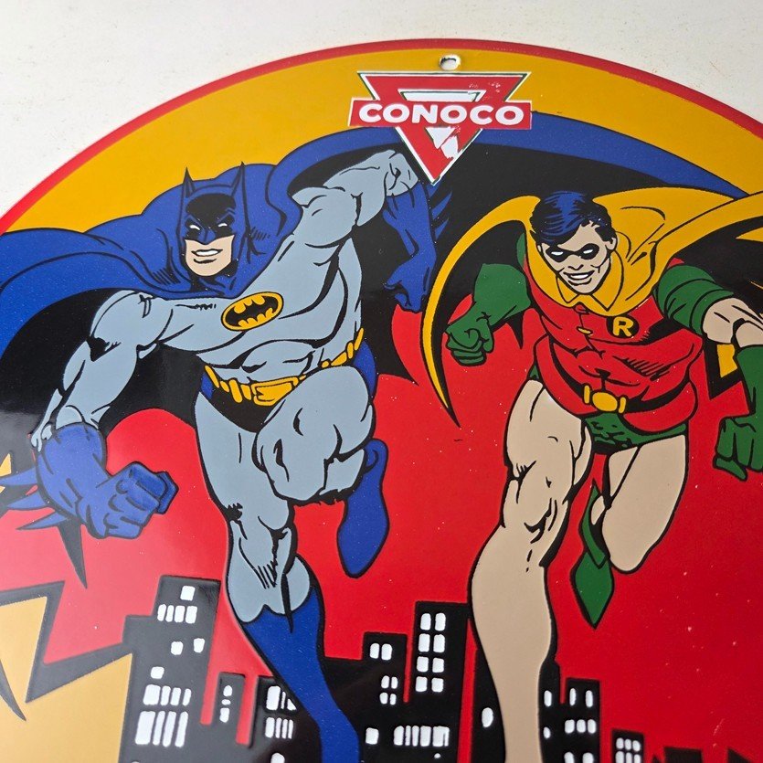 This vintage porcelain sign is a must-have for collectors and fans of Conoco Gasoline and Batman & Robin DC comics. With its vibrant colors of orange, green, blue and red, this sign is sure to catch the eye of anyone in the room. The sign features the iconic Conoco Gasoline logo and Batman & Robin characters, making it a unique and amazing addition to any collection. Whether you’re a fan of gas and oil memorabilia or a comic book enthusiast, this sign is the perfect piece to display.